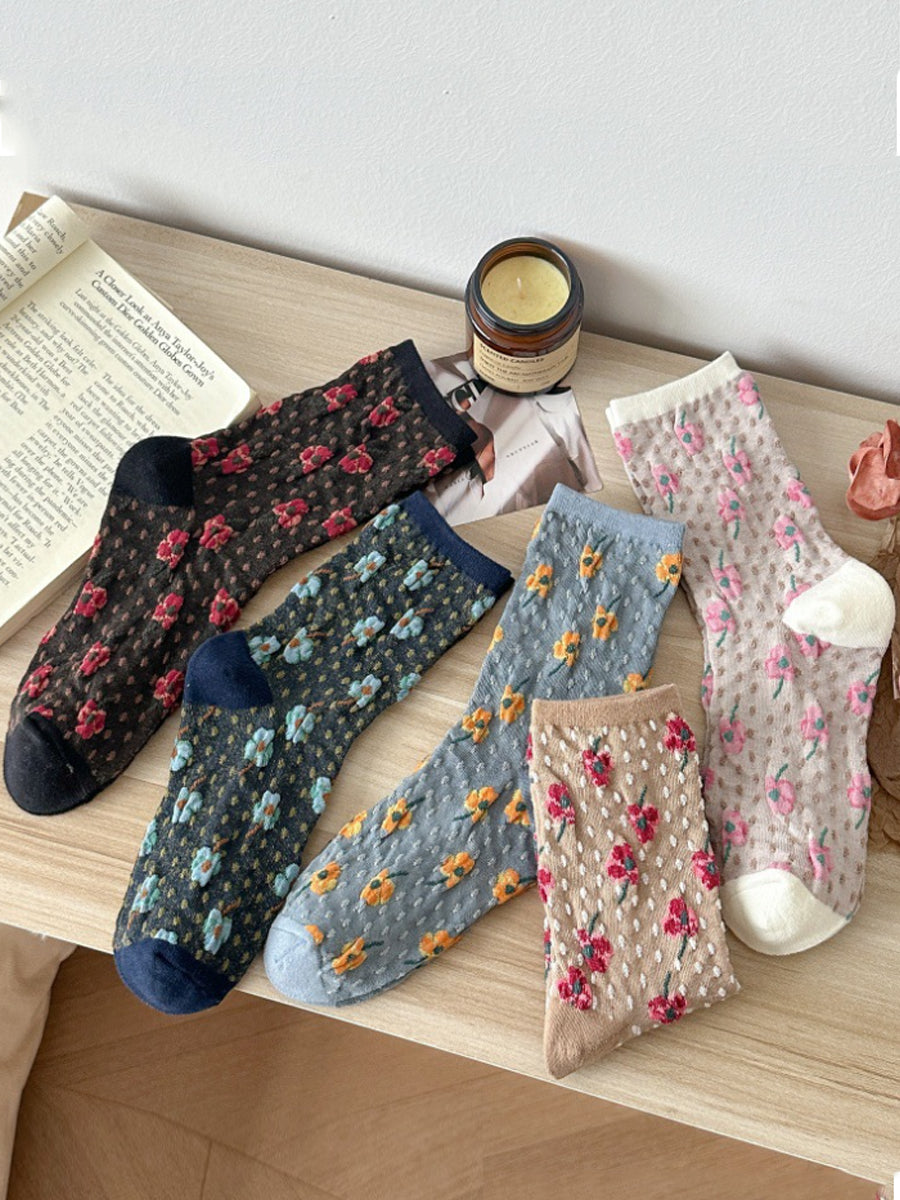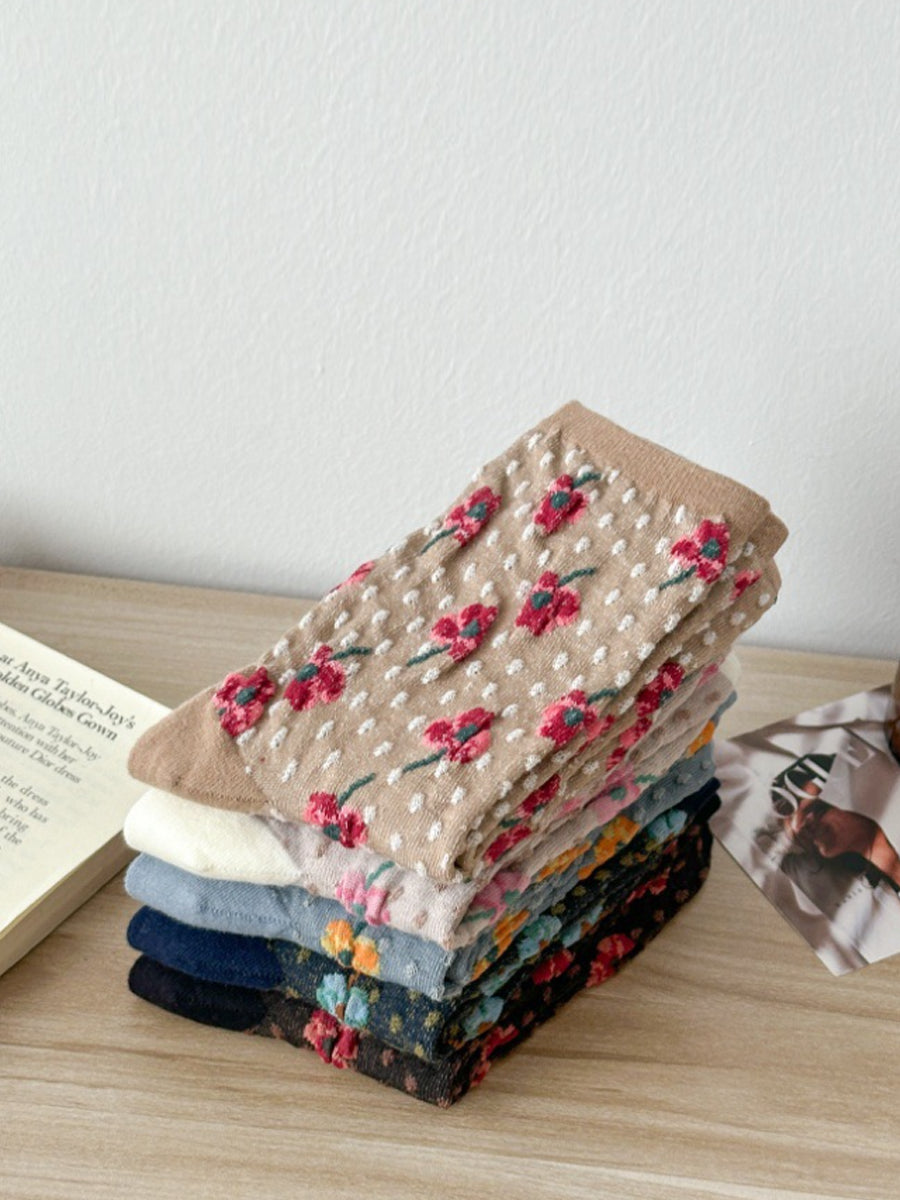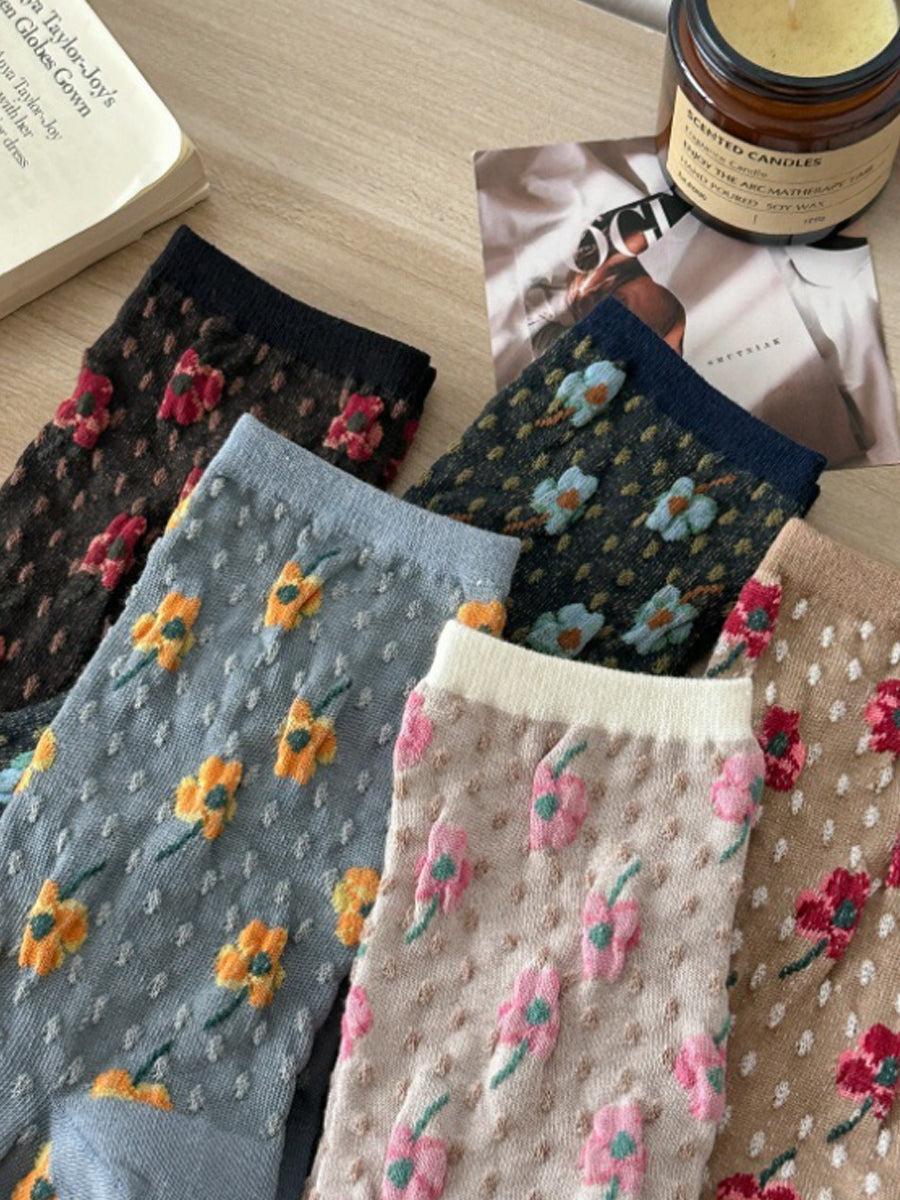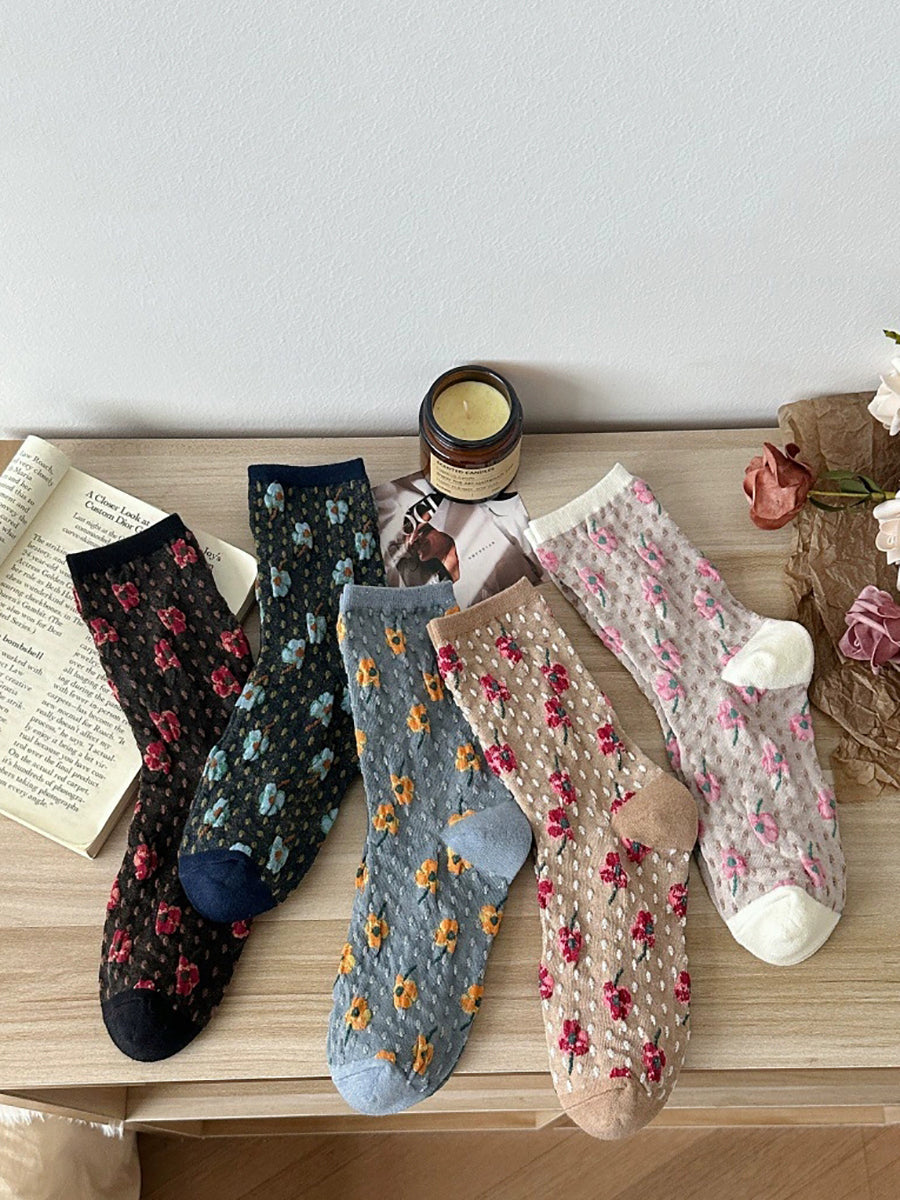5 par damesokker med kunstnerisk blomsterprint og bomuld
