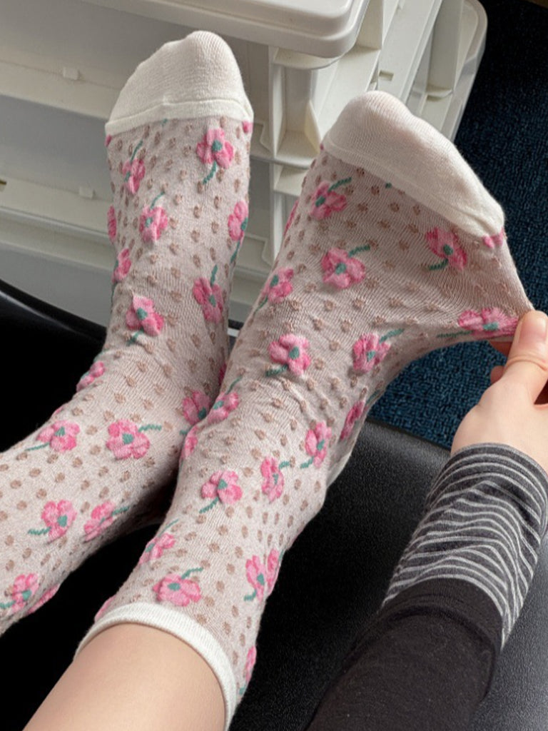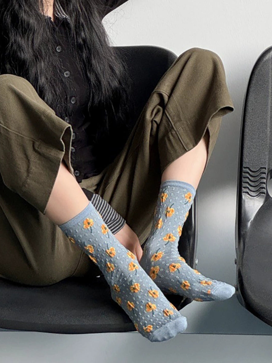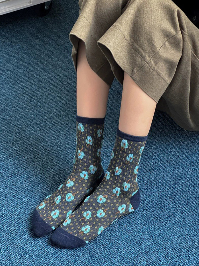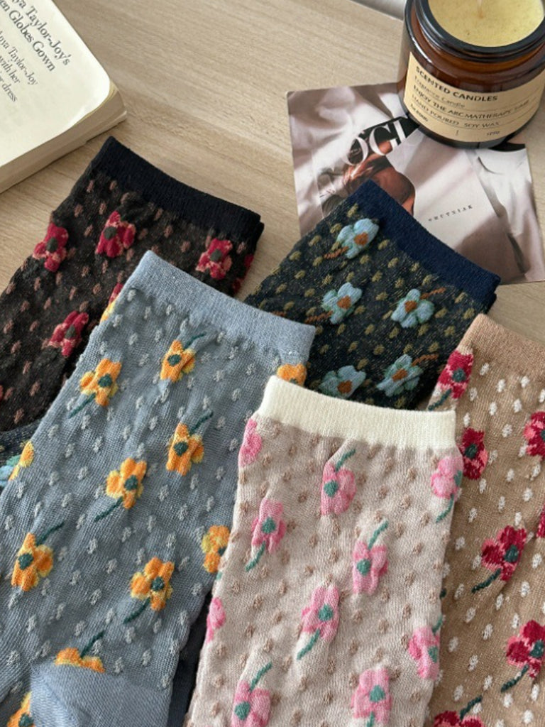 5 par damesokker med kunstnerisk blomsterprint og bomuld