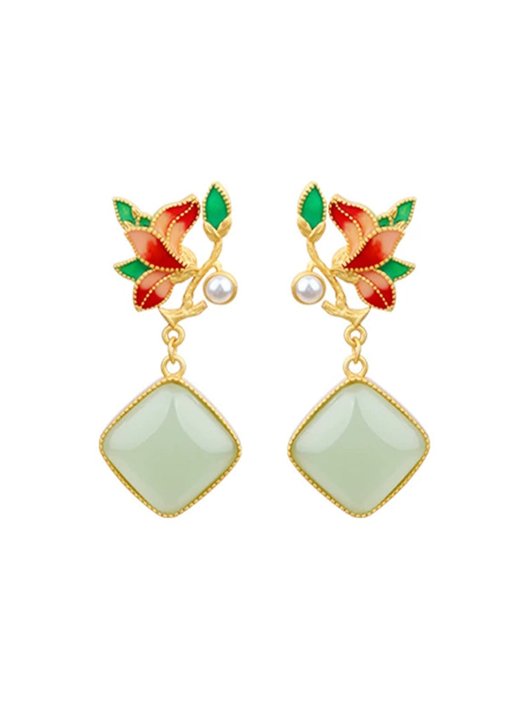 Kvinder Vintage Blomster Emalje S925 Sølv Jade Øreringe