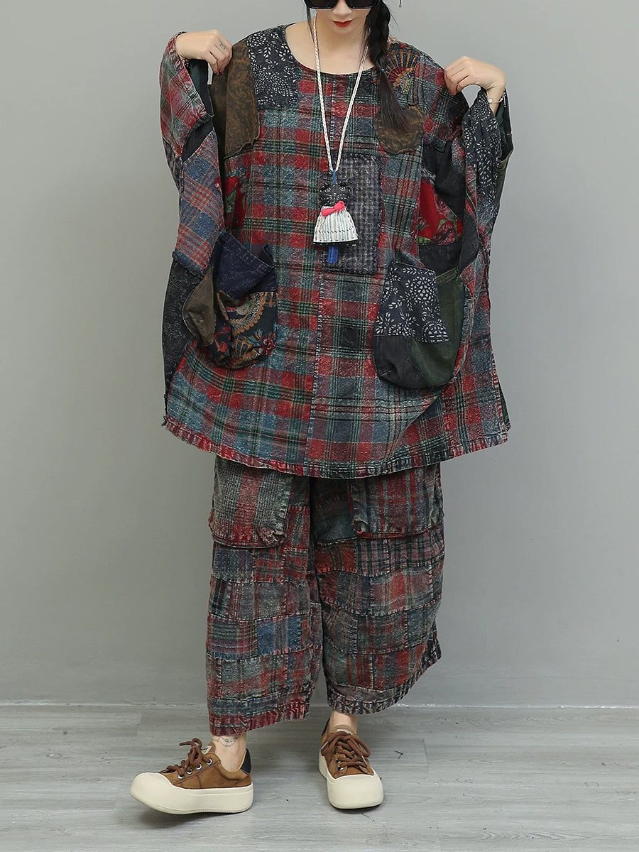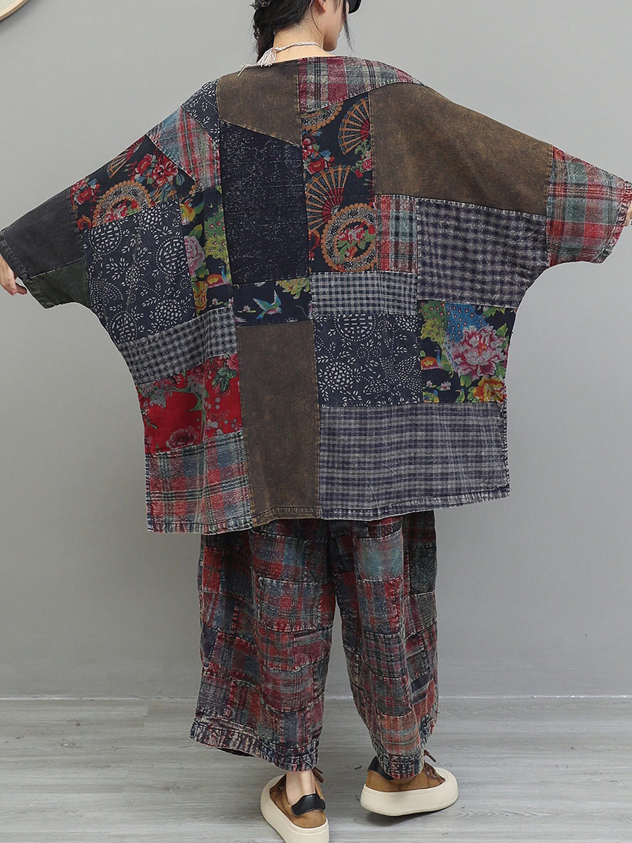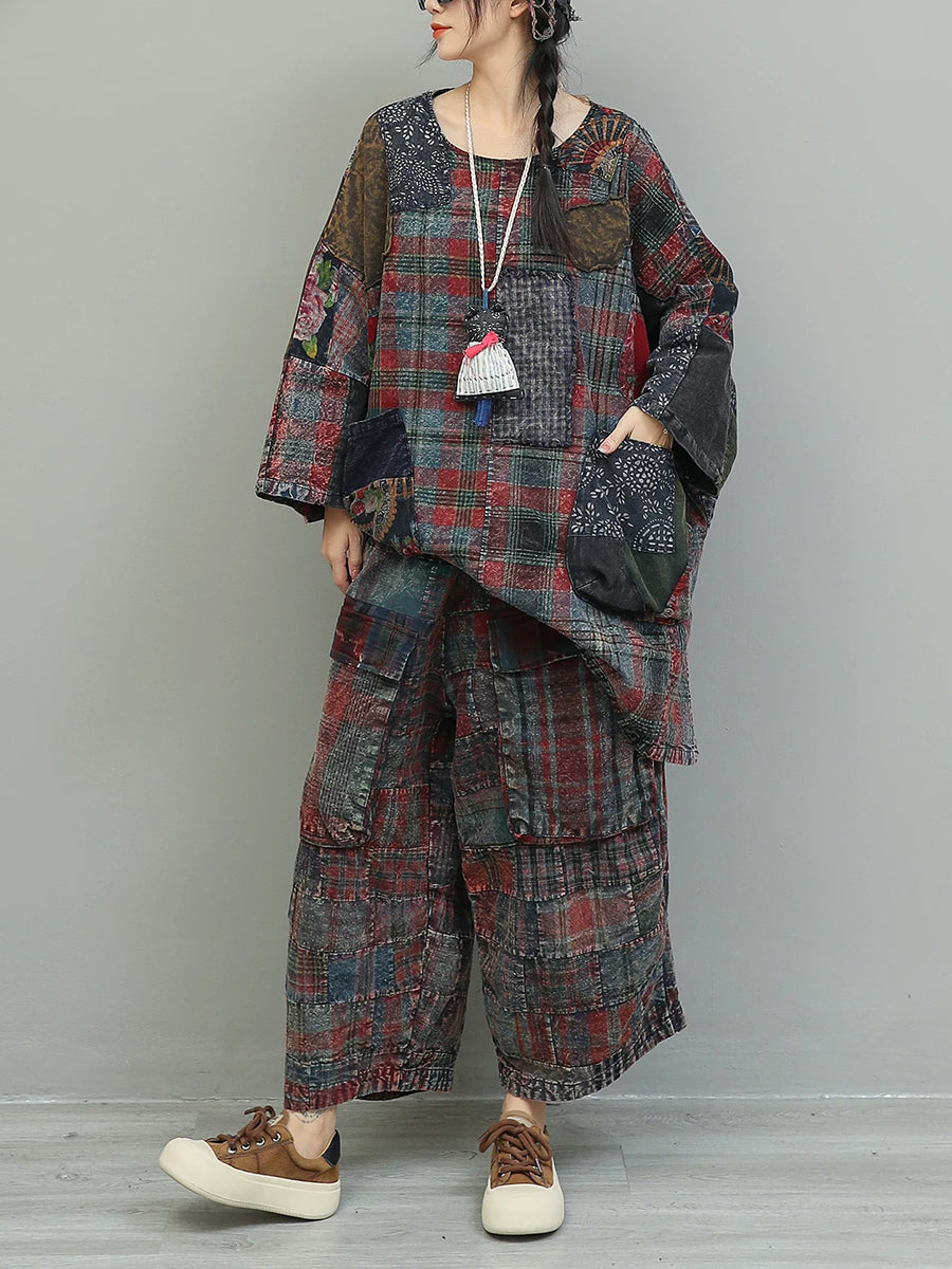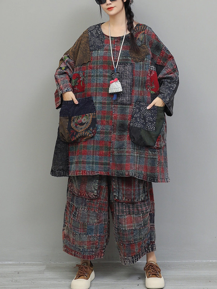 Kvinder Vinter Retro Patchwork O-hals Jakkesæt