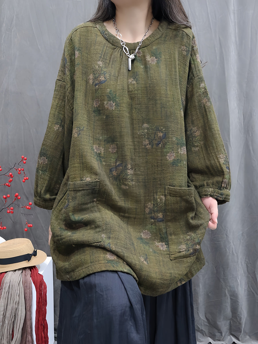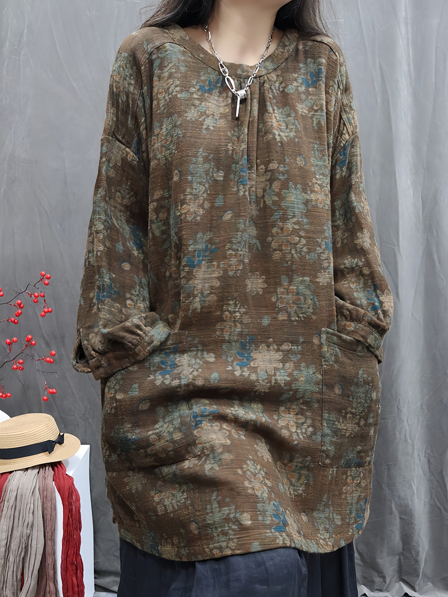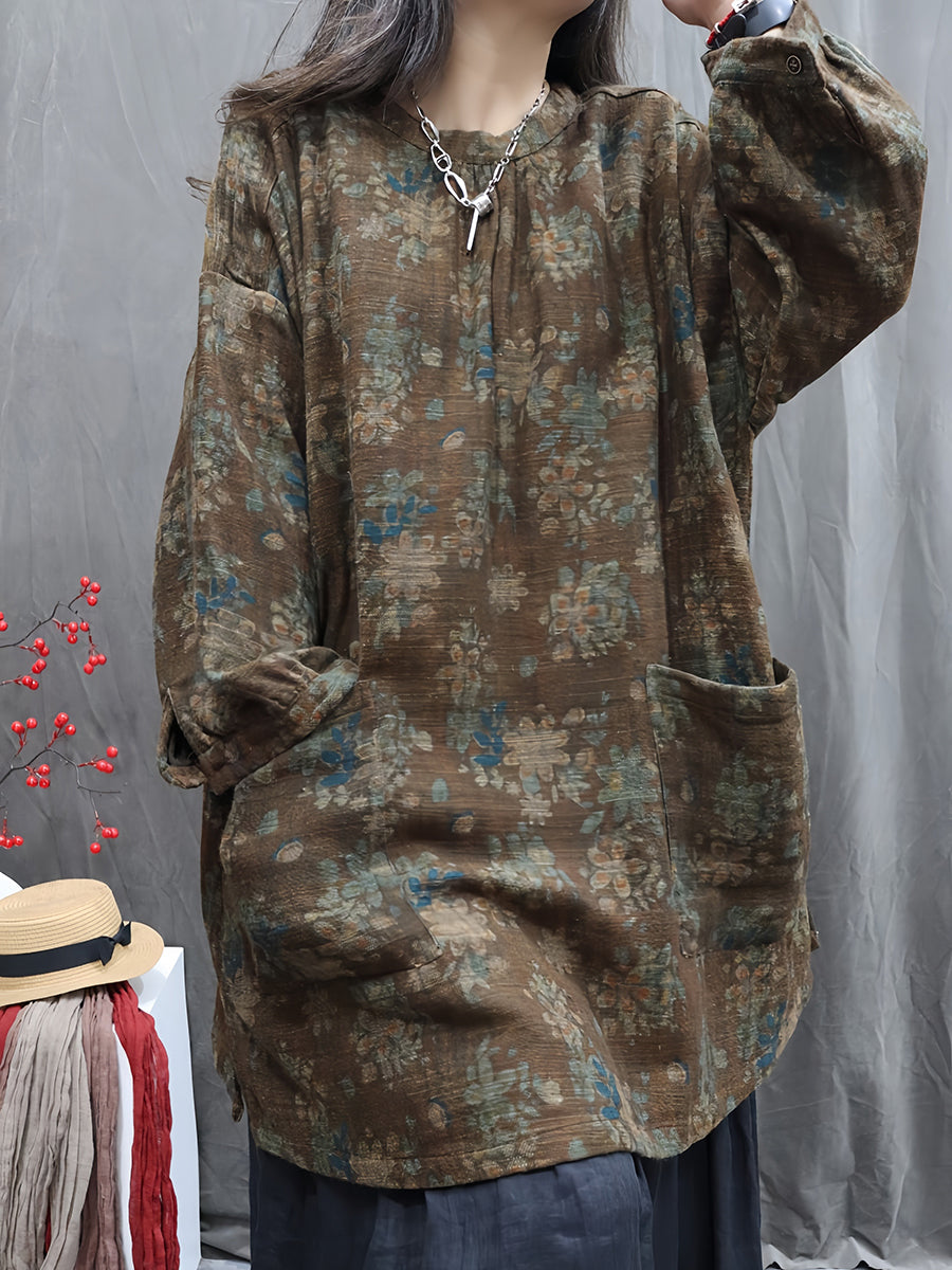 Kunstnerisk efterårsblomst O-hals bluse til kvinder i 100% hør