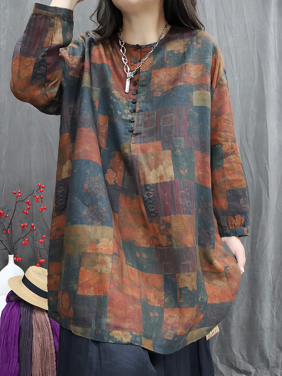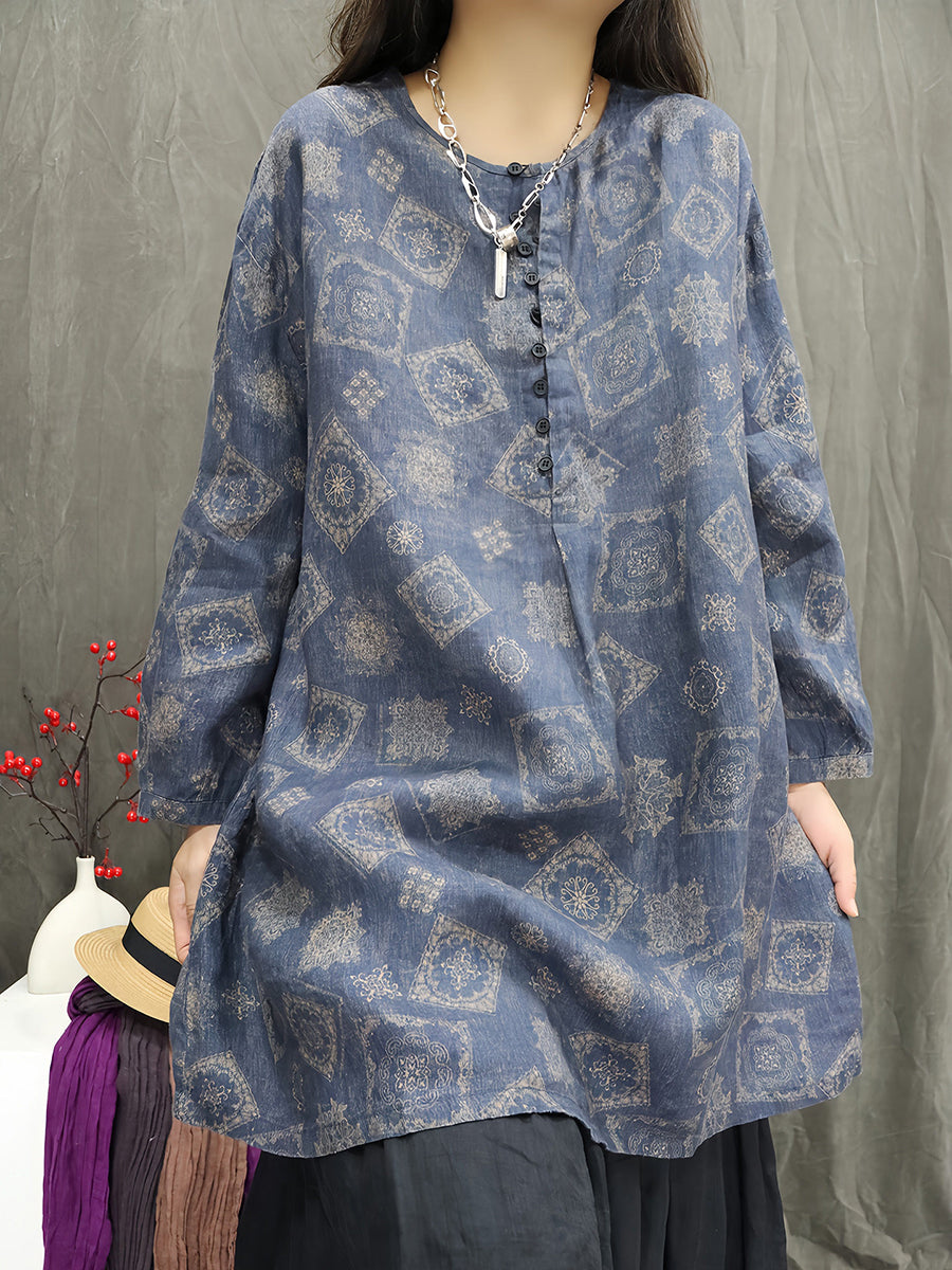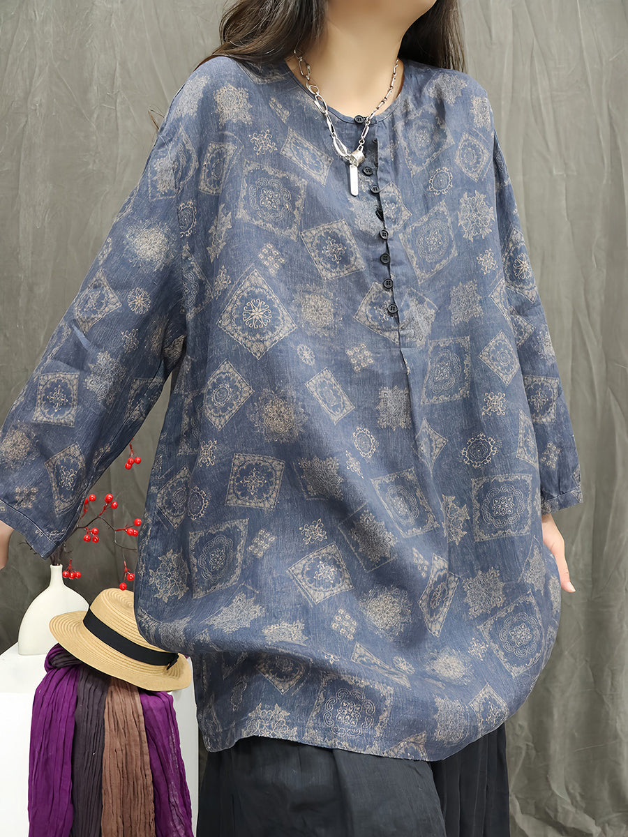 Kunstnerisk forårsbluse med blomsterprint og O-hals til kvinder i 100% hør