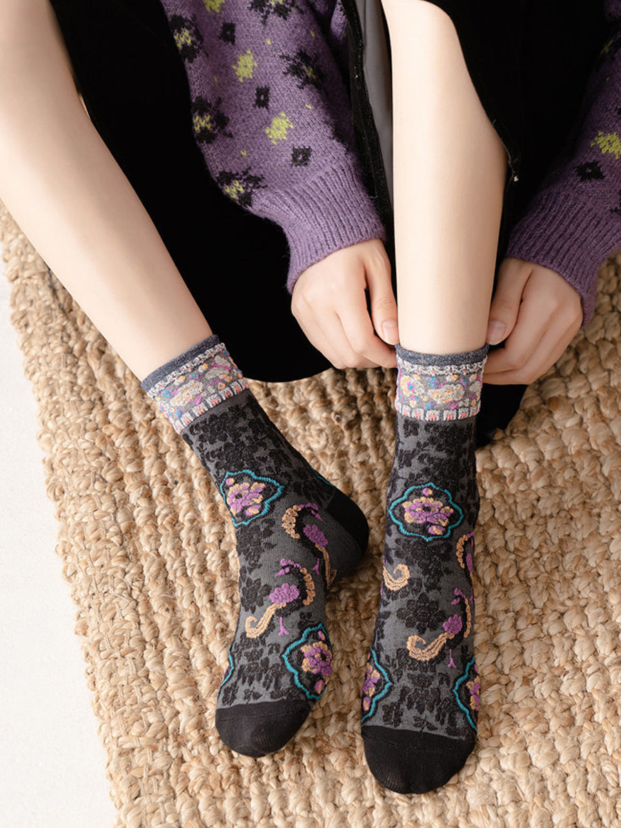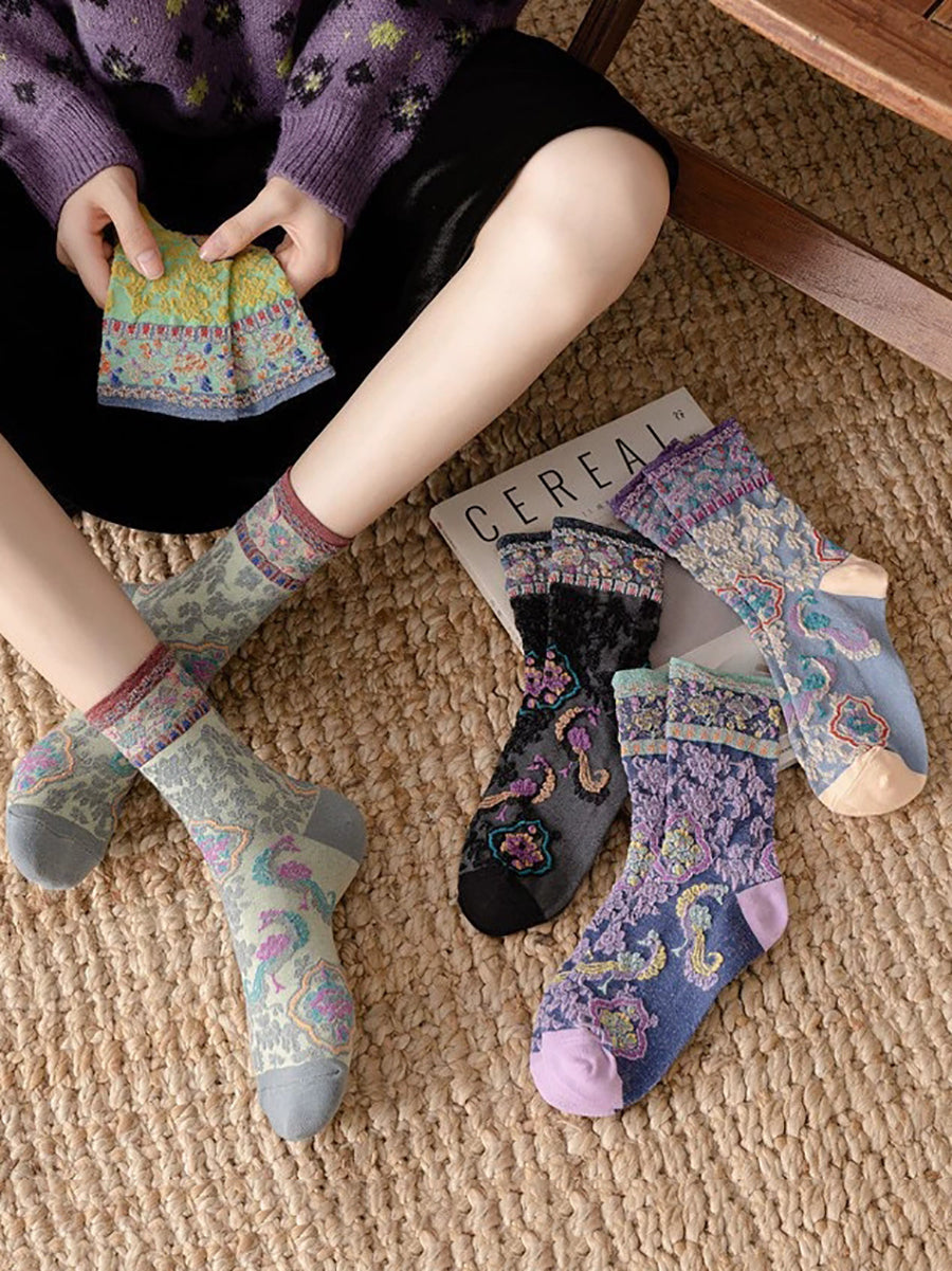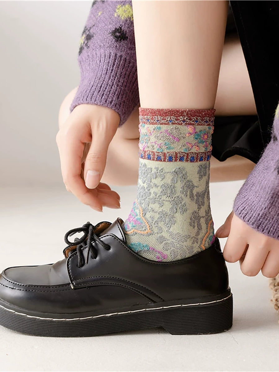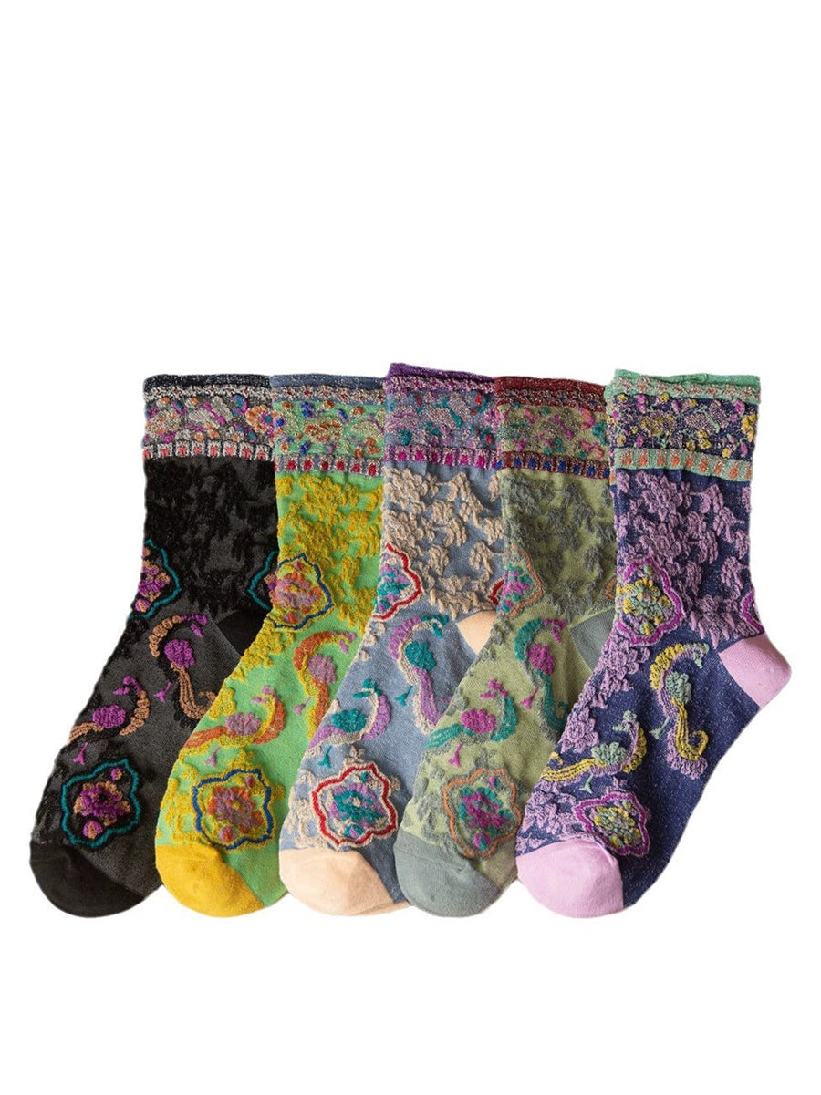 5 par damestrømper med vintage blomsterprint og jacquardmotiv