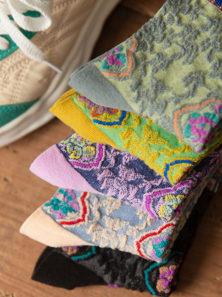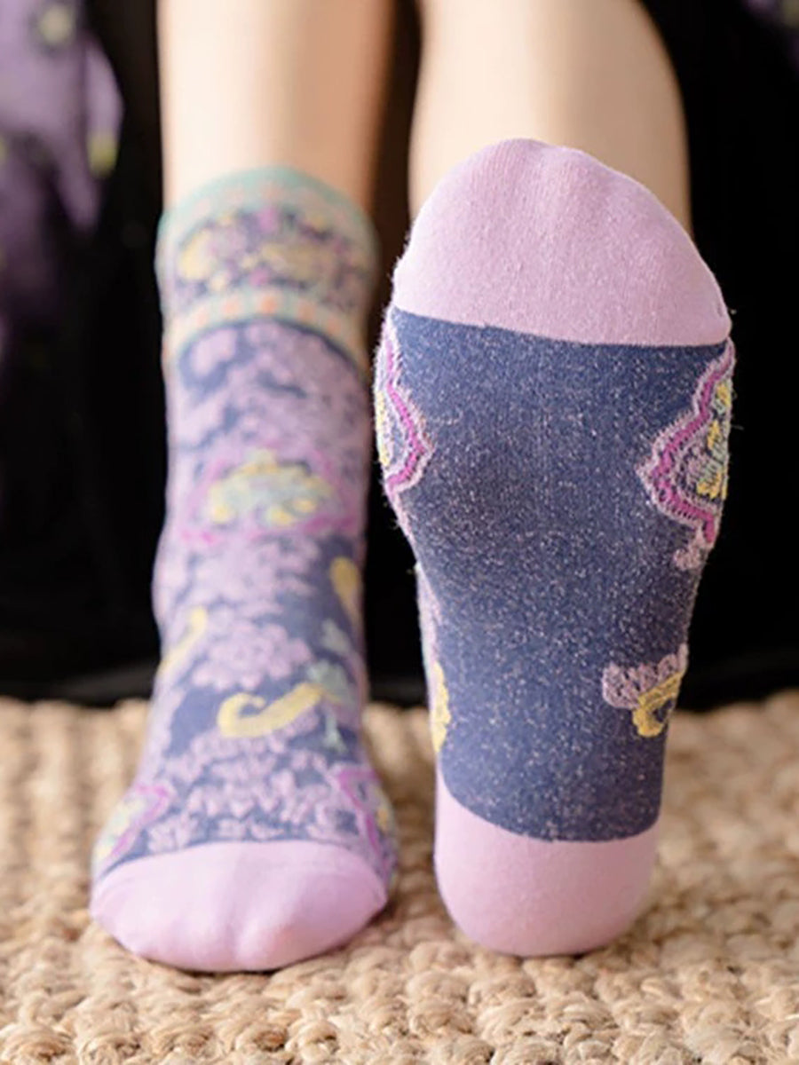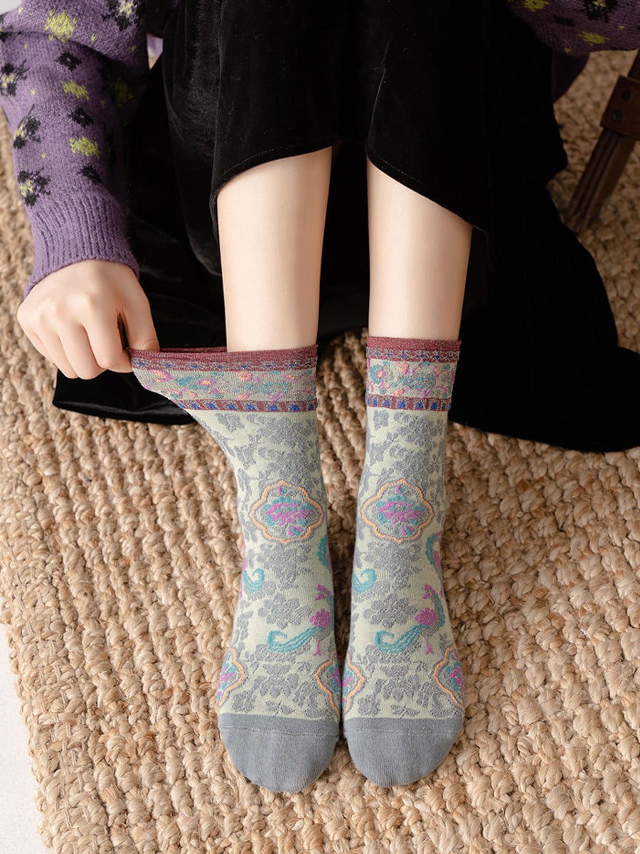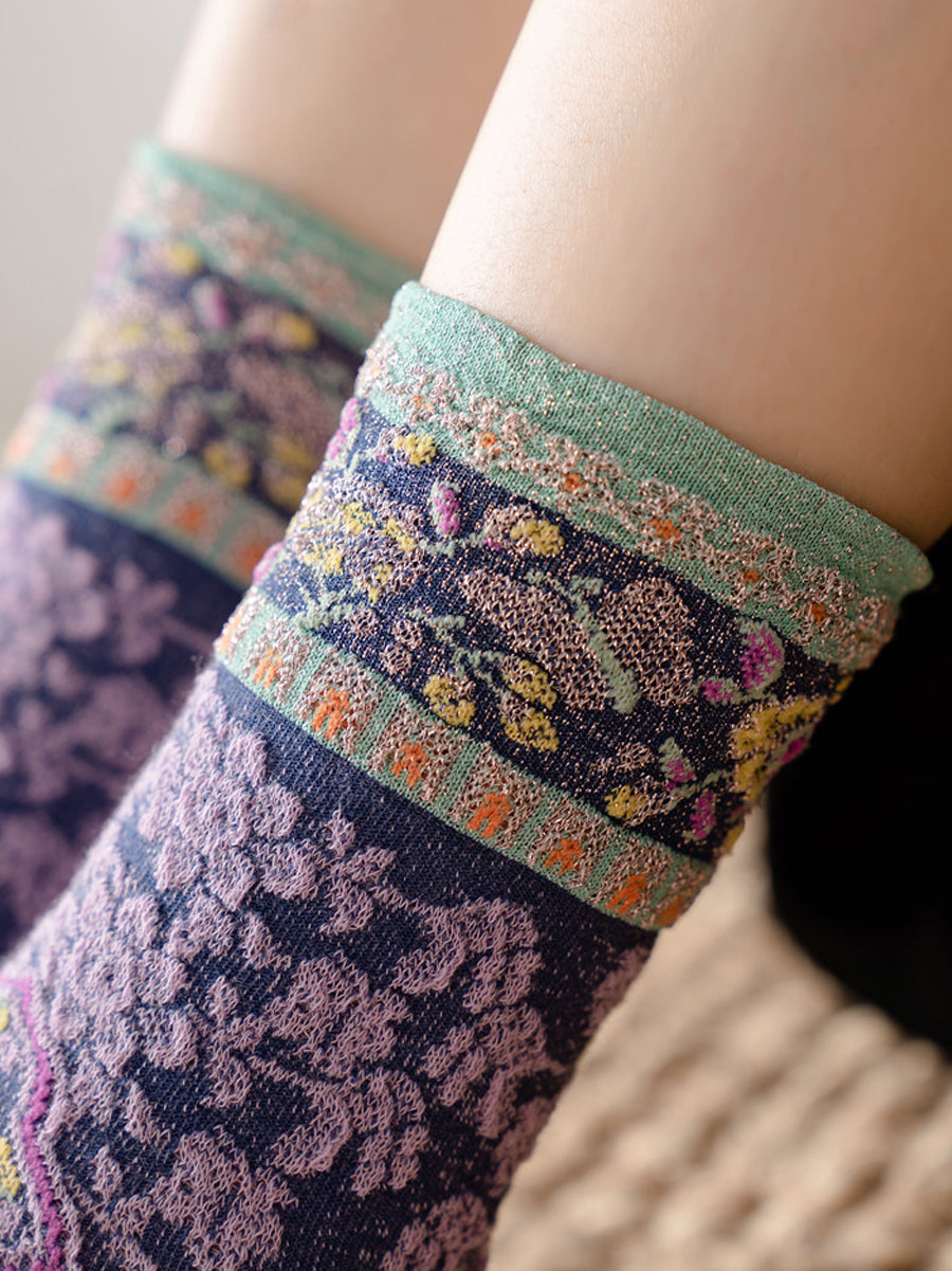 5 par damestrømper med vintage blomsterprint og jacquardmotiv
