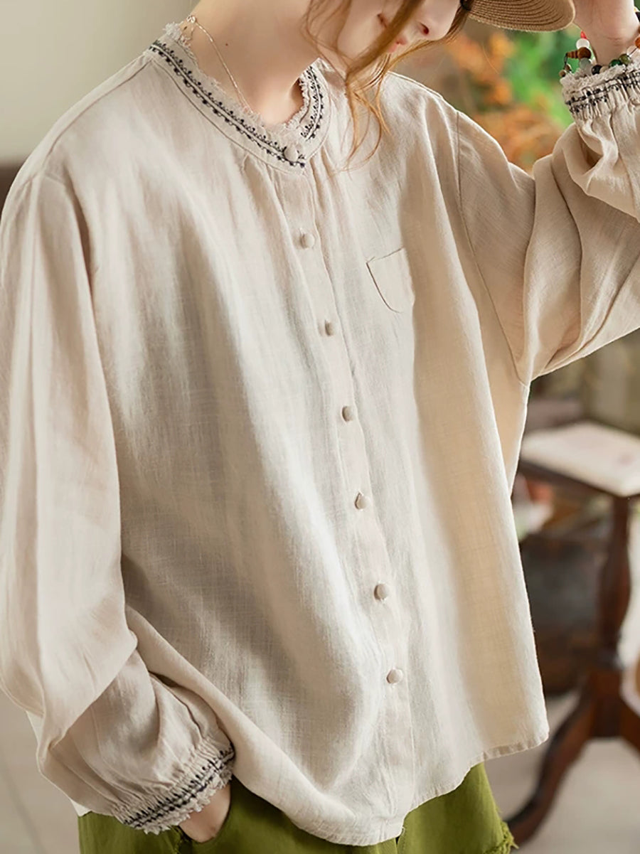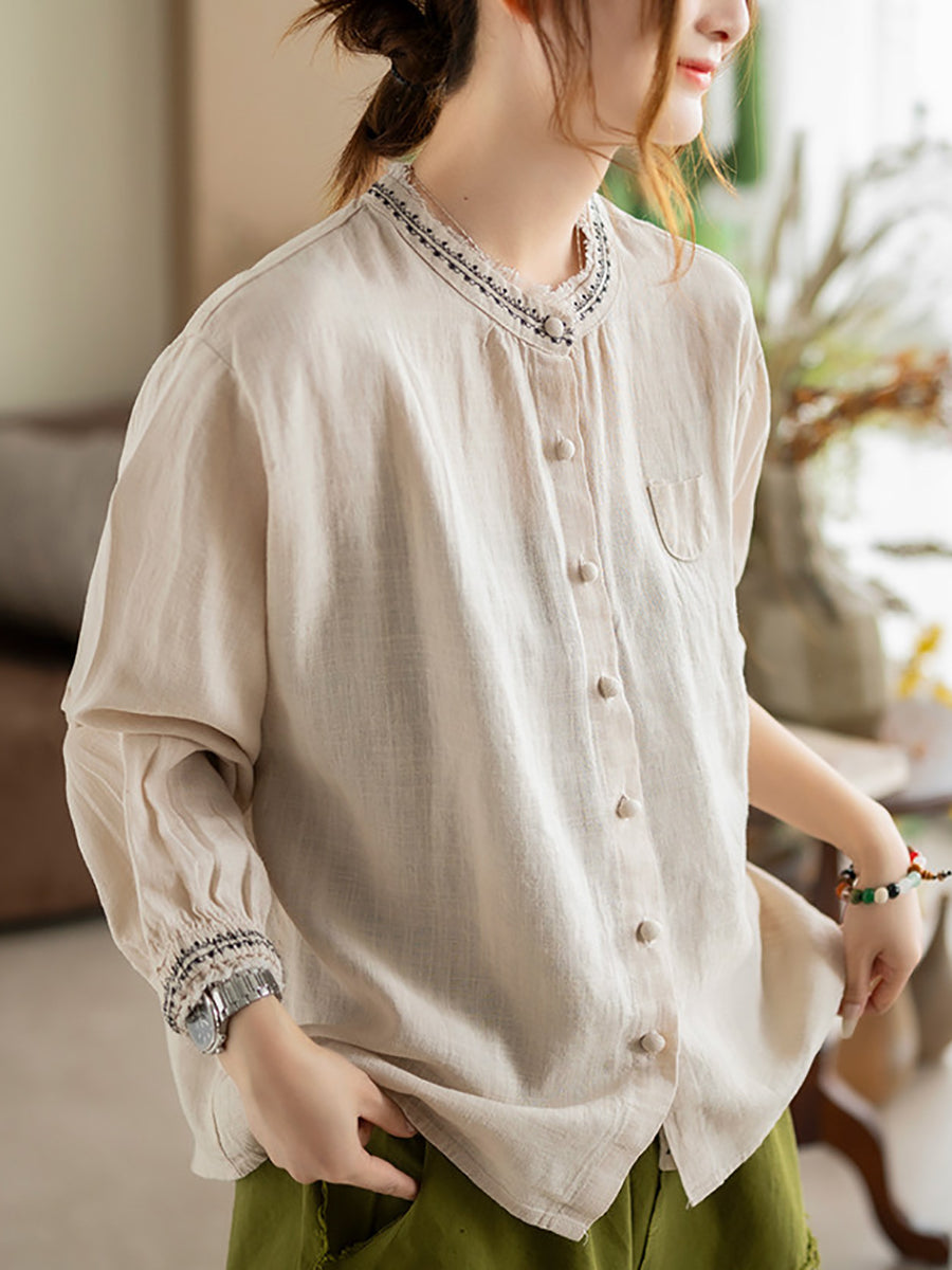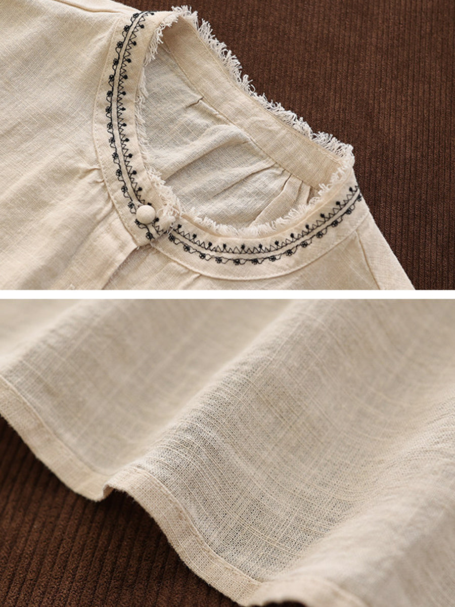 Kunstnerisk sommerbluse med broderi og O-hals til kvinder i ramie