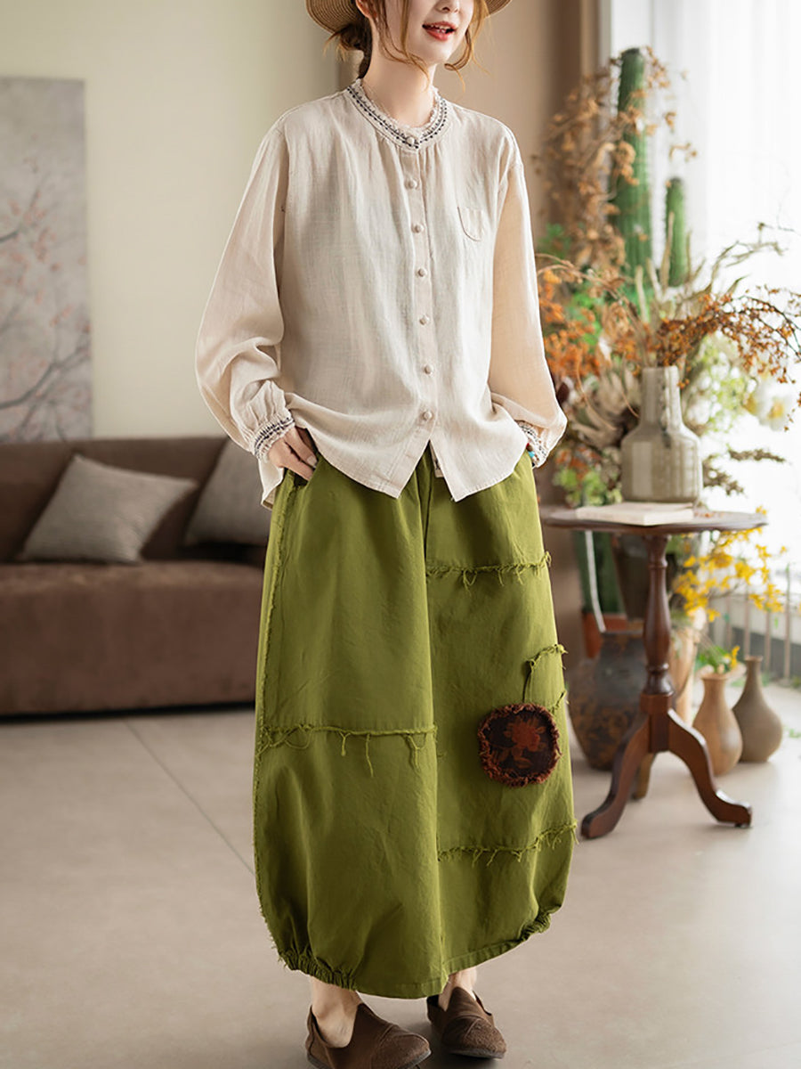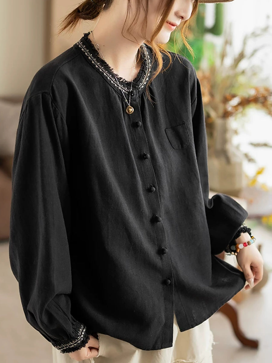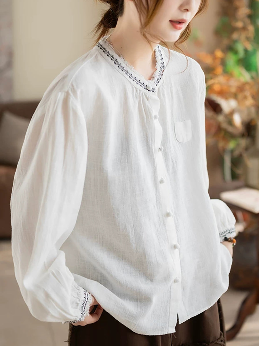 Kunstnerisk sommerbluse med broderi og O-hals til kvinder i ramie