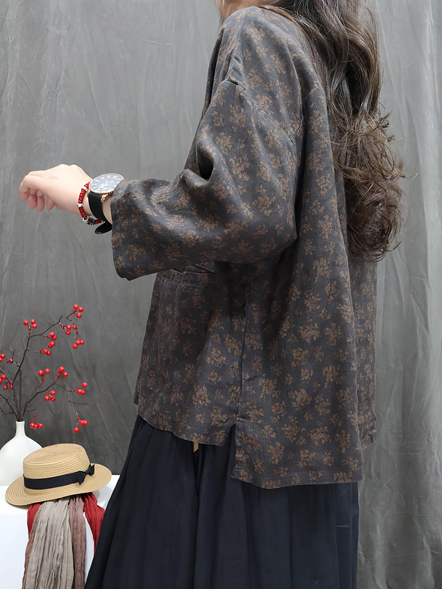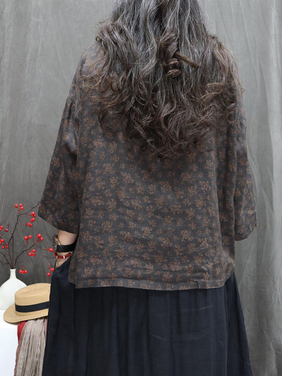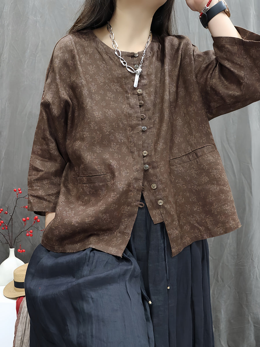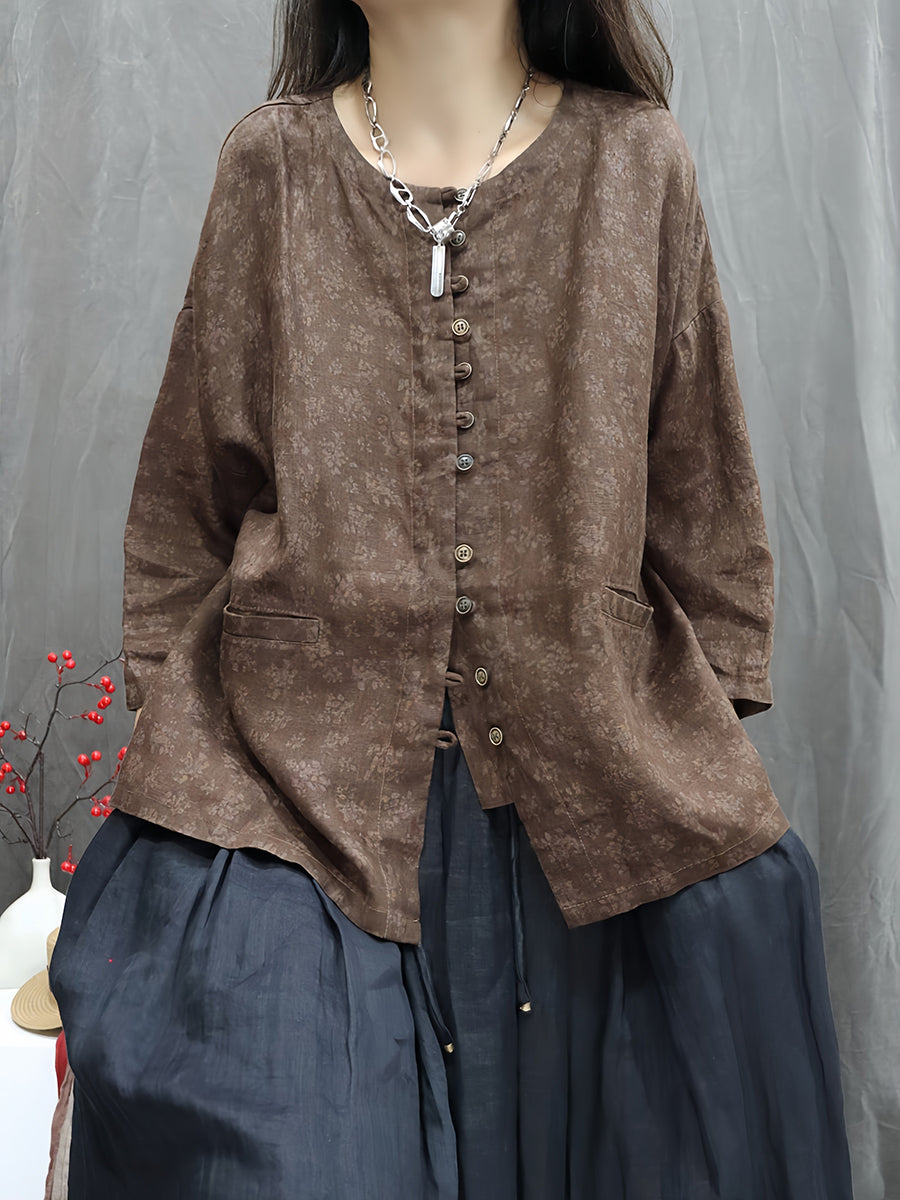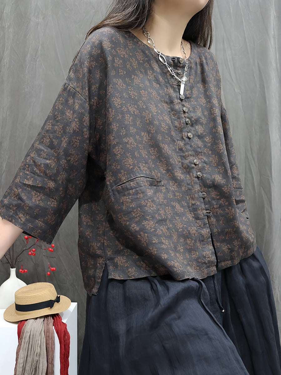 Kunstnerisk forårsskjorte med blomsterprint og O-hals i 100% hør til kvinder