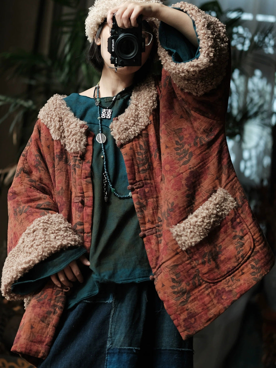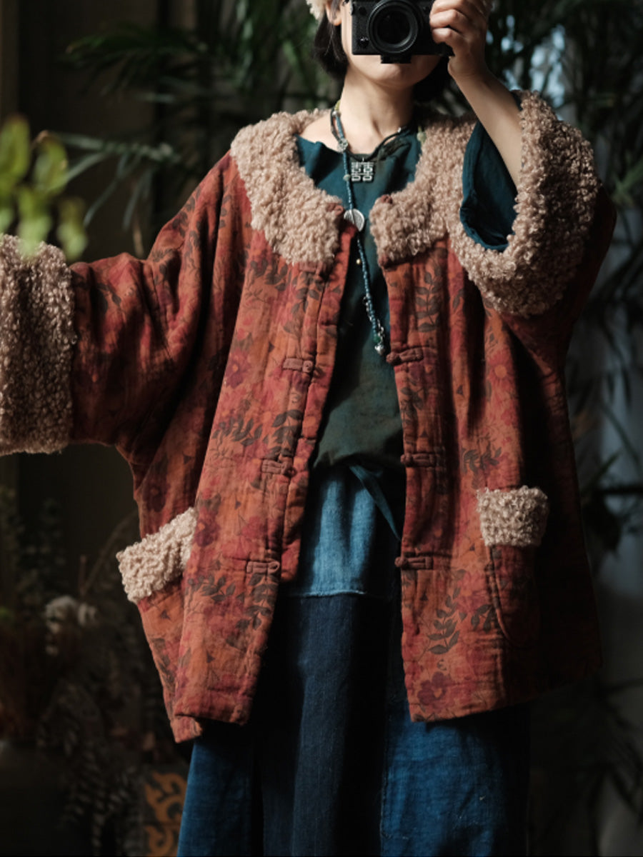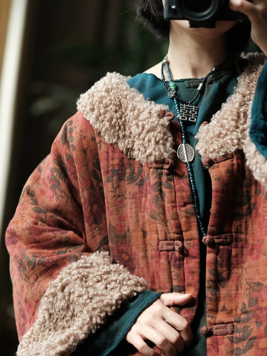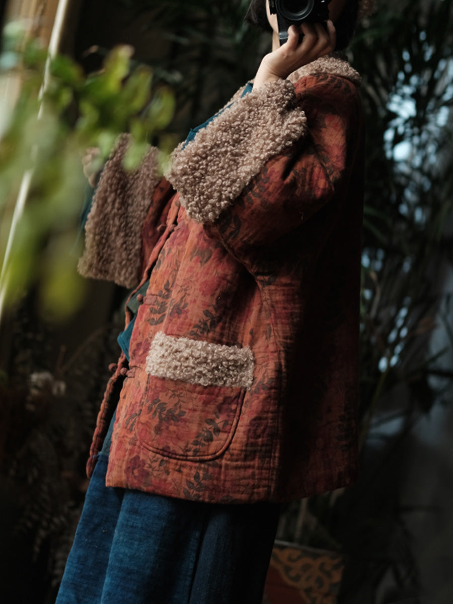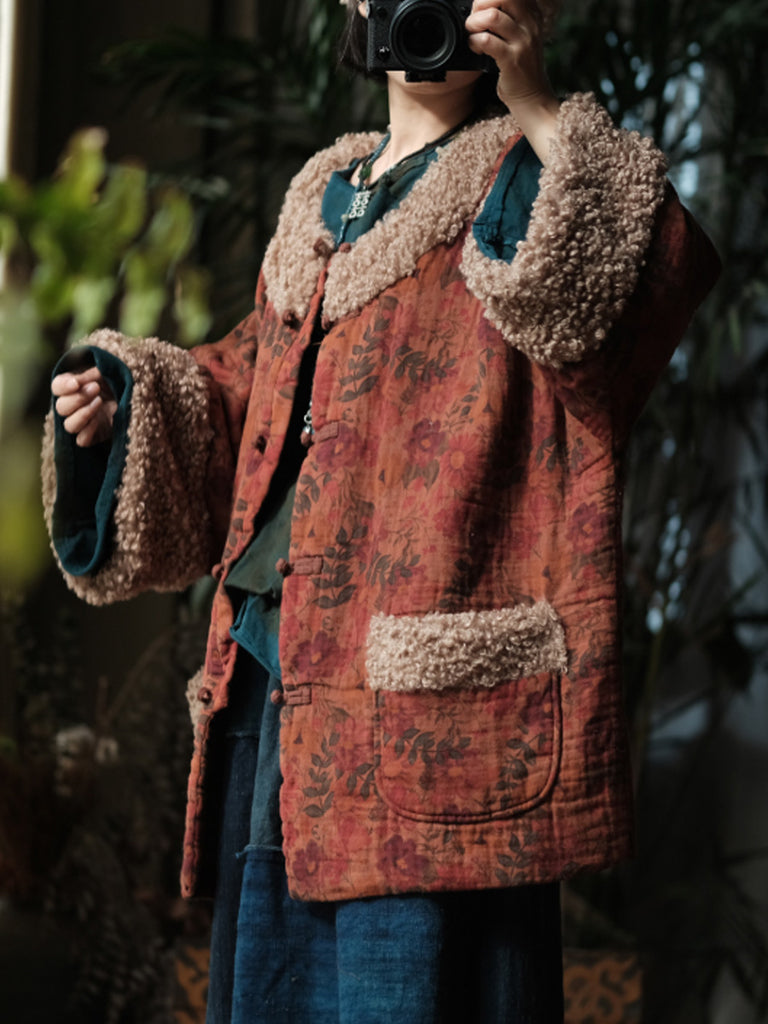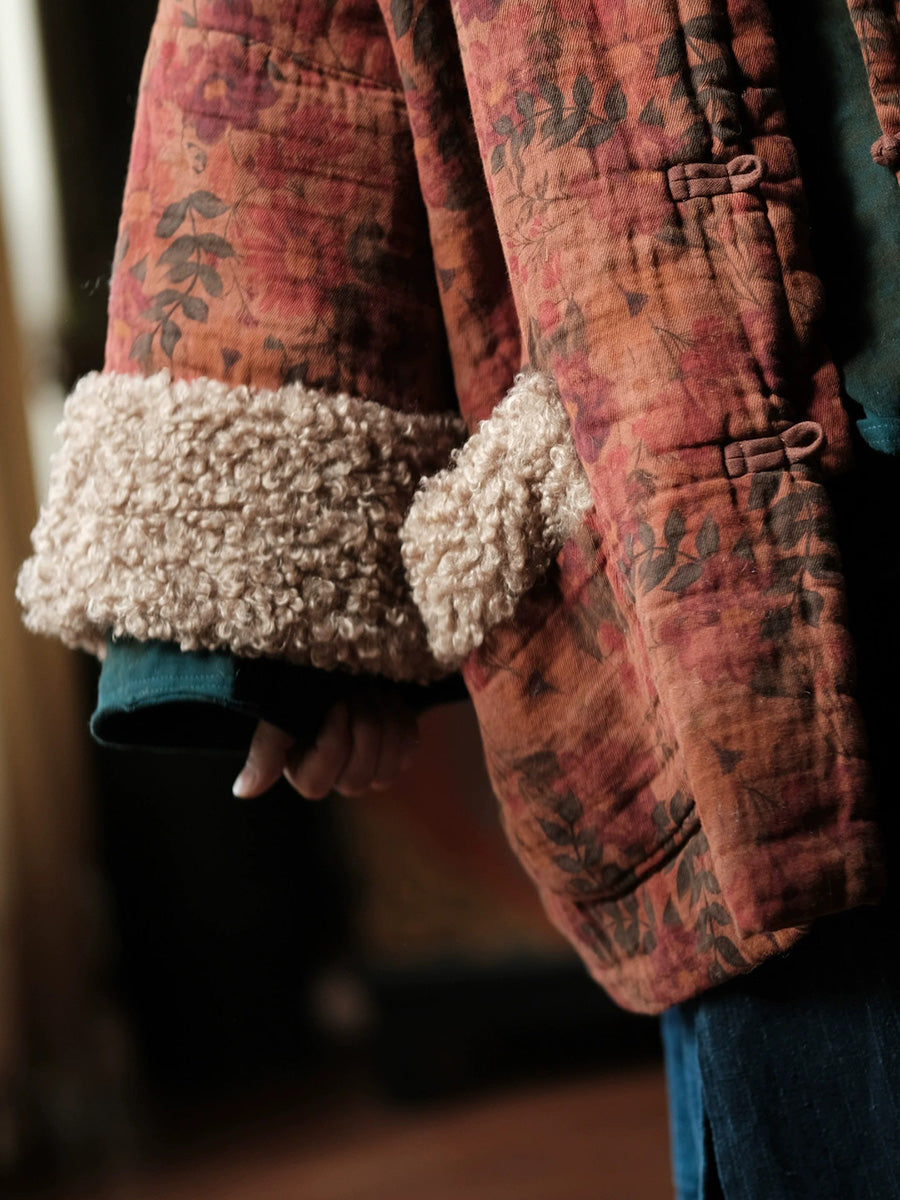 Kvinder Vintage Vinter Blomster Fleece Spliced Bomuld O-Hals Frakke