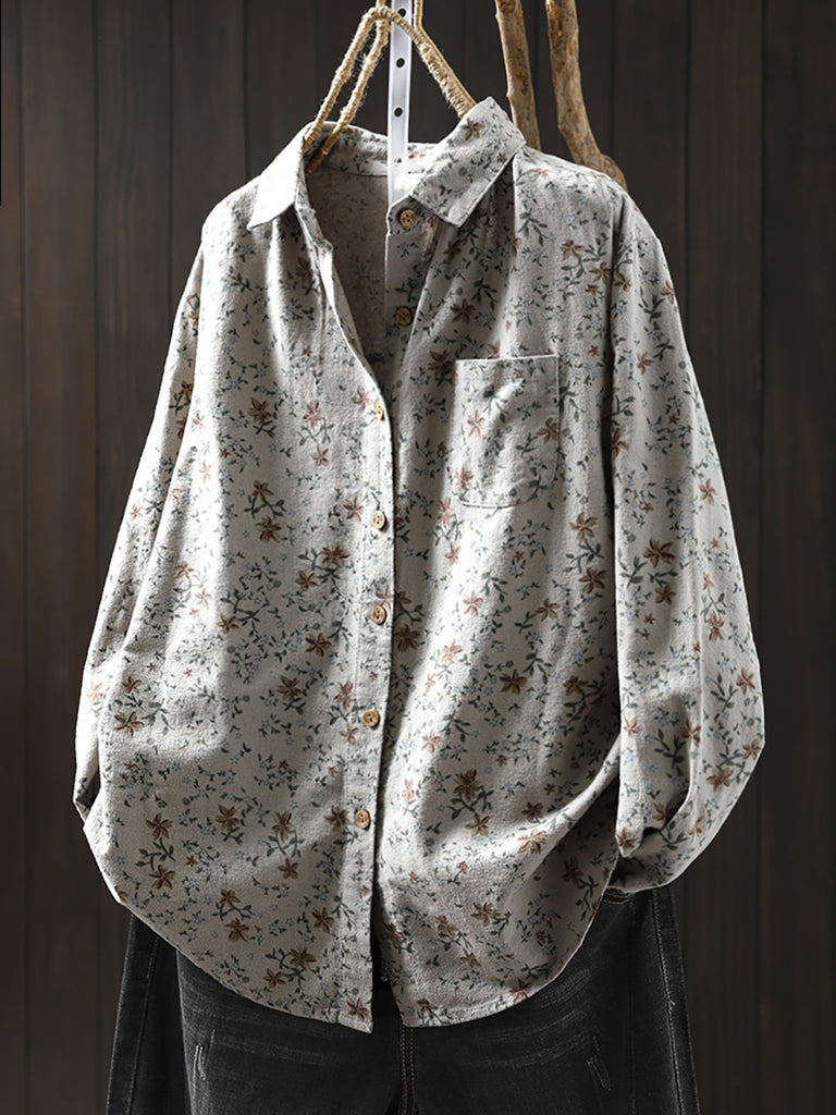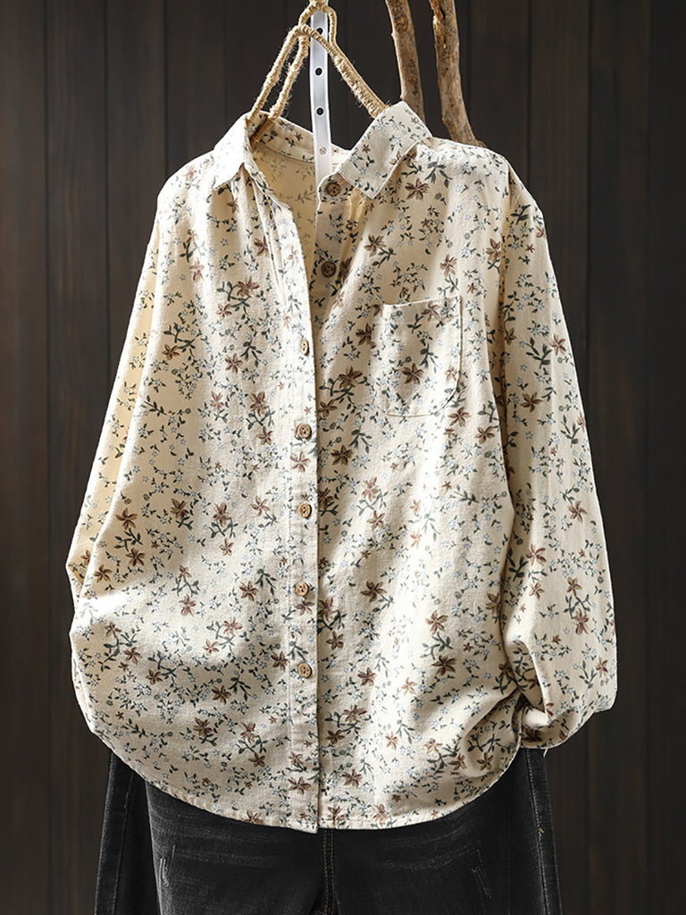 Dame vinterskjorte med kunstnerisk nedadgående krave og blomsterprint i 100% bomuld