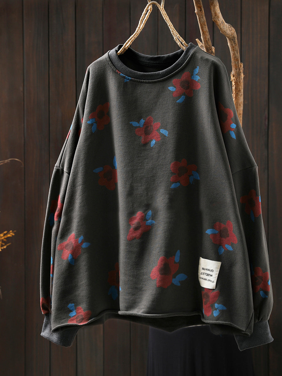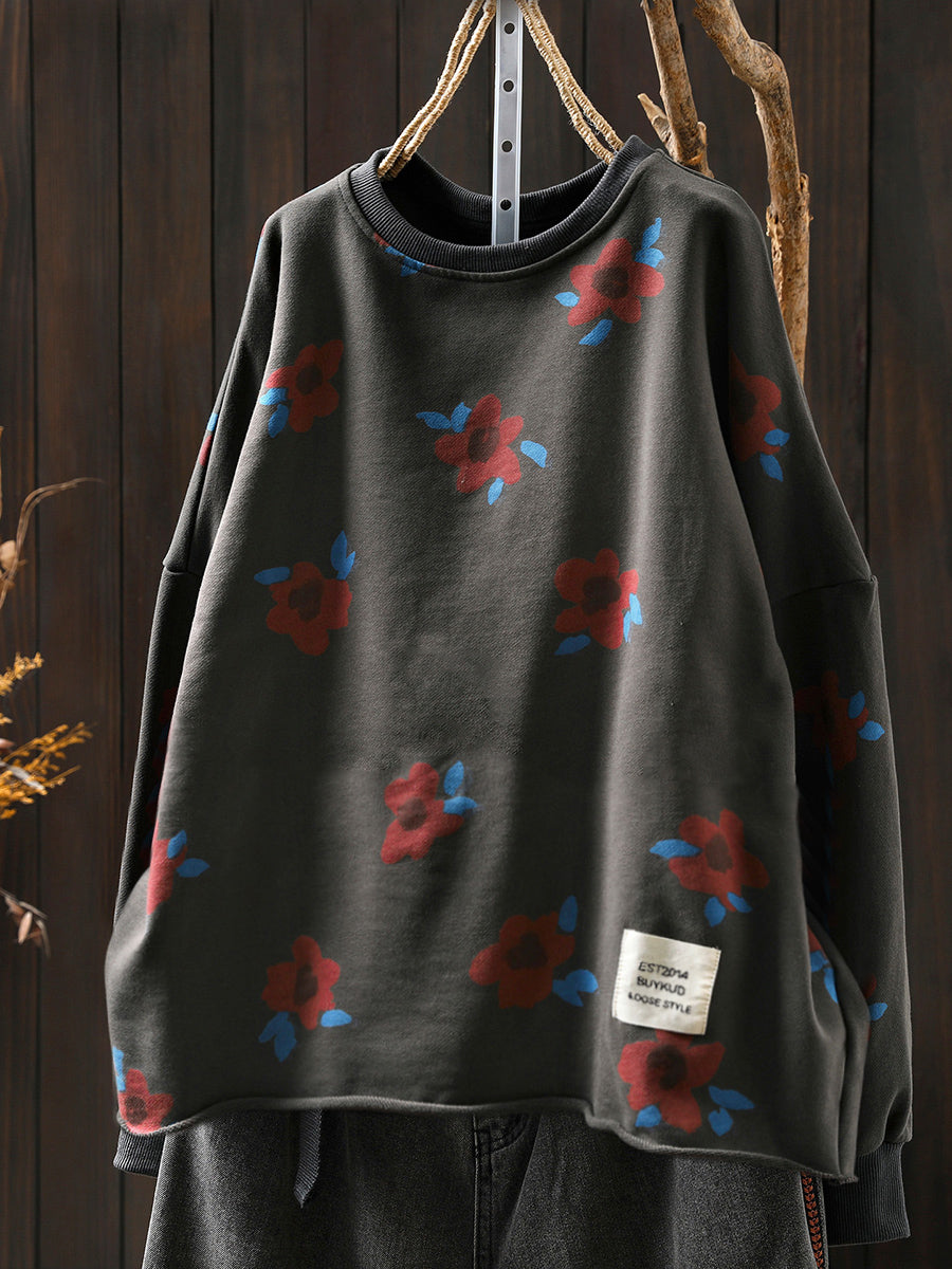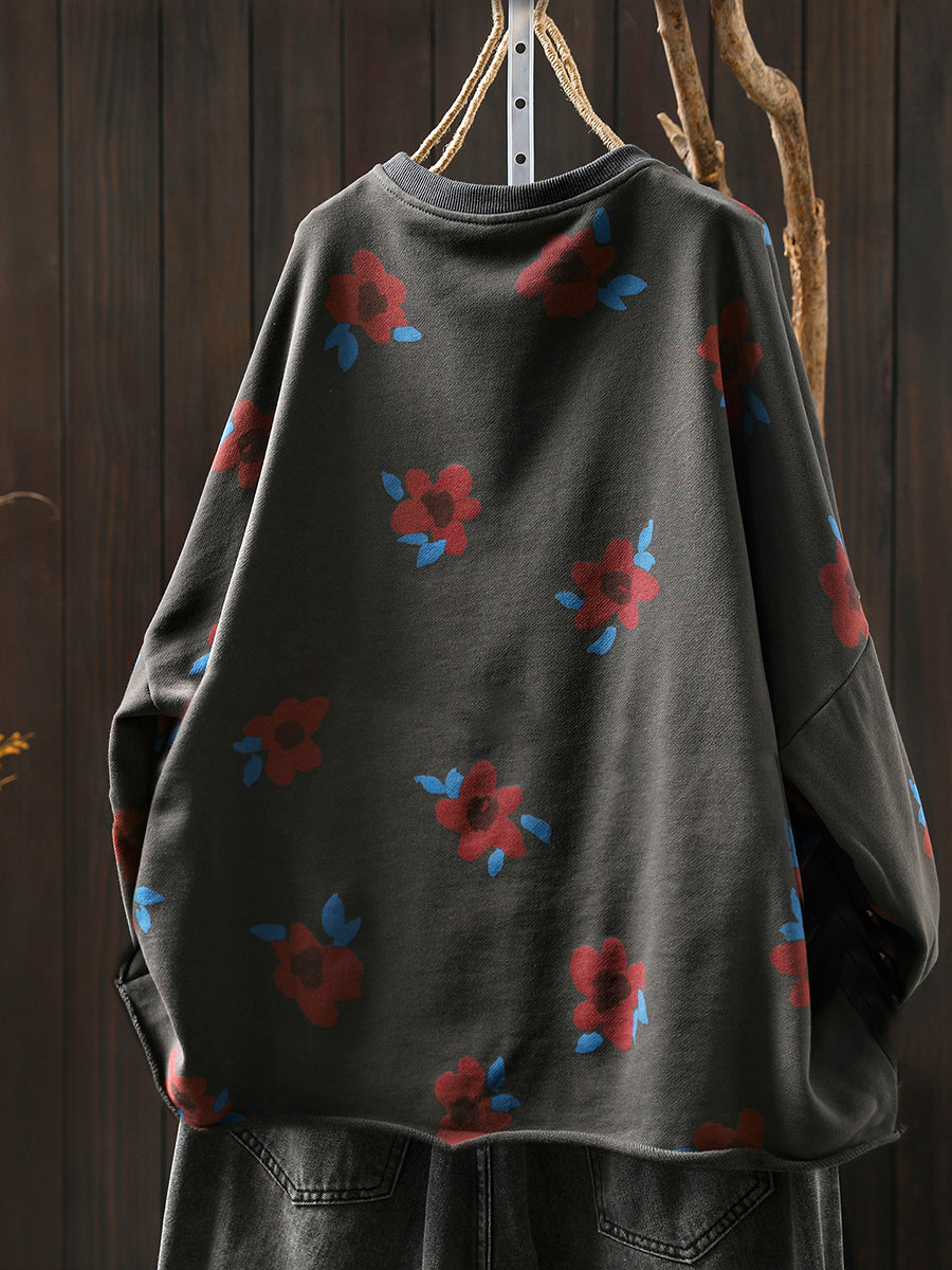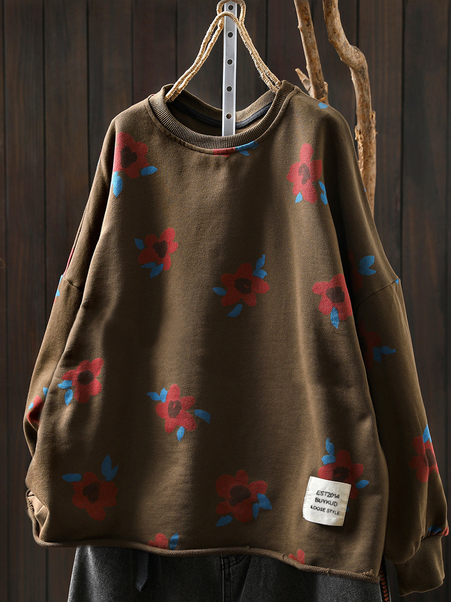 Kvinder Efterårsbluse med kunstnerisk blomsterprint og O-hals i bomuld