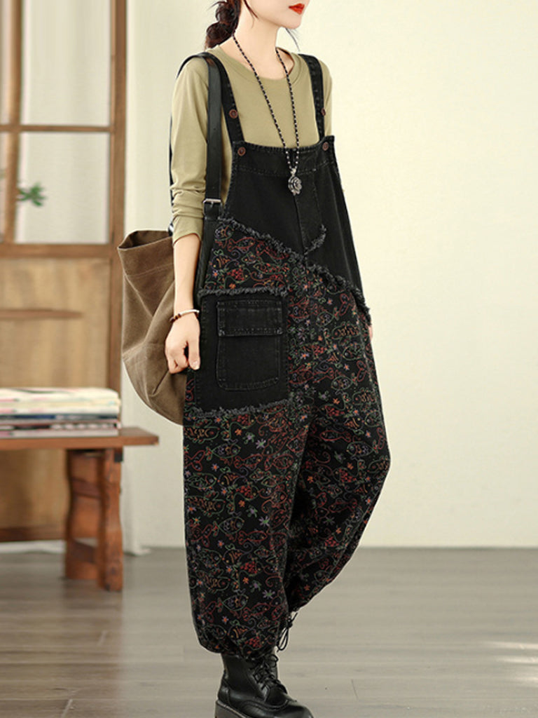 Kvinder Vintage Blomster Spliced Bomuld Løse Denim Jumpsuits