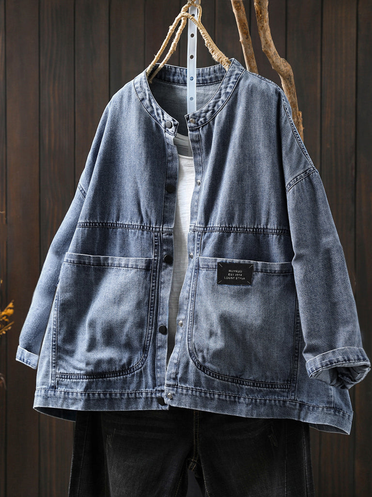 Plus Size Kvinder Sommer Retro Ren Farve Stand Collar Denim Frakke