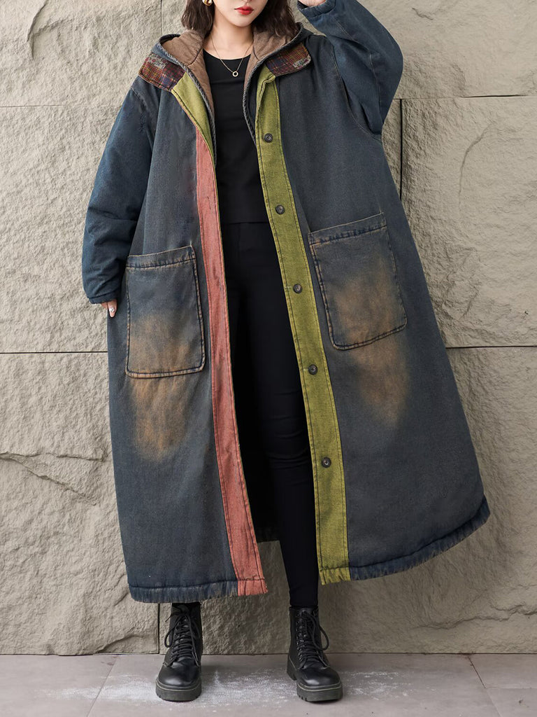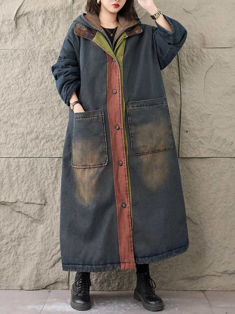 Kvinder Vintage Spliced Denim Hooded Polstret Frakke