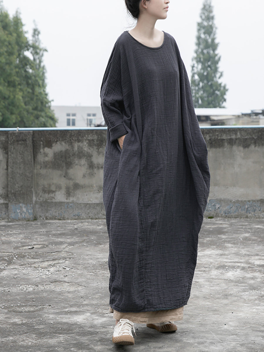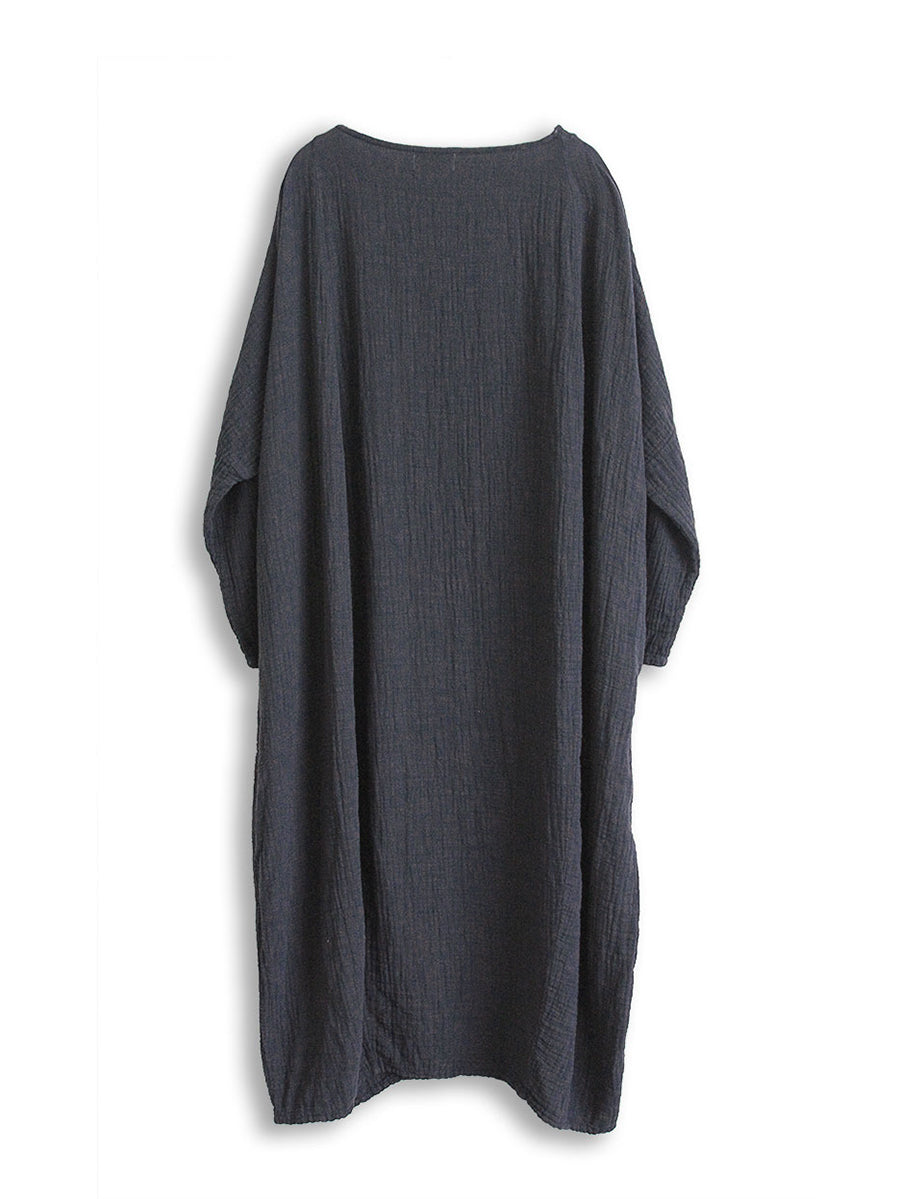 Ekspert fremstillet af en blanding af hør og bomuld, denne kjole har et tidløst solidt mønster og har en O-halskrave og hele raglanærmer. Den løse og vintage stil tilføjer et afslappet, men elegant touch til din garderobe. Ideel til både forår og efterår, denne kjole er et must-have for enhver moderigtig person.