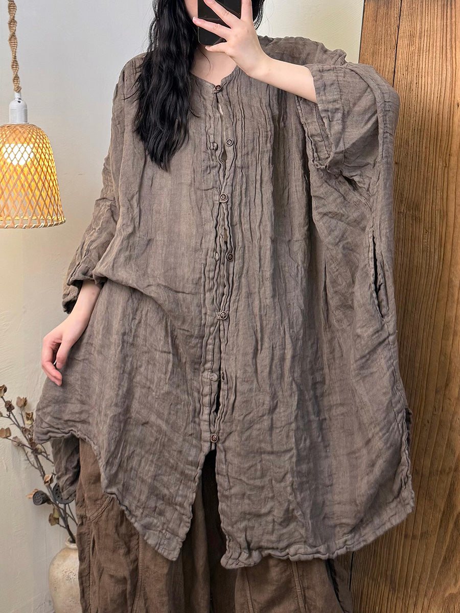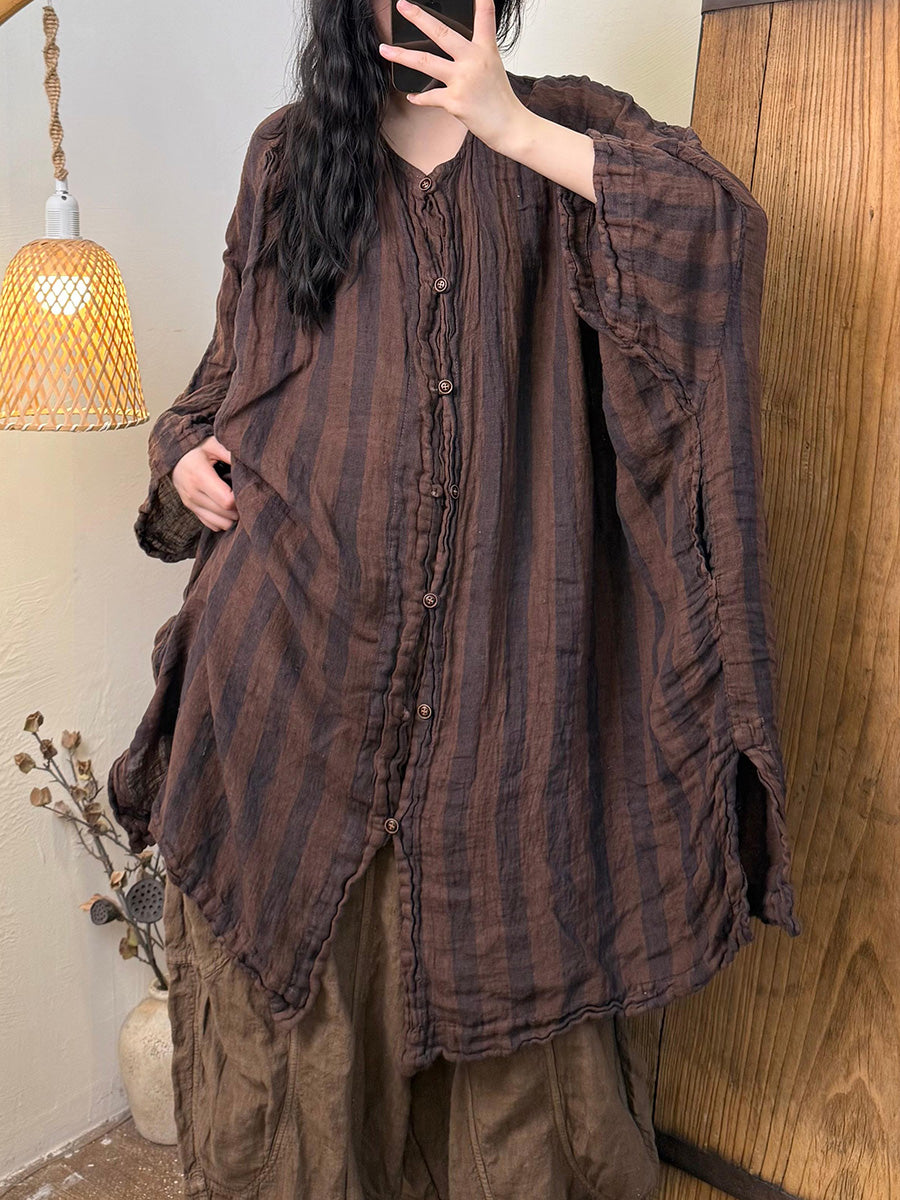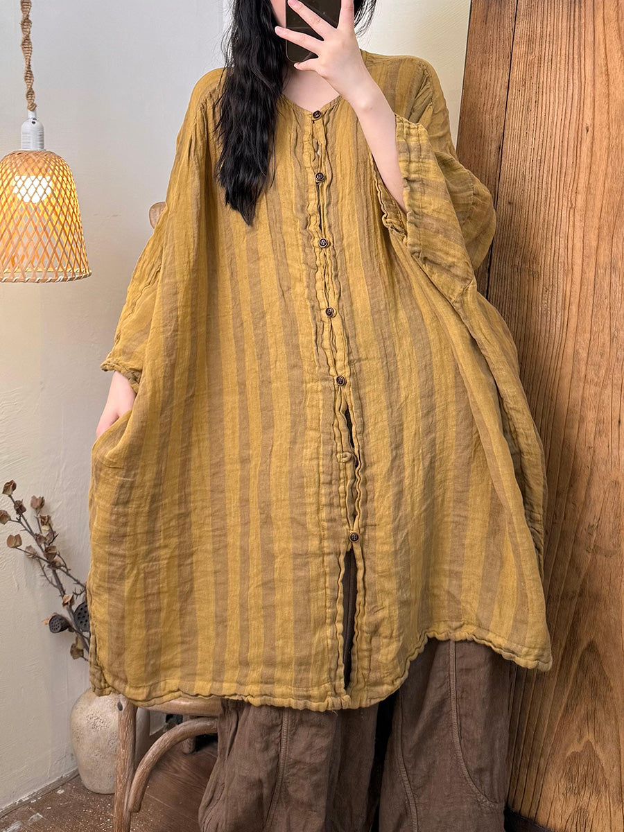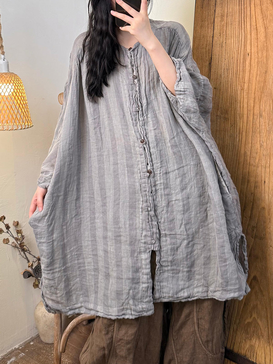 Dame Sommerskjorte i hør med O-hals og retrostriber
