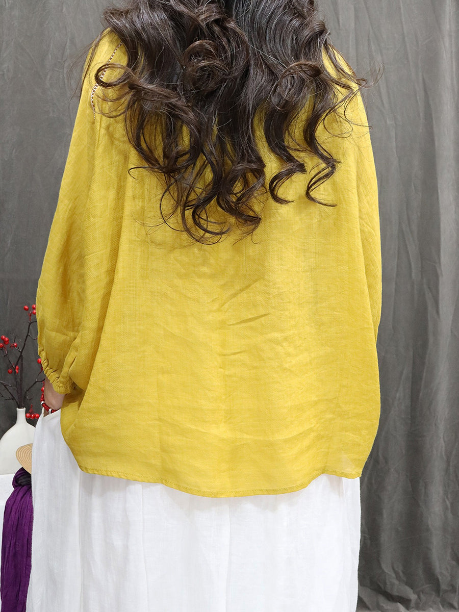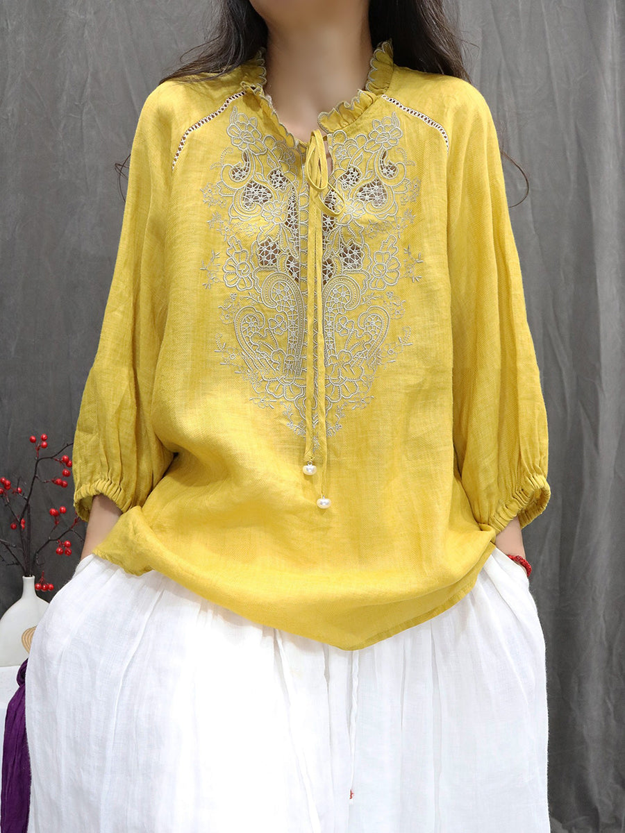 Kvinders kunstneriske forårsbroderi med standkrave i 100% ramie