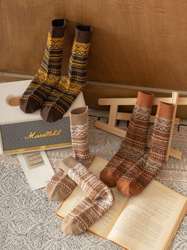 5 par vintersokker med etnisk blomst og mellemhøj hæl