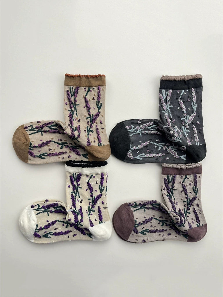5 par damesokker med kunstnerisk blomsterprint og bomuld