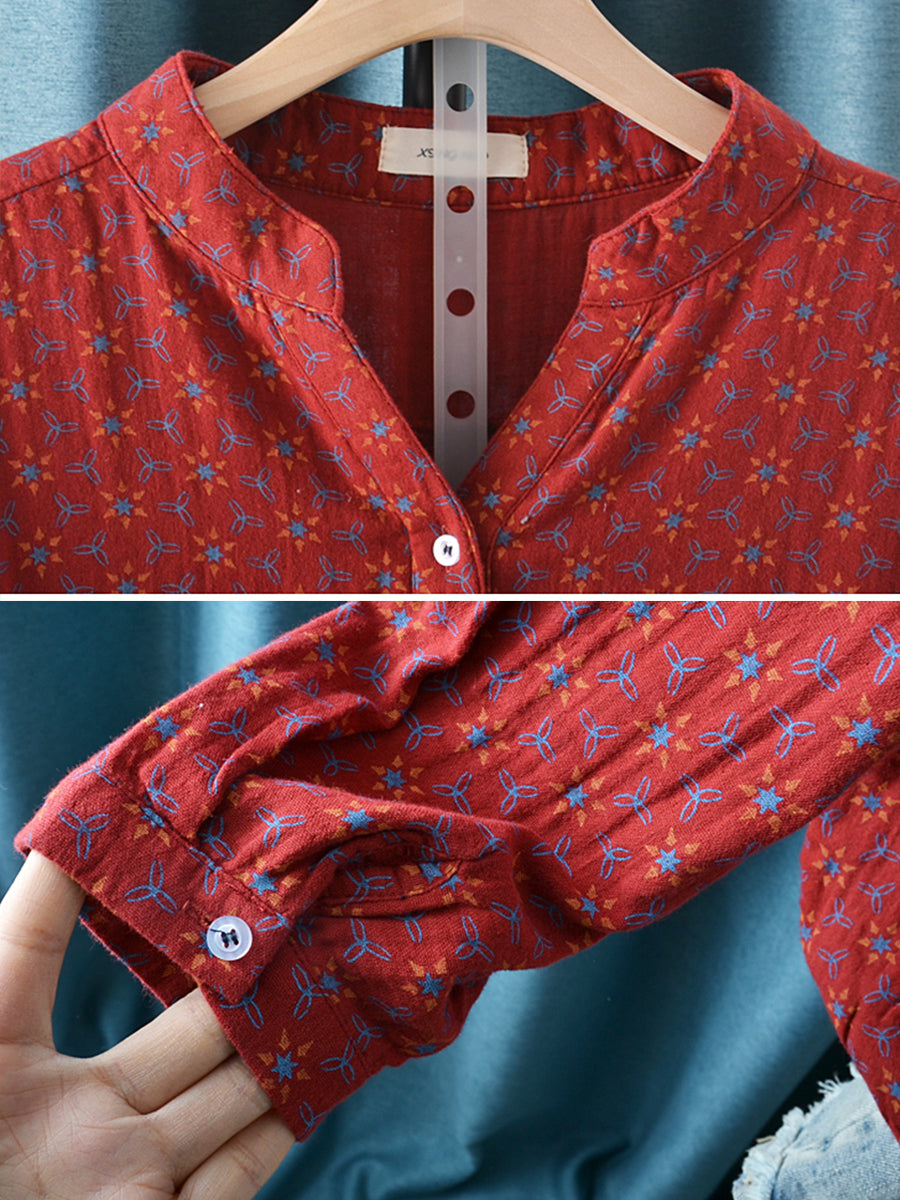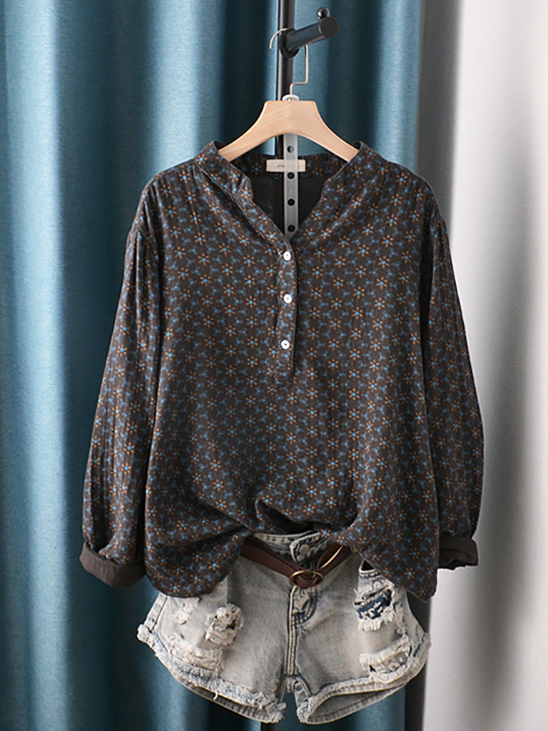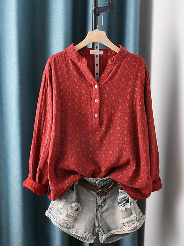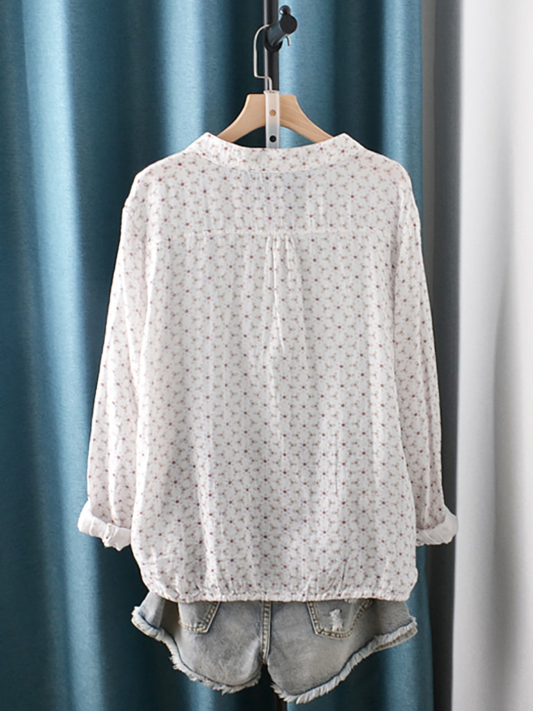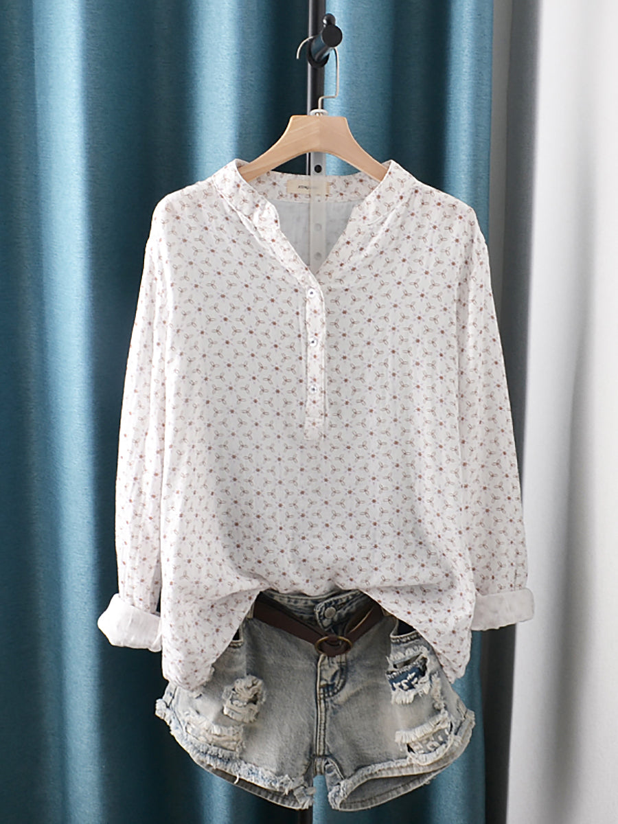 Kunstnerisk blomsterbluse i 100% bomuld med stående krave til kvinder