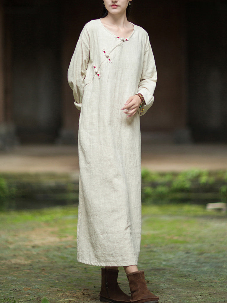 Kvinder Efterår Vintage Ren Farve O-Hals Ramie Bomuldskjole