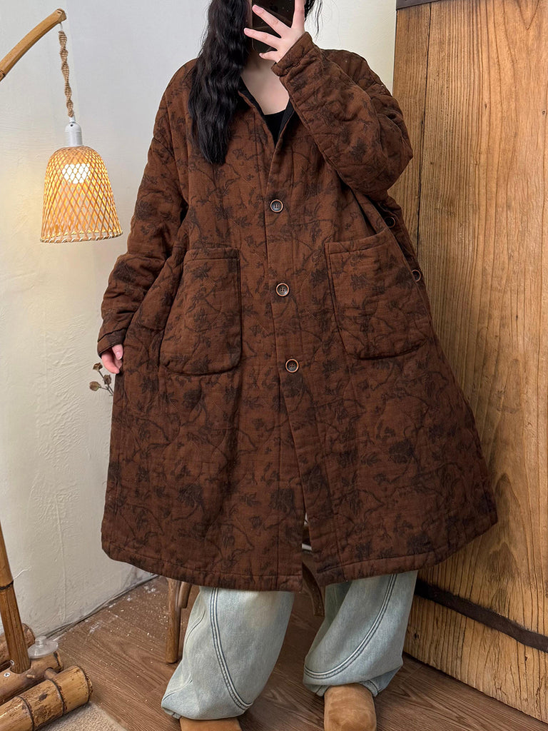 Kvinder Vintage Vinterfrakke med Blomsterprint og V-hals
