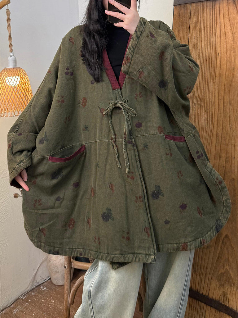 Kvinder Vintage Vinter Blomster V-hals Corduroy Polstret Frakke