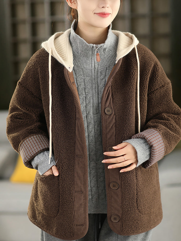 Kvinder Vinter Fleecejakke med Hættetrøje og Farveblok