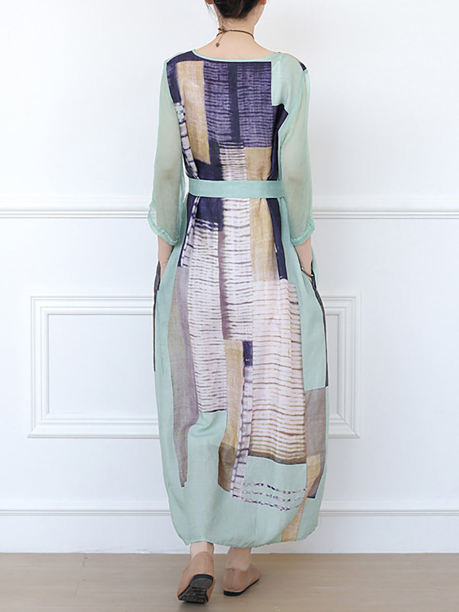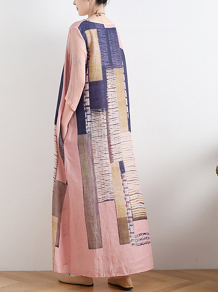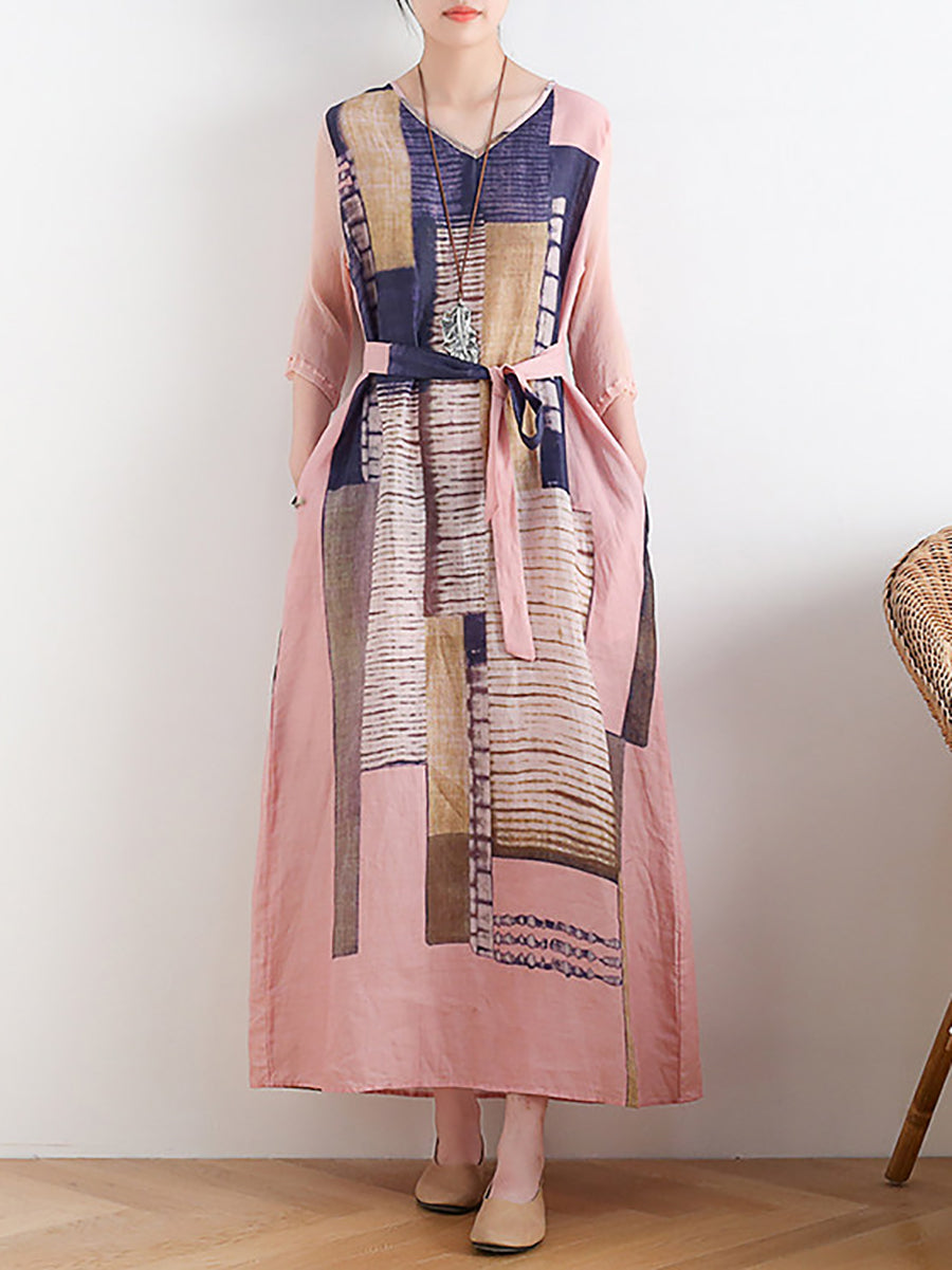 Kvinder Sommer Kunstnerisk Patchwork Ramie O-hals Kjole