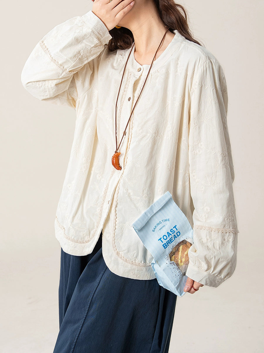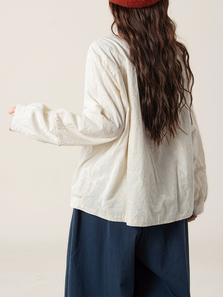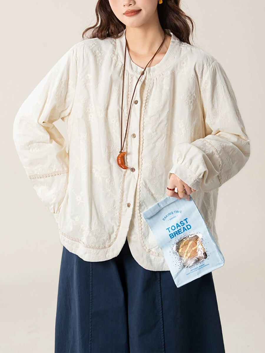 Kunstnerisk efterårsskjorte med broderi og O-hals til kvinder