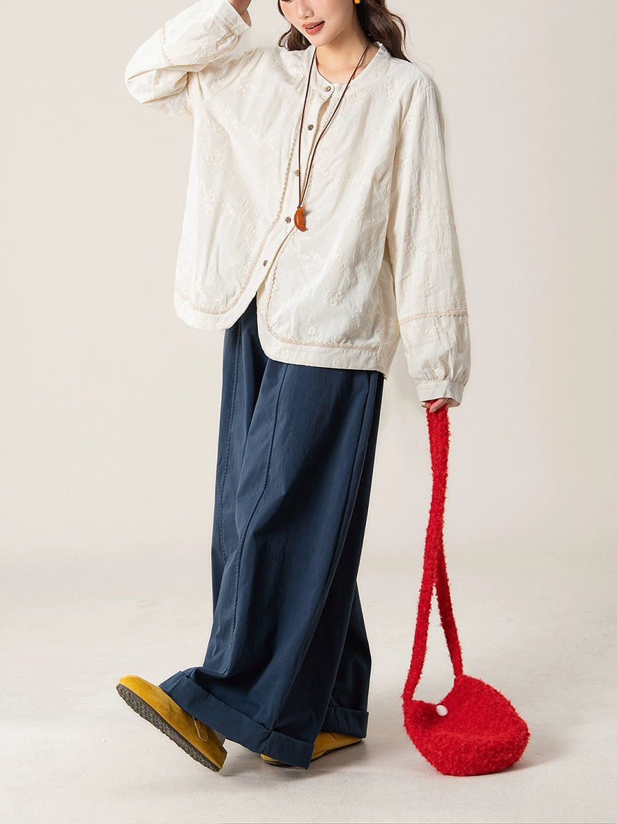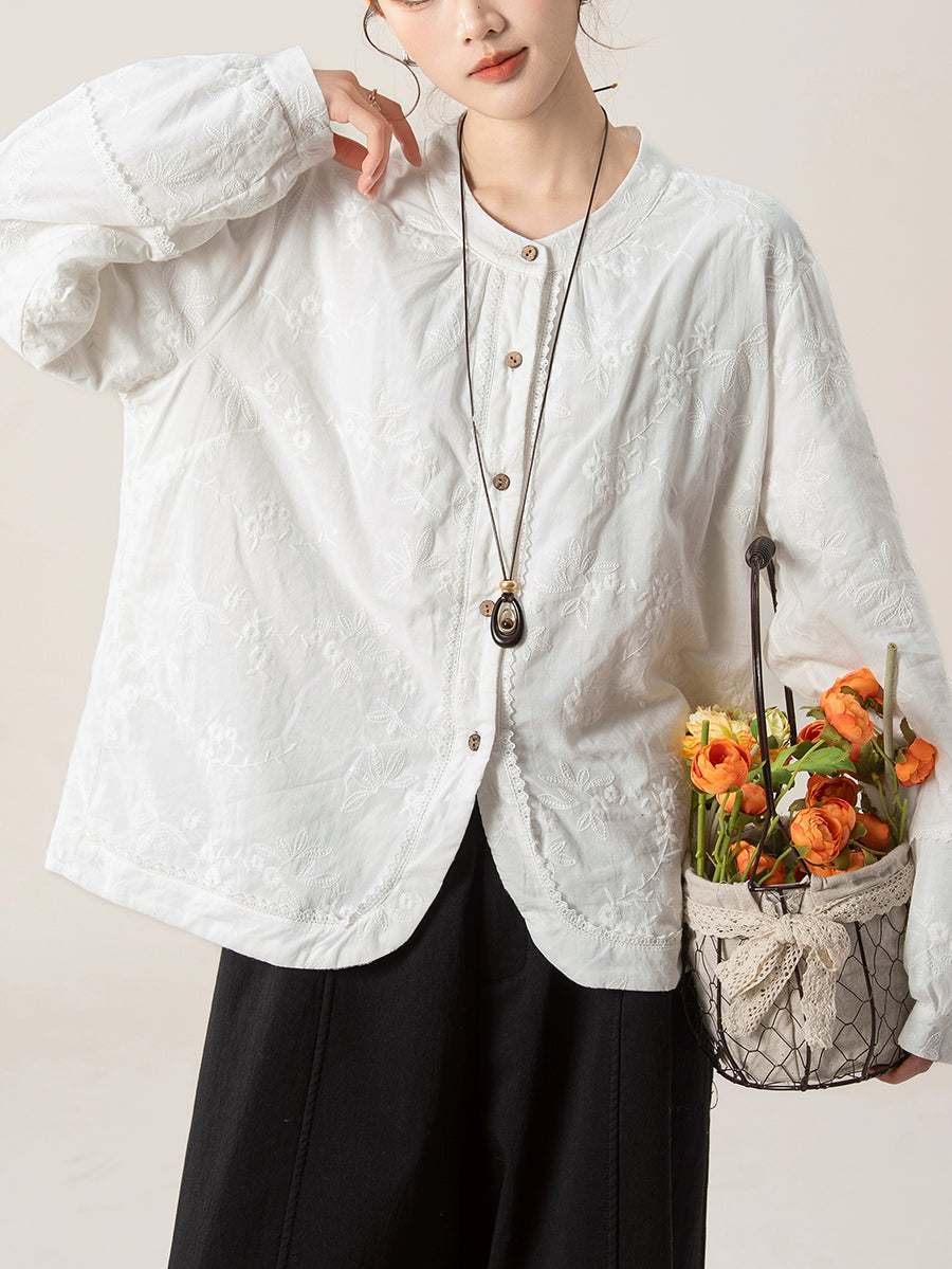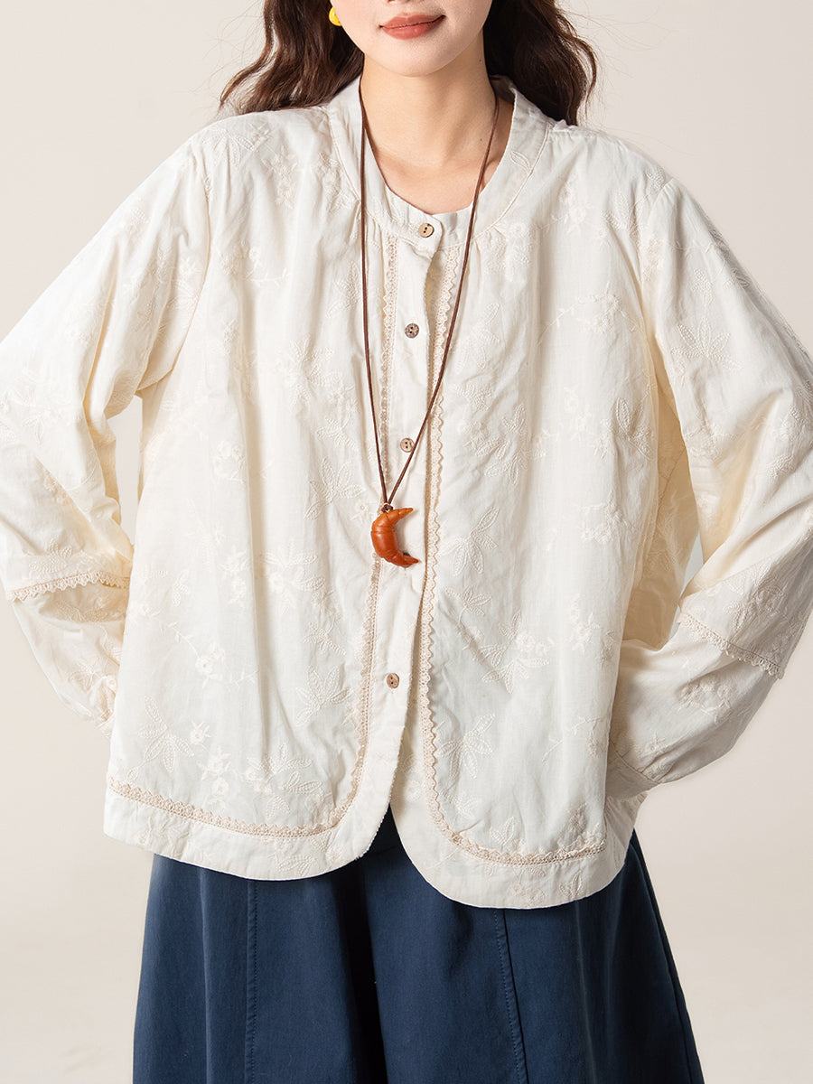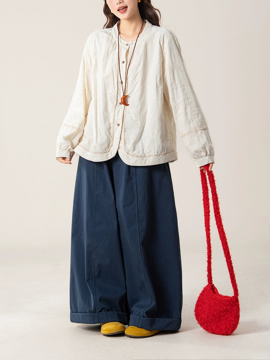 Kunstnerisk efterårsskjorte med broderi og O-hals til kvinder
