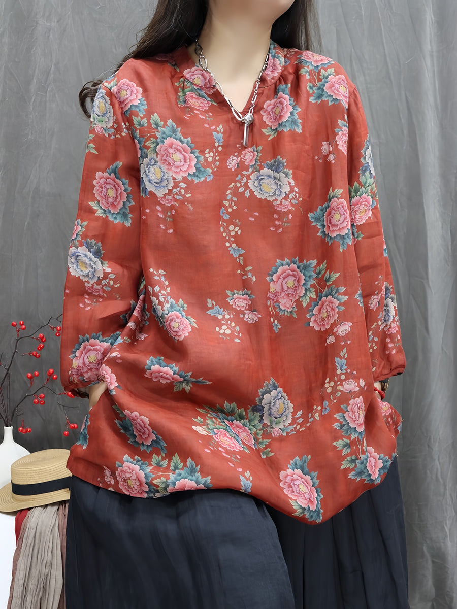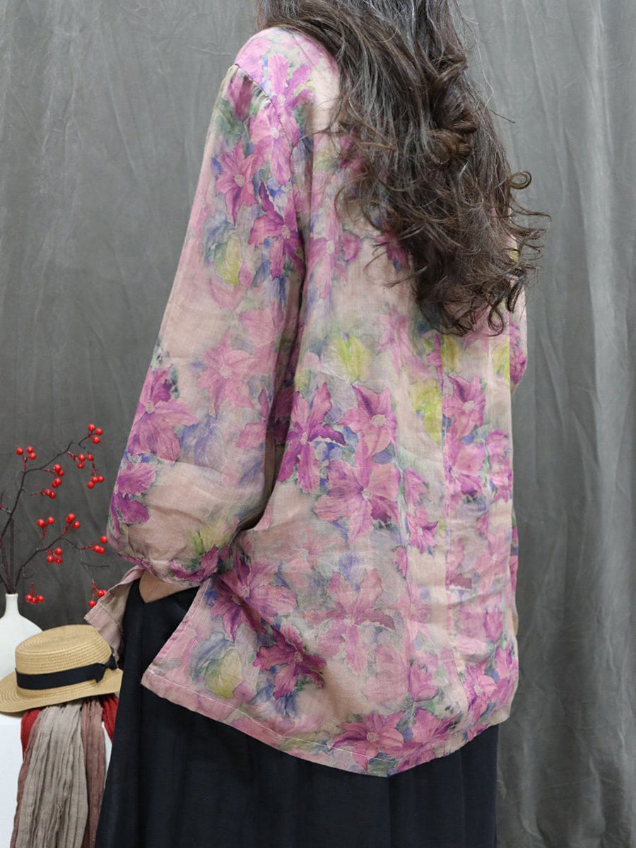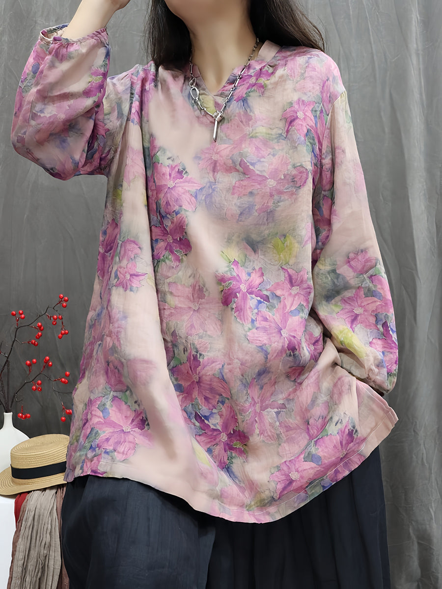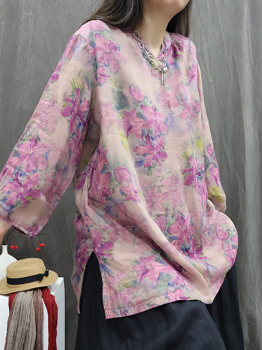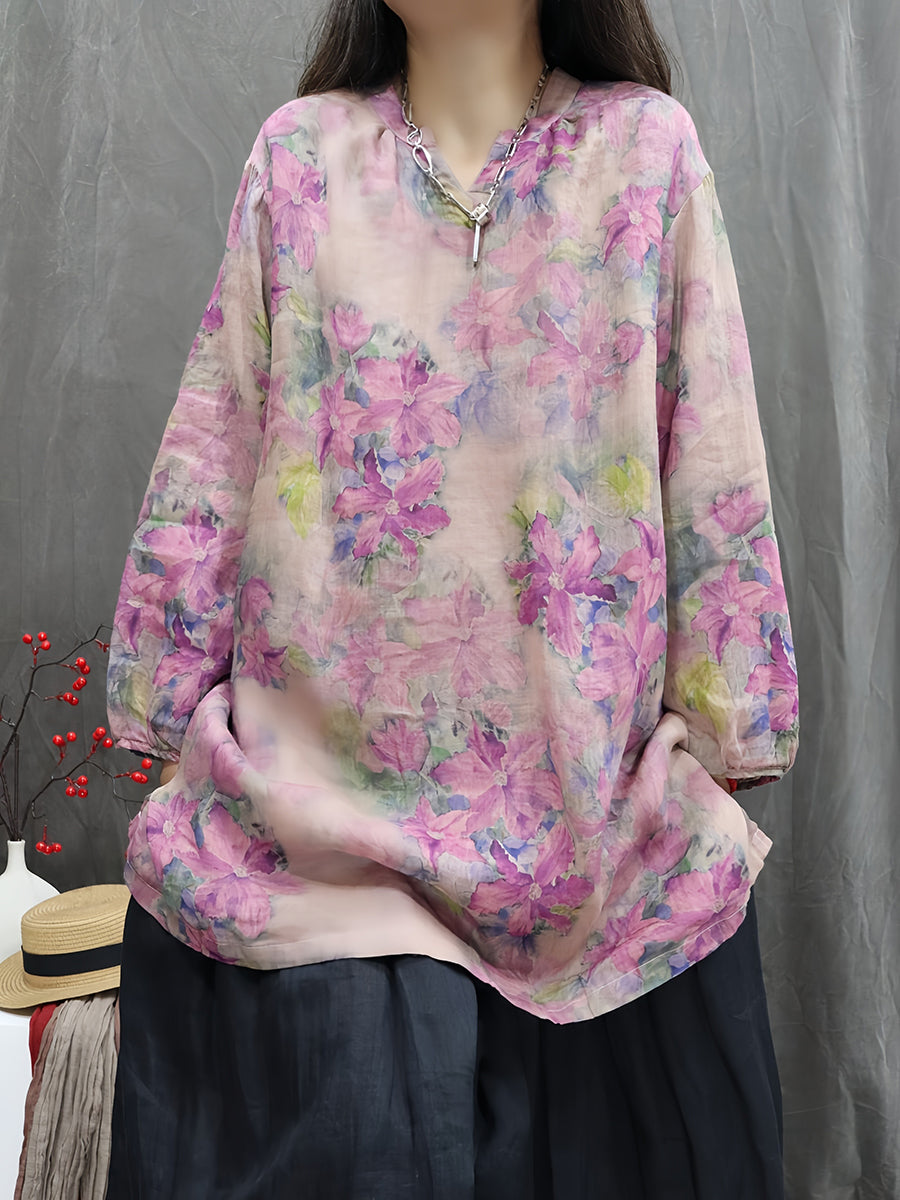 Kunstnerisk forårsblomstrende bluse med V-hals og 100% ramie til kvinder