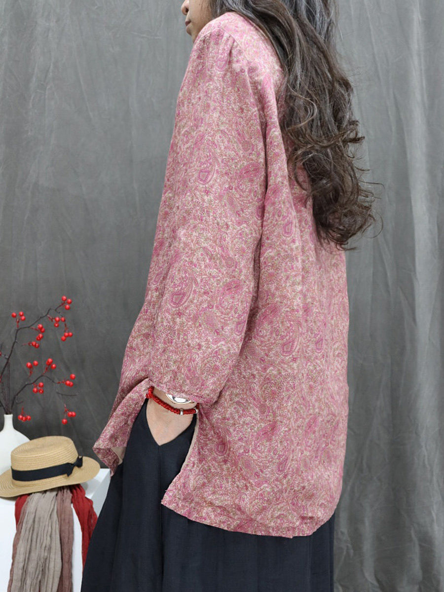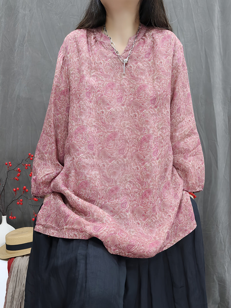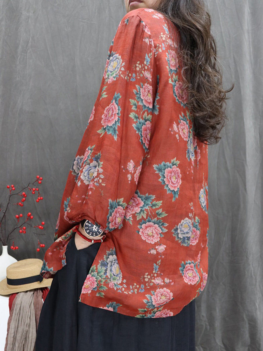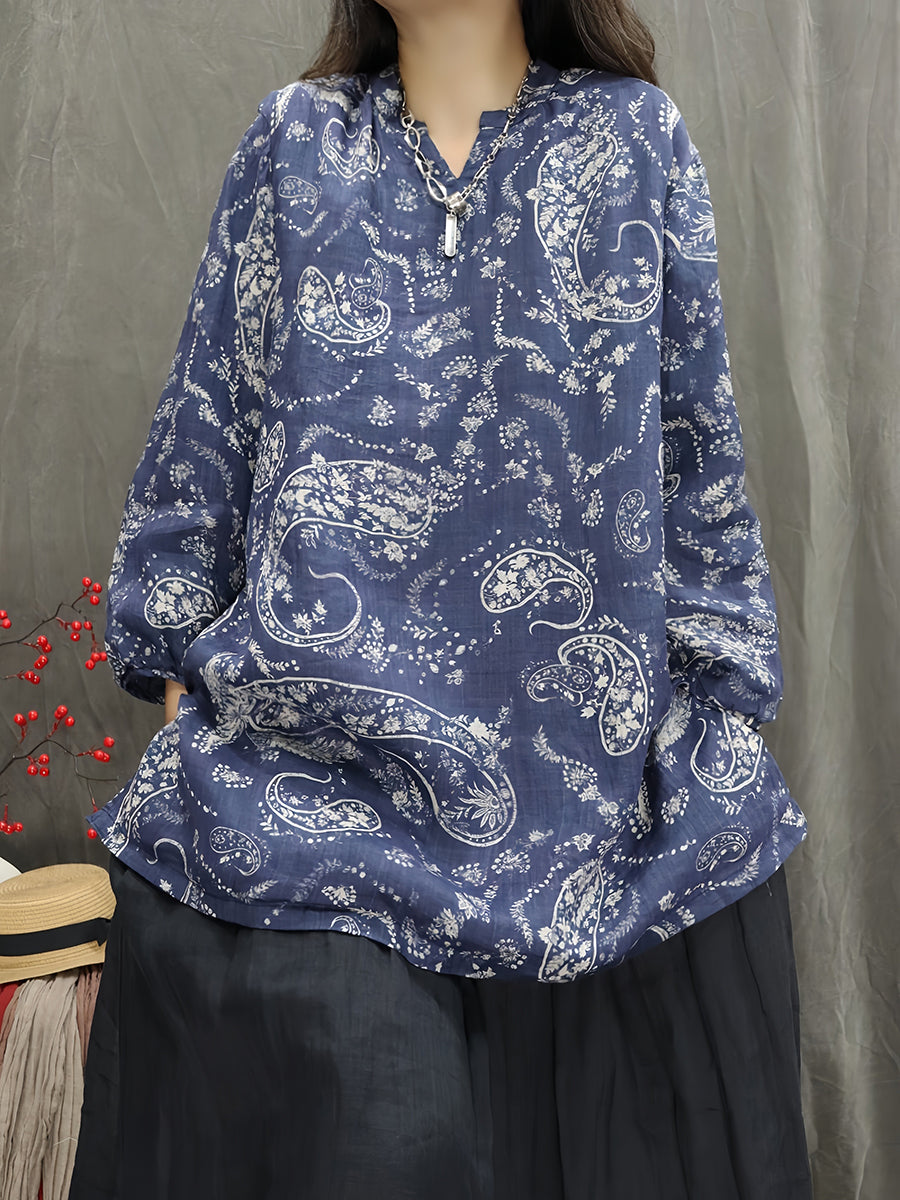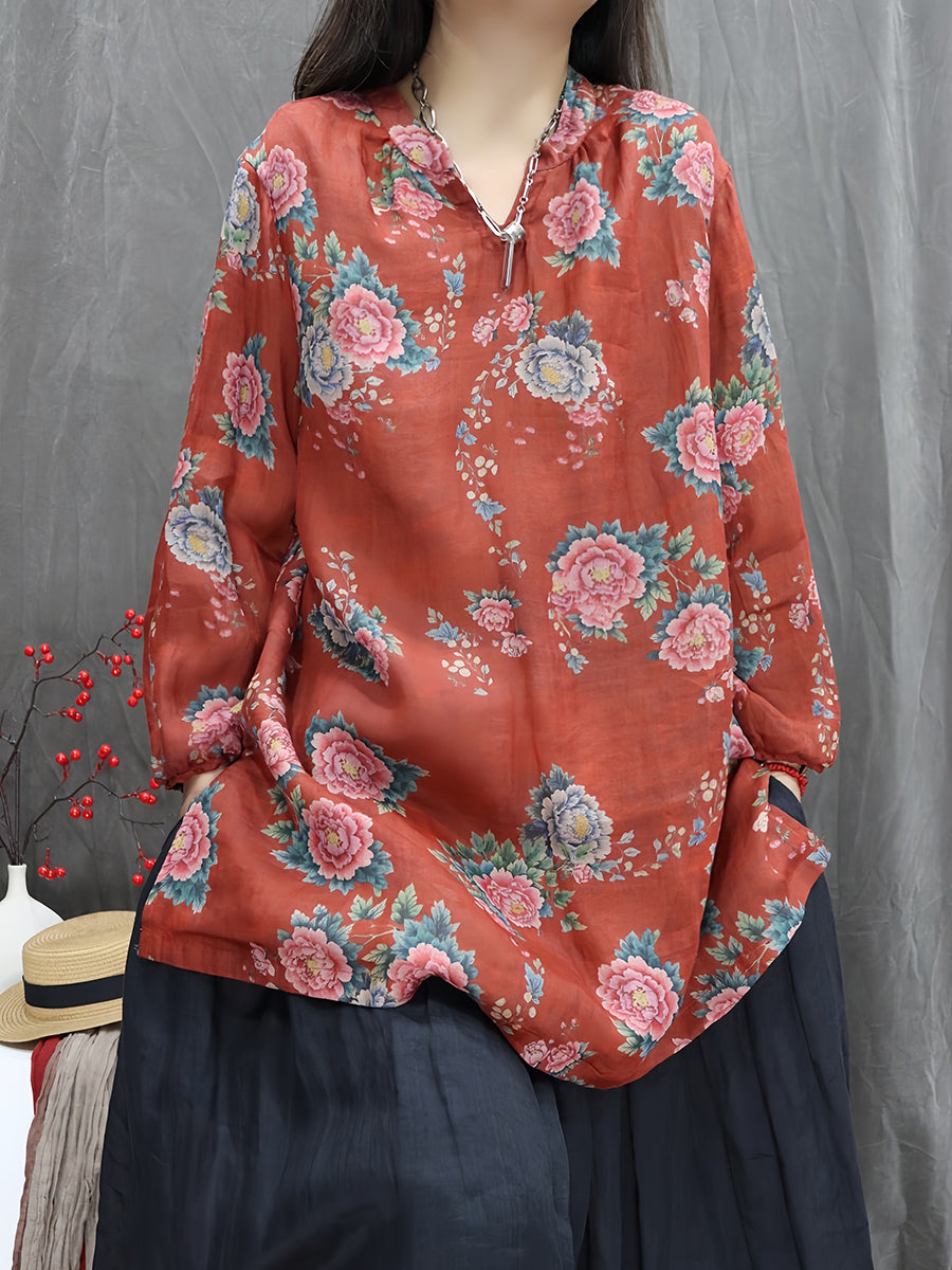 Kunstnerisk forårsblomstrende bluse med V-hals og 100% ramie til kvinder
