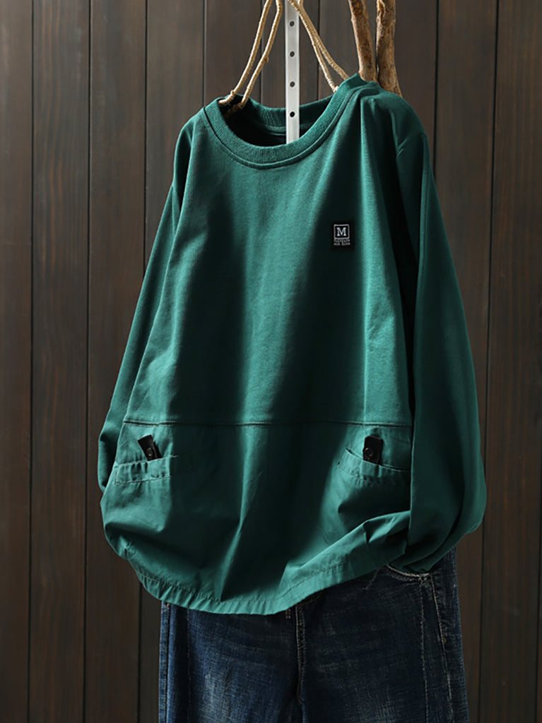 Kvinder efterårsskjorte i ren farve med splejset O-hals i 100% bomuld