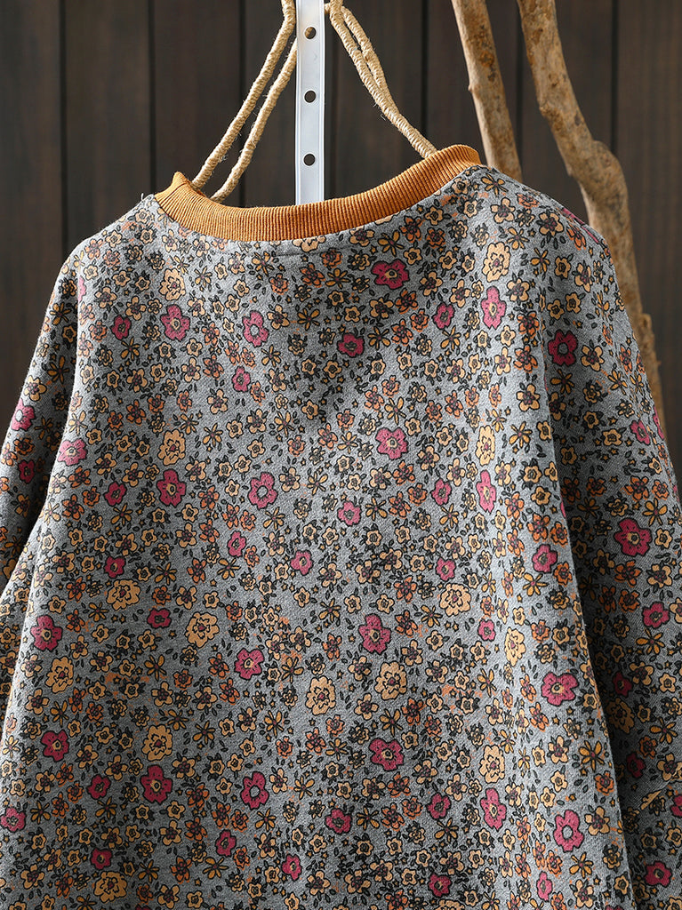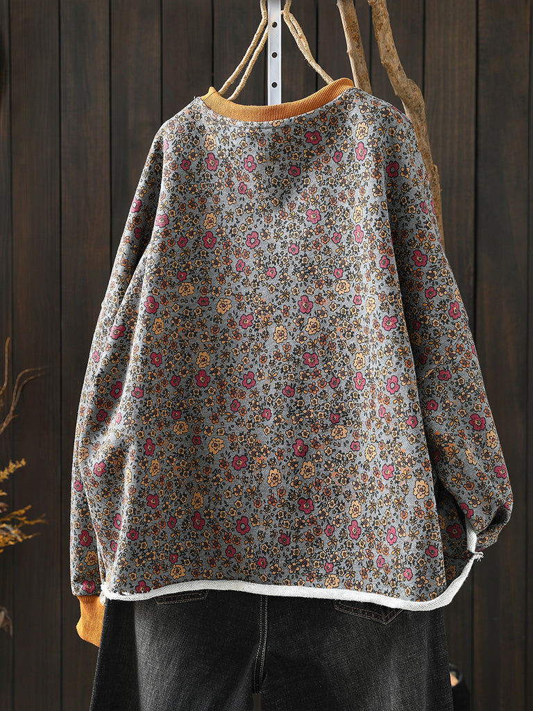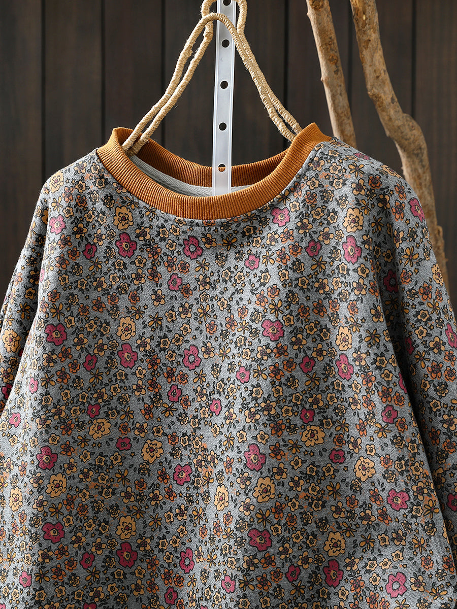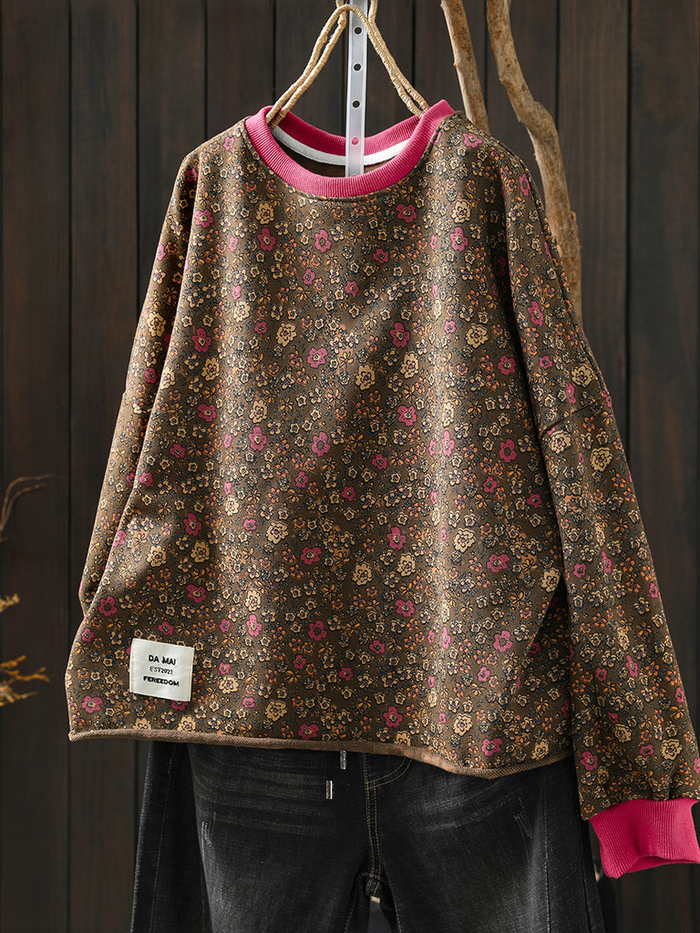 Kvinder Vinter Kunstnerisk O-hals Blomsterbluse 100% Bomuld