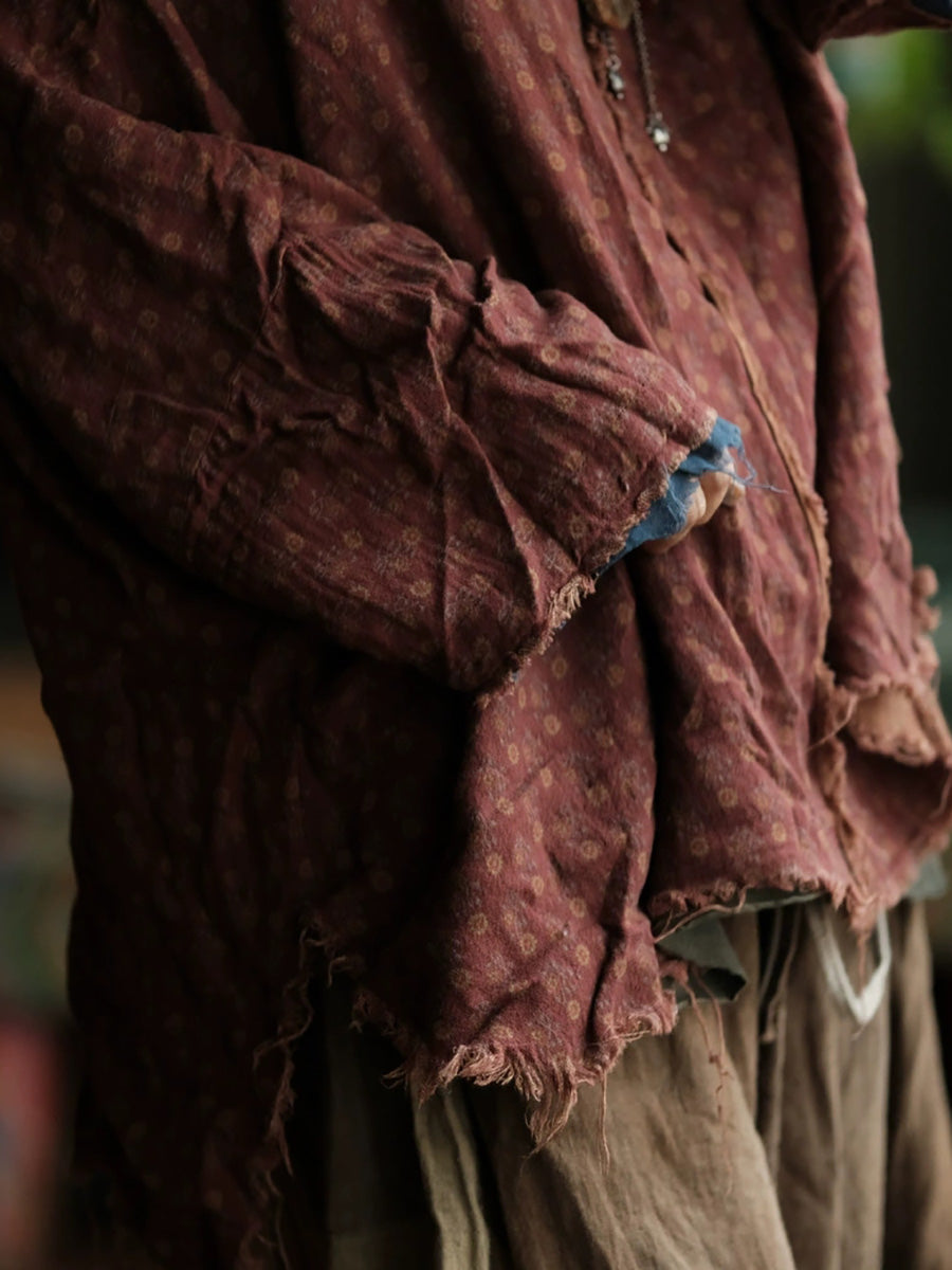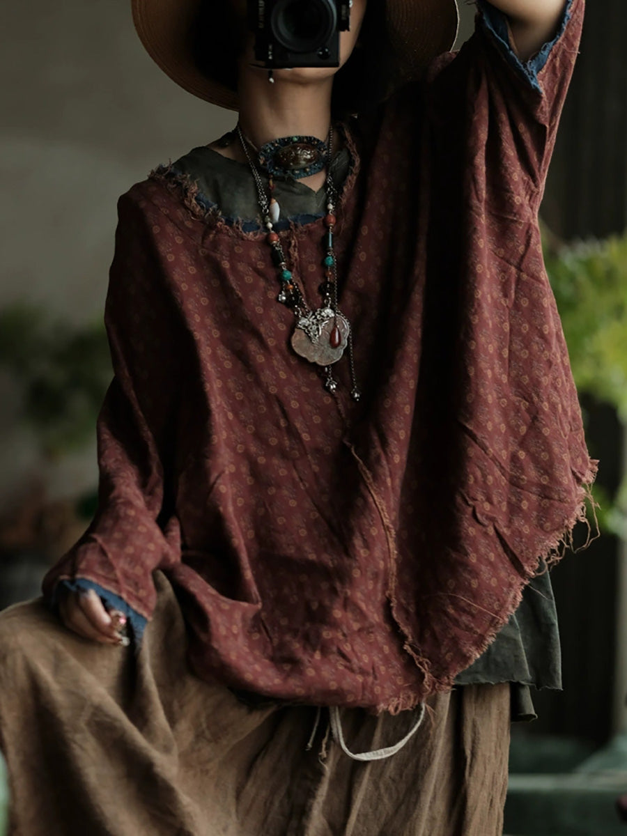 Dame Efterårsskjorte med O-hals og rå kant i bomuld med retroprint