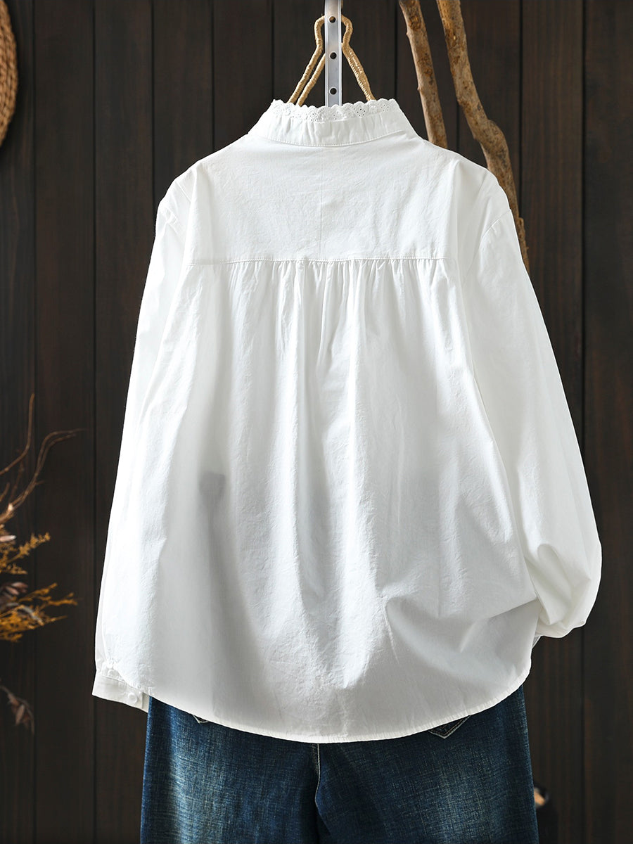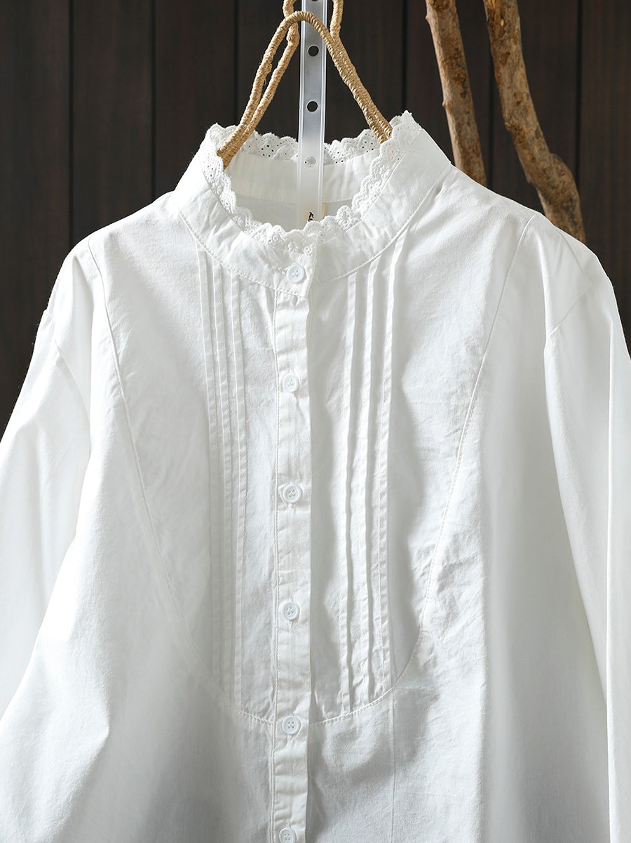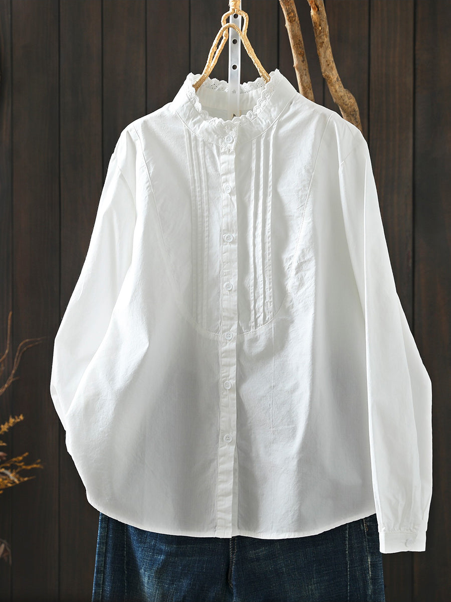 Dame forårsskjorte med kunstnerisk rynket 100% bomuld og stående krave