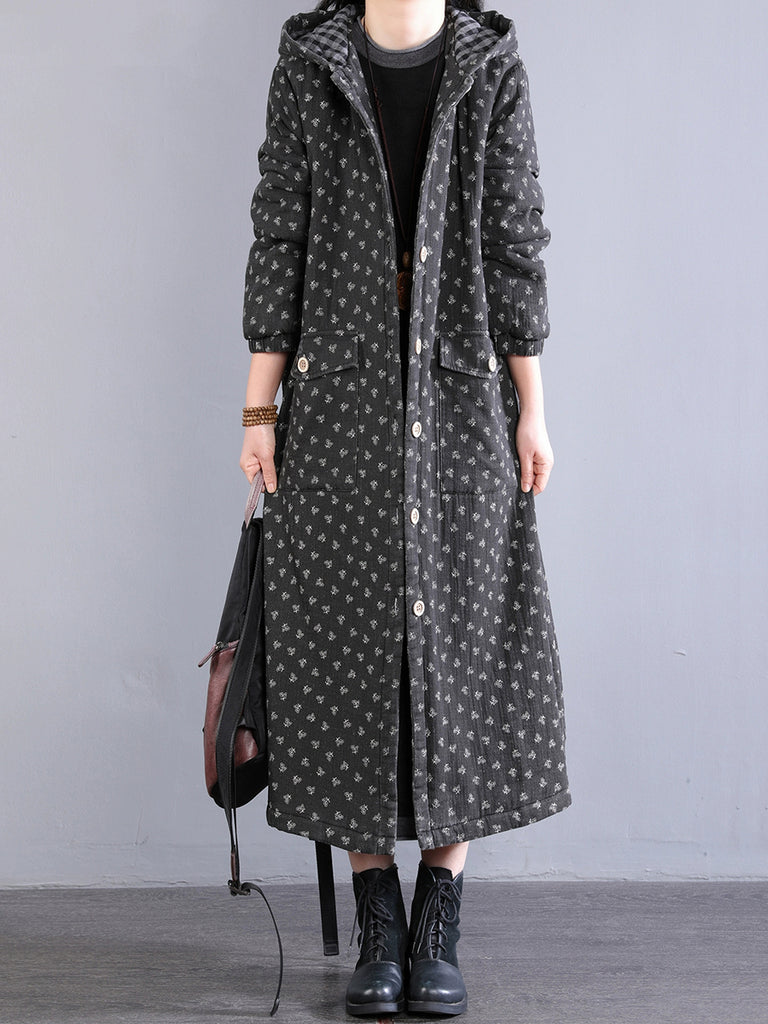 Kvinder Retro Vinter Blomster Hættetrøje med Polstret Frakke