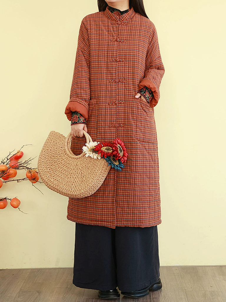 Kvinder Vinter Retro Plaid Stand Collar Polstret Overfrakke