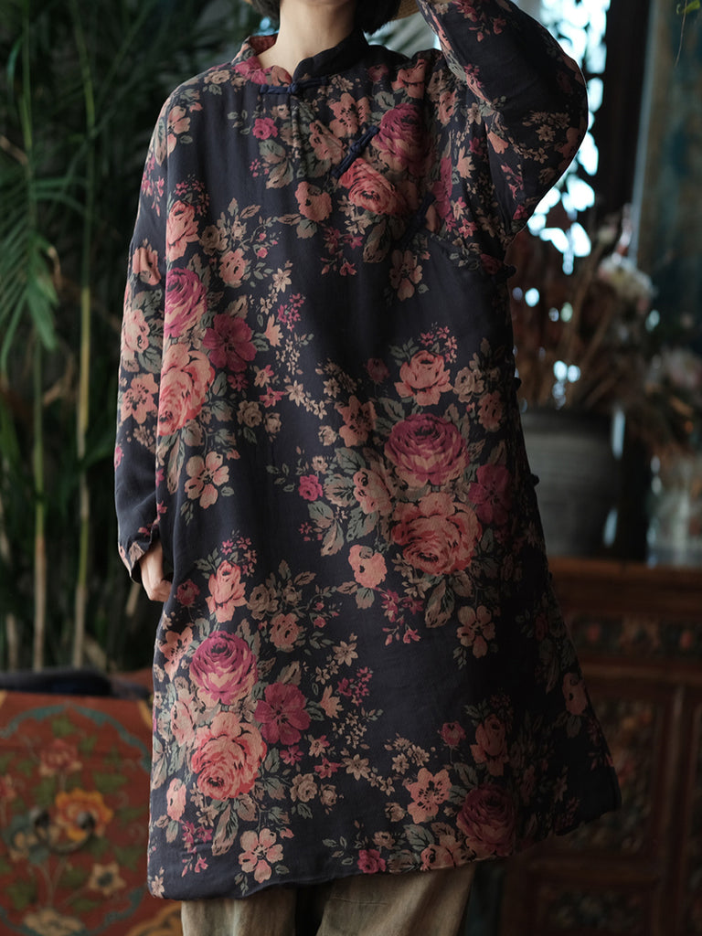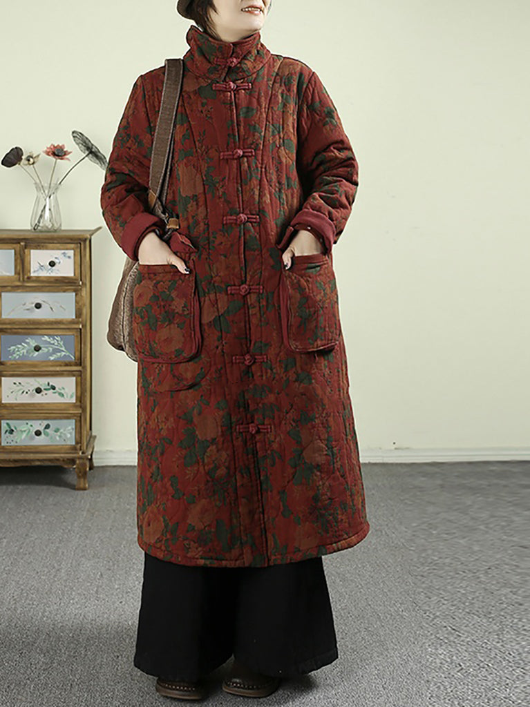 Kvinder Vinter Retro Blomsterpolstret O-hals Lang Frakke