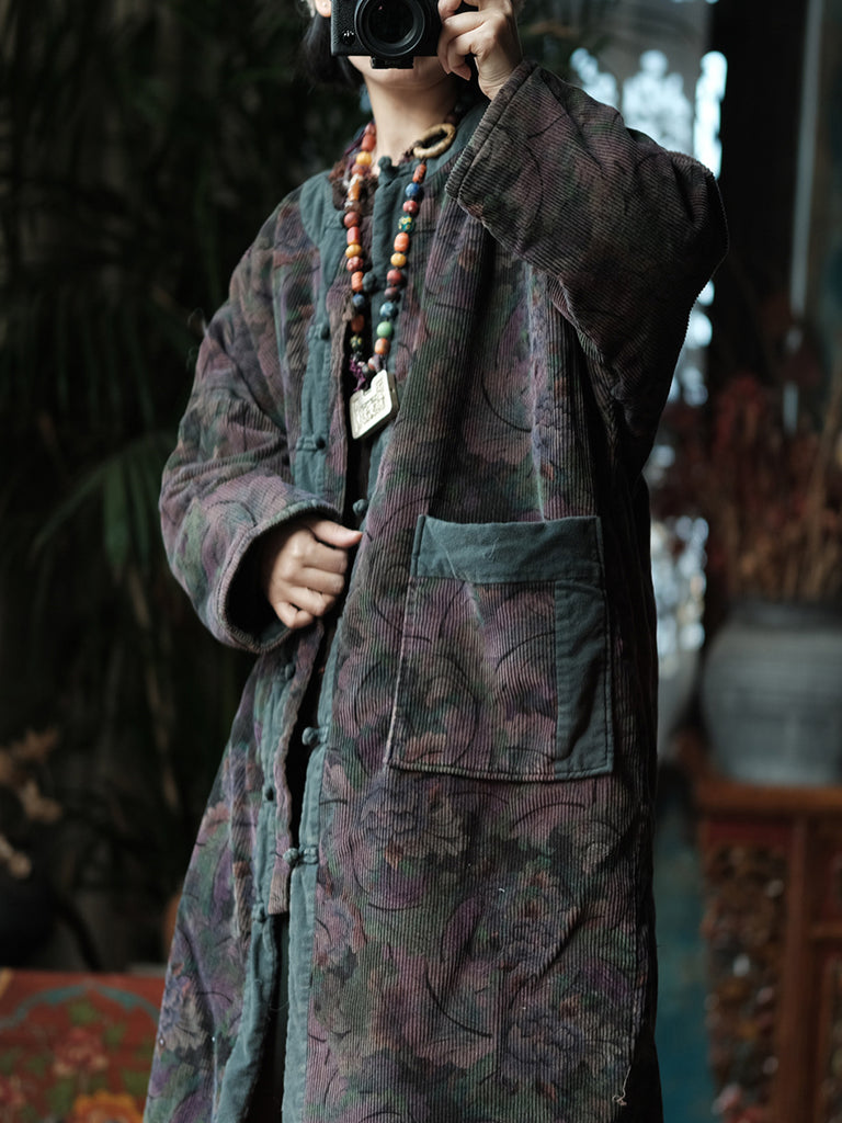 Kvinder Vinter Retro Blomster O-hals Corduroy Polstret Frakke