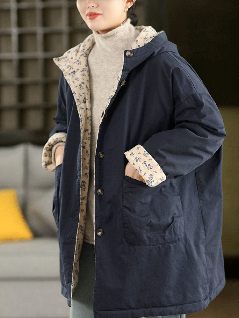 Women Winter Two-side Wearing Floral 100%Cotton Hooded Coat