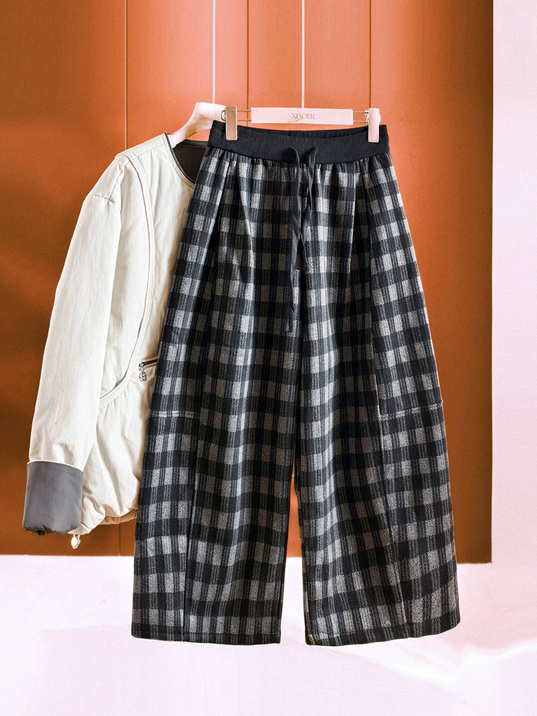 Women Winter Plaid Fleece-lined Wide-leg Pants