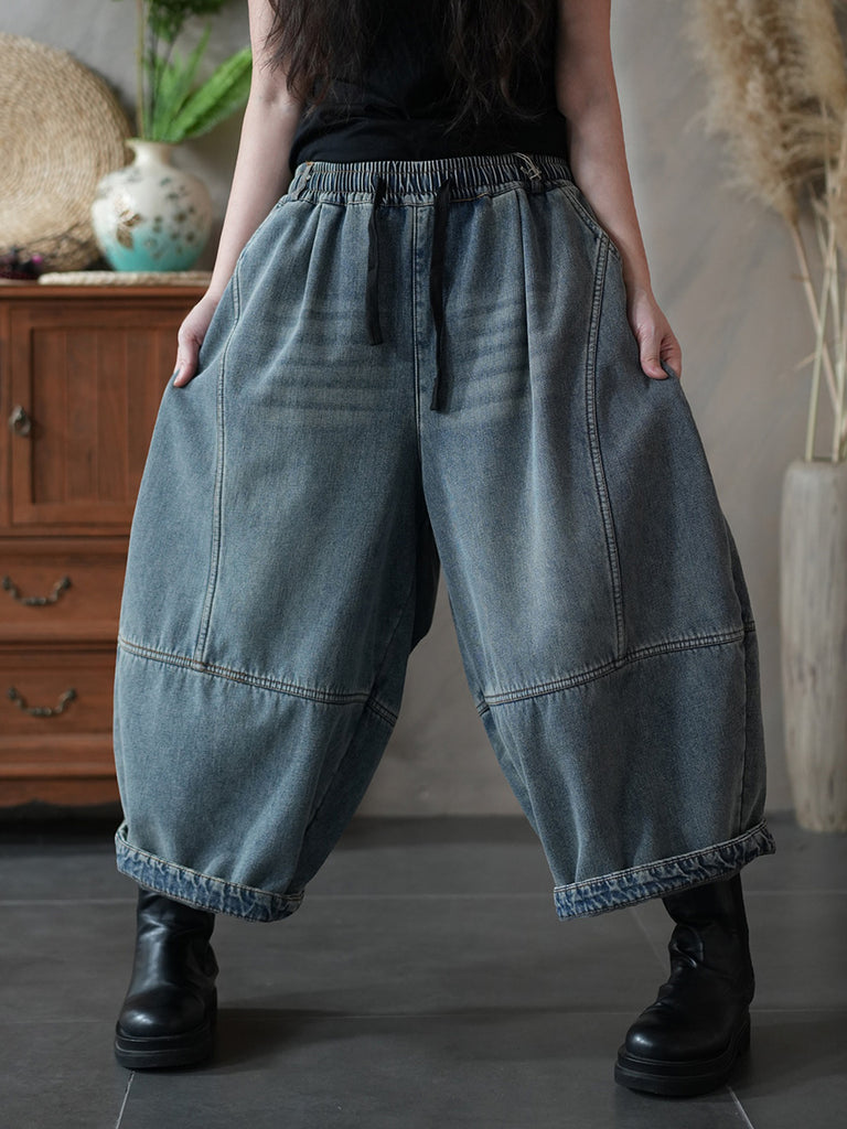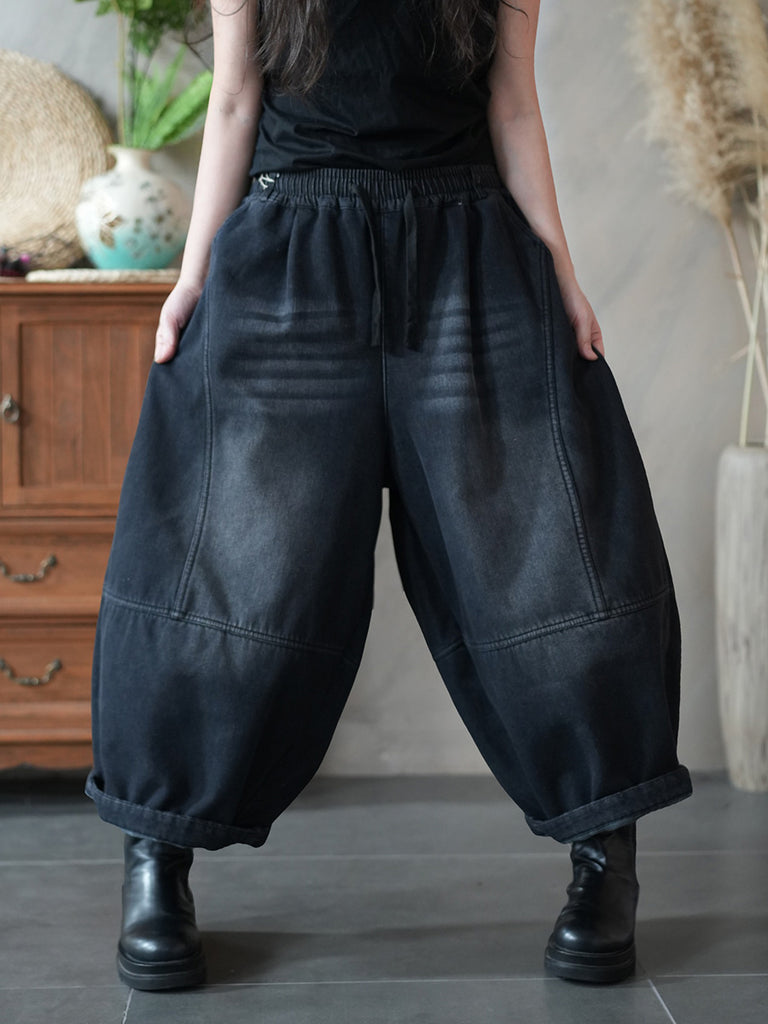 Women Winter Retro Pure Color Fleece-lined Denim Harem Pants