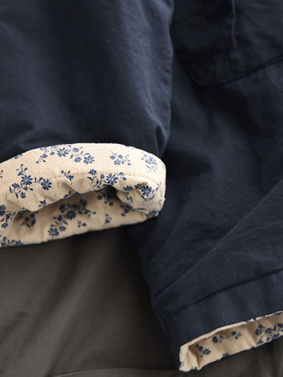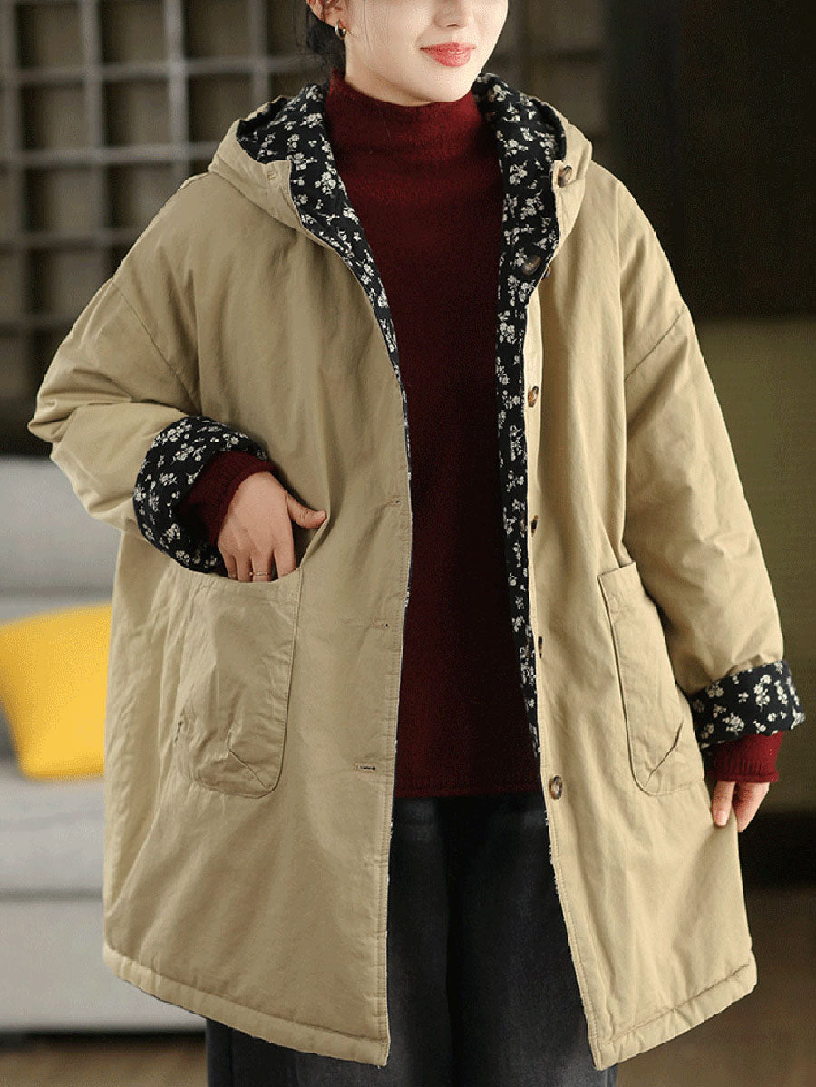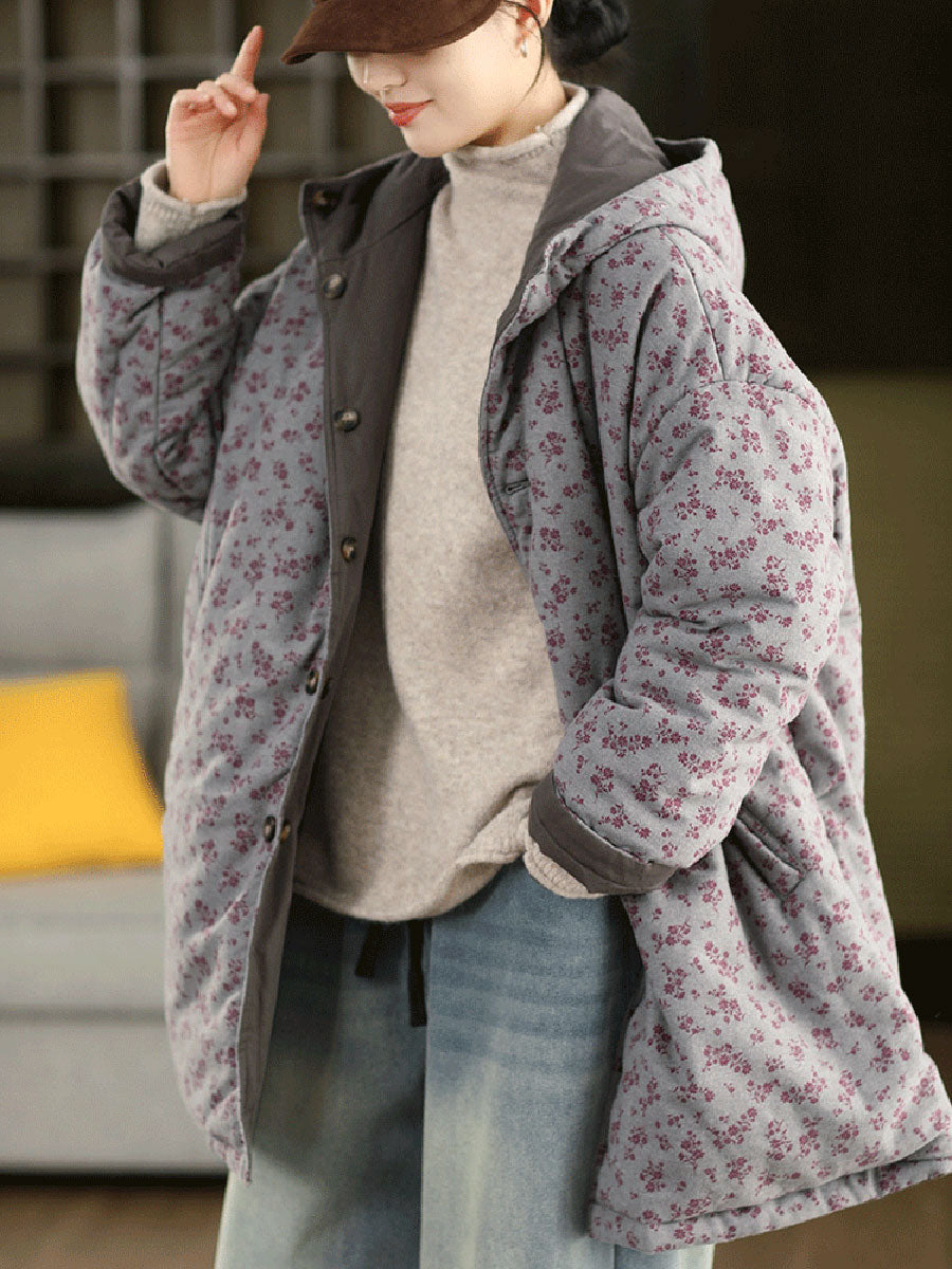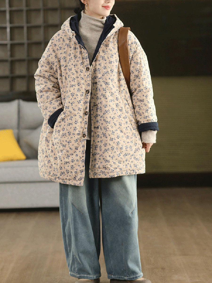 Women Winter Two-side Wearing Floral 100%Cotton Hooded Coat