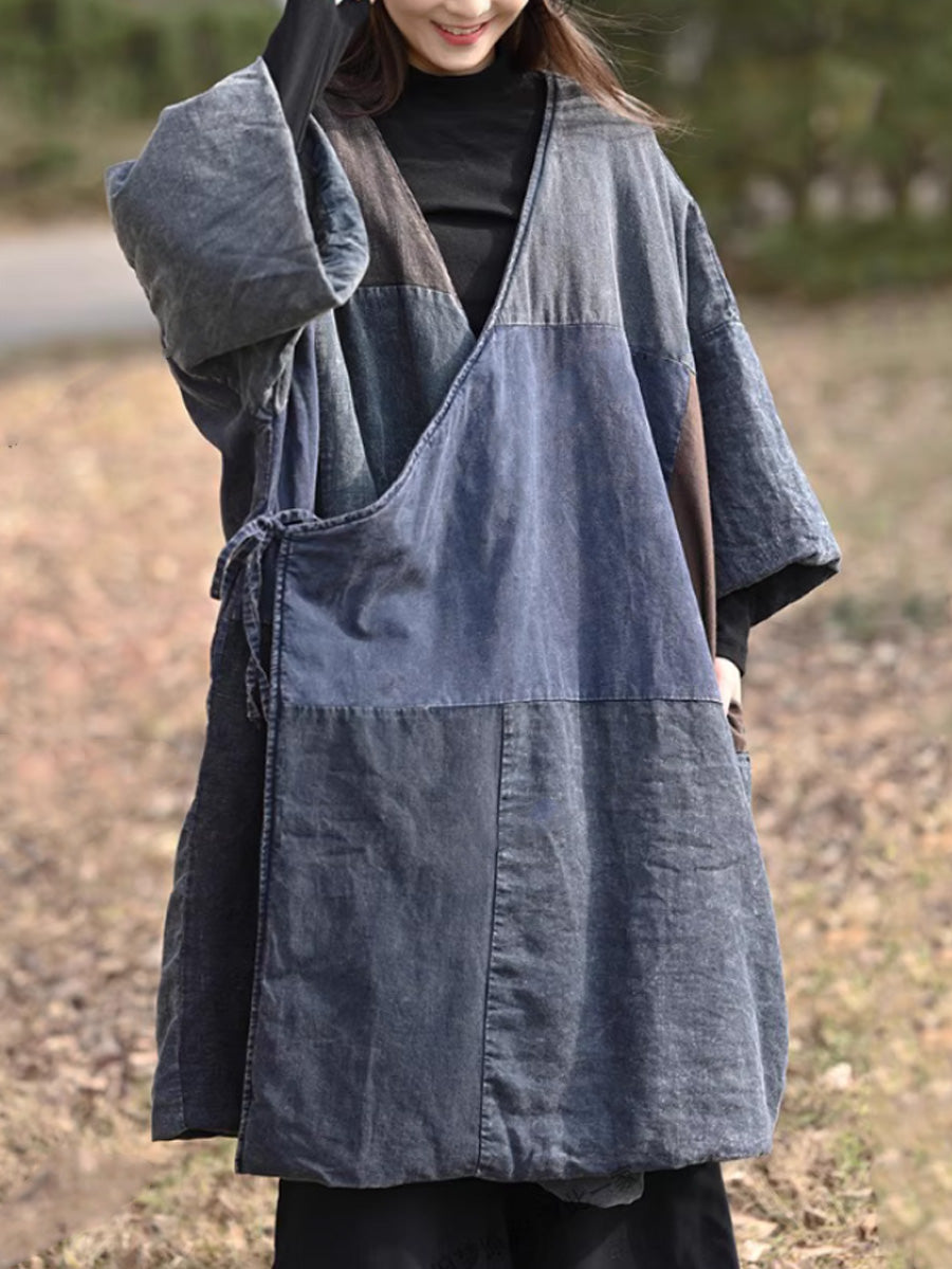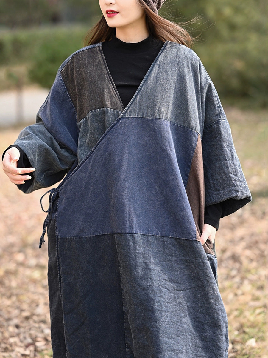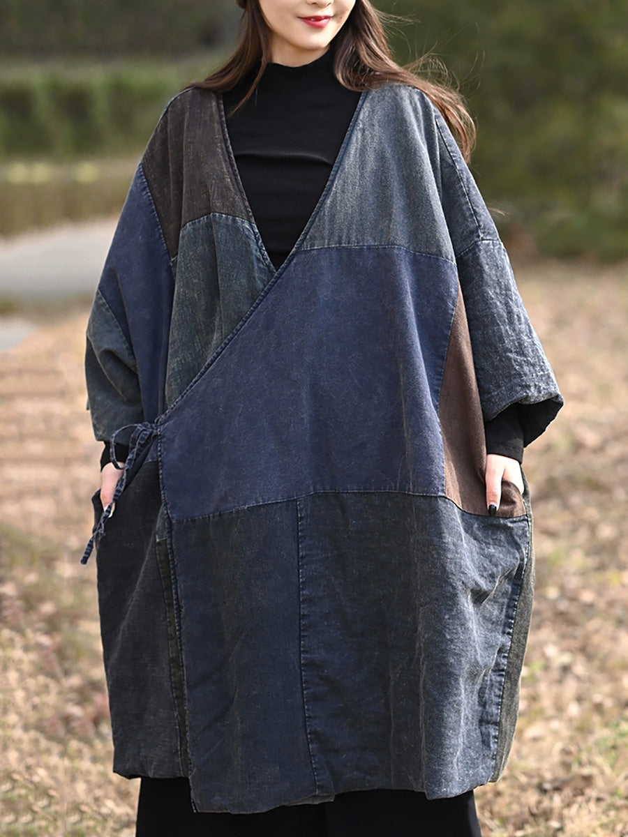 Women Retro Colorblock Spliced Cotton V-Neck Padded Coat