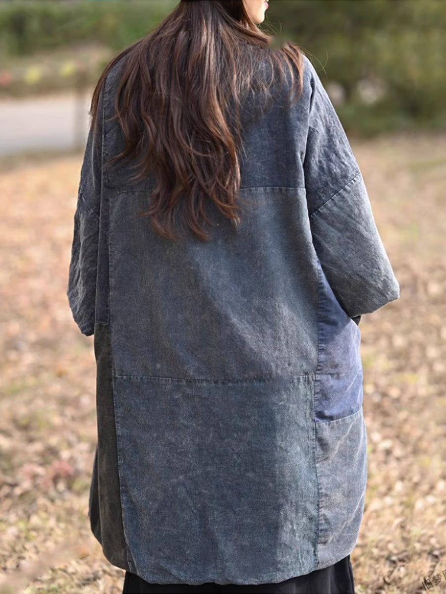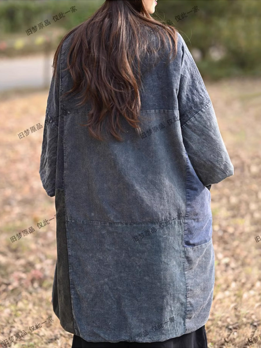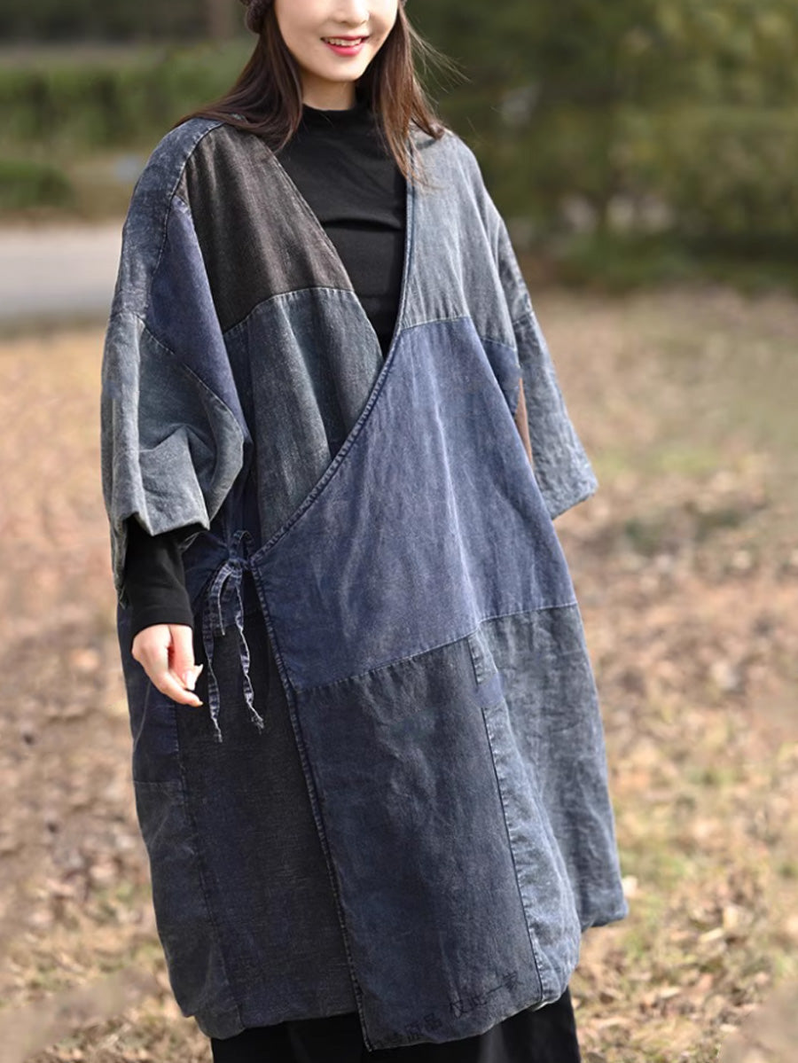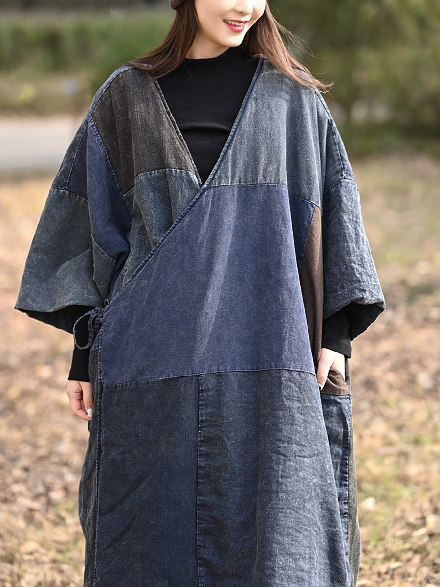Women Retro Colorblock Spliced Cotton V-Neck Padded Coat