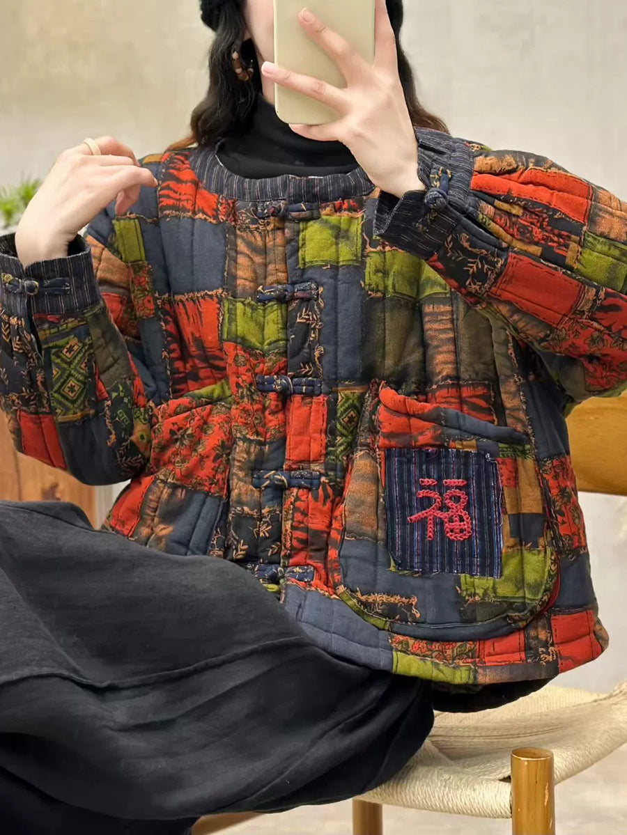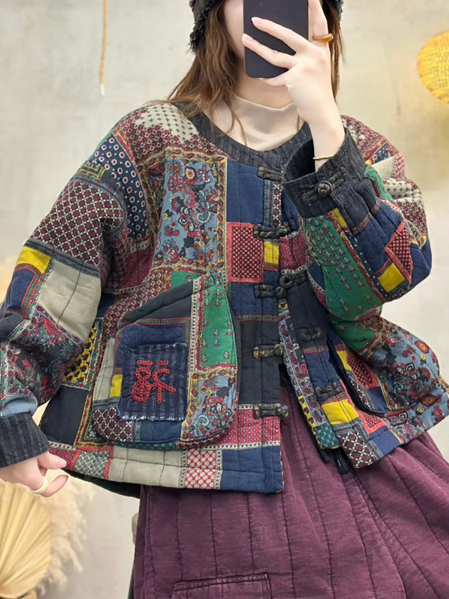 Women Winter Retro Patch Spliced O-Neck Padded Coat
