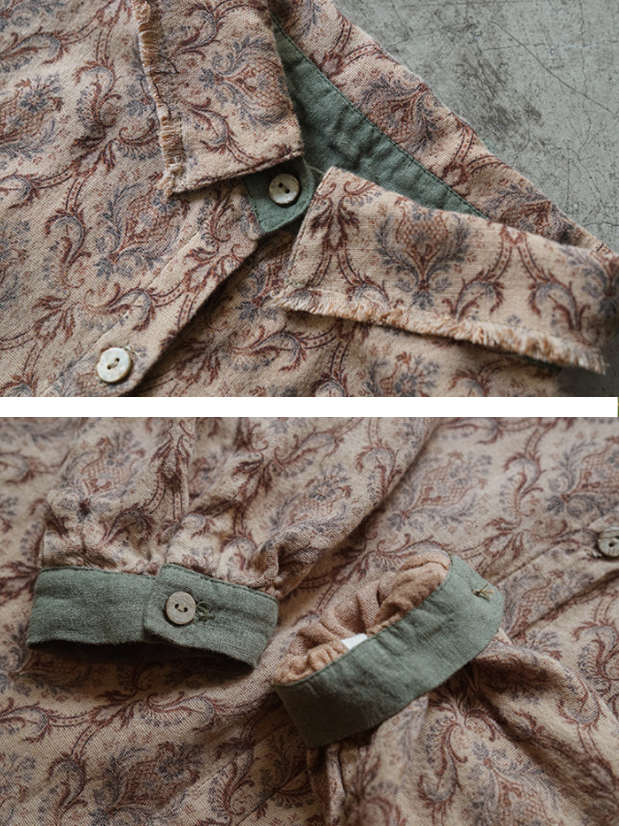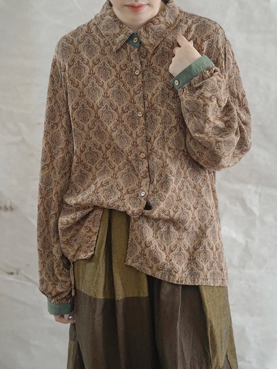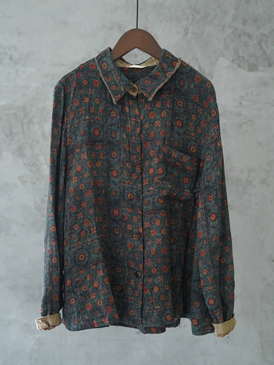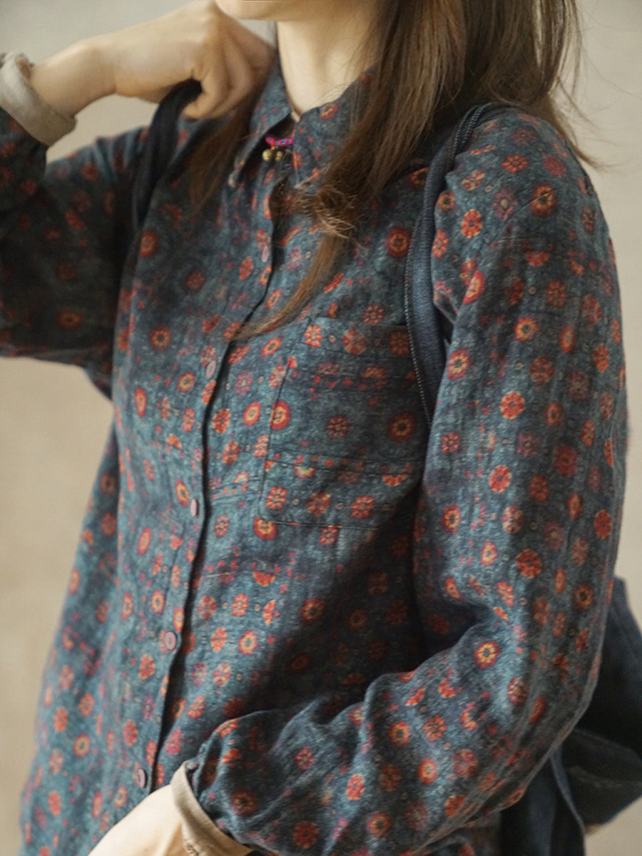 Women Artsy Spring Flower Turn-down Collar Cotton Shirt