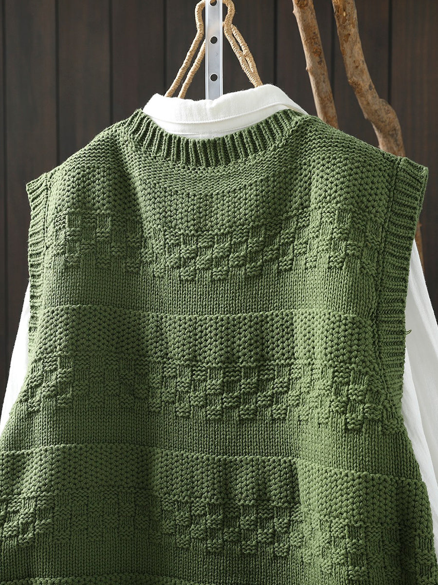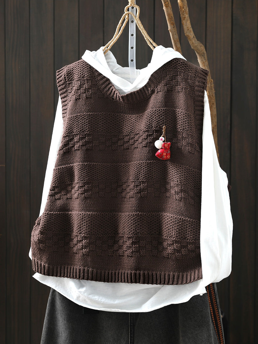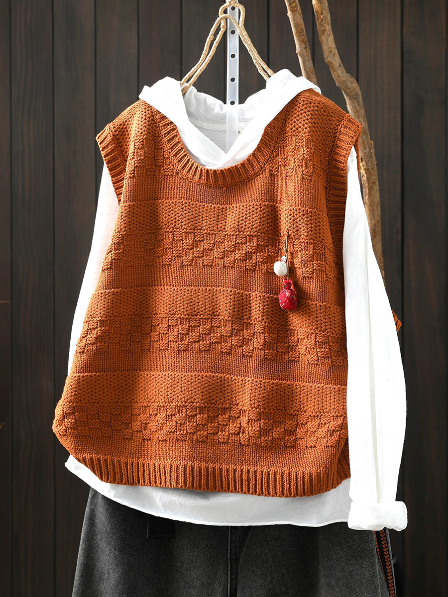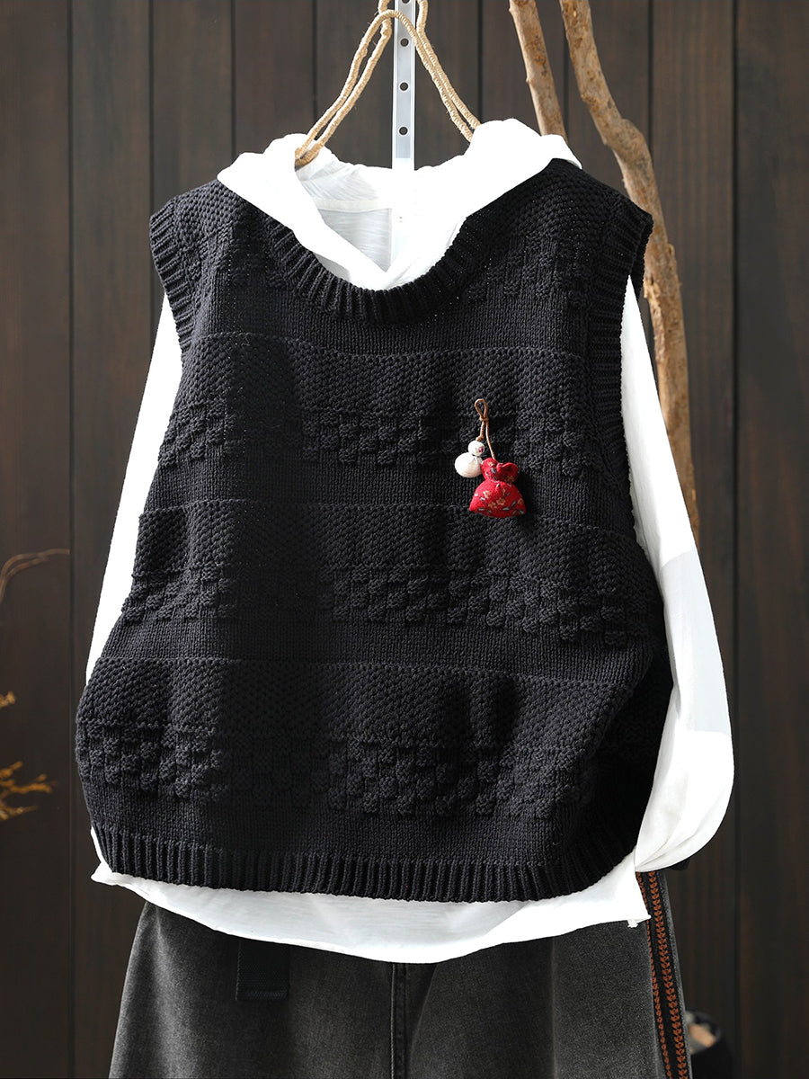 Crafted from a thoughtfully balanced blend of 55% acrylic and 45% cotton, this artsy knitted vest delivers both comfort and durability. The classic O-neck silhouette offers versatile styling options, while the pure color palette ensures effortless coordination with your existing wardrobe. Designed with an artistic sensibility, this piece transitions seamlessly through autumn and winter months, making it an essential layering staple for the discerning dresser.