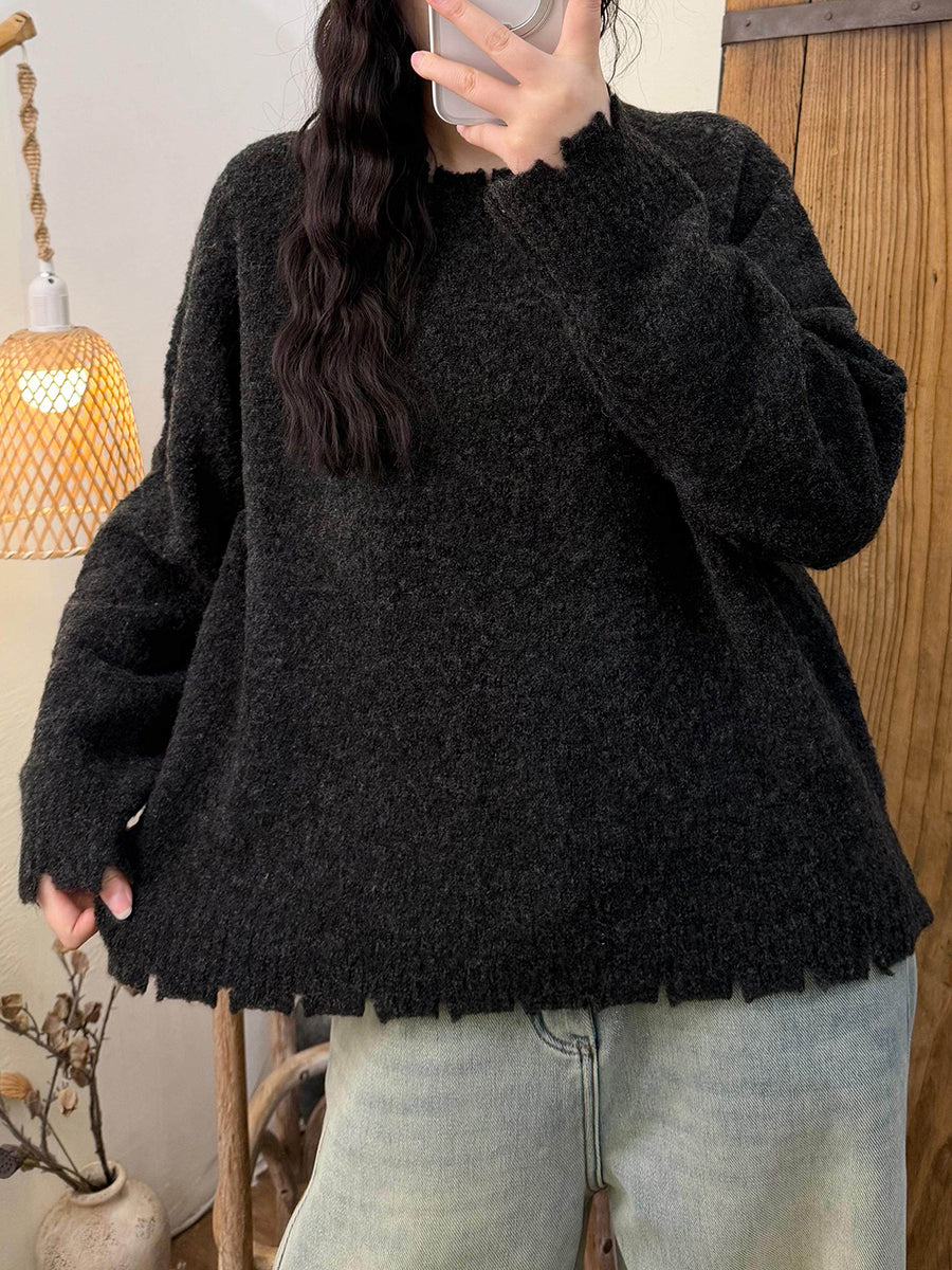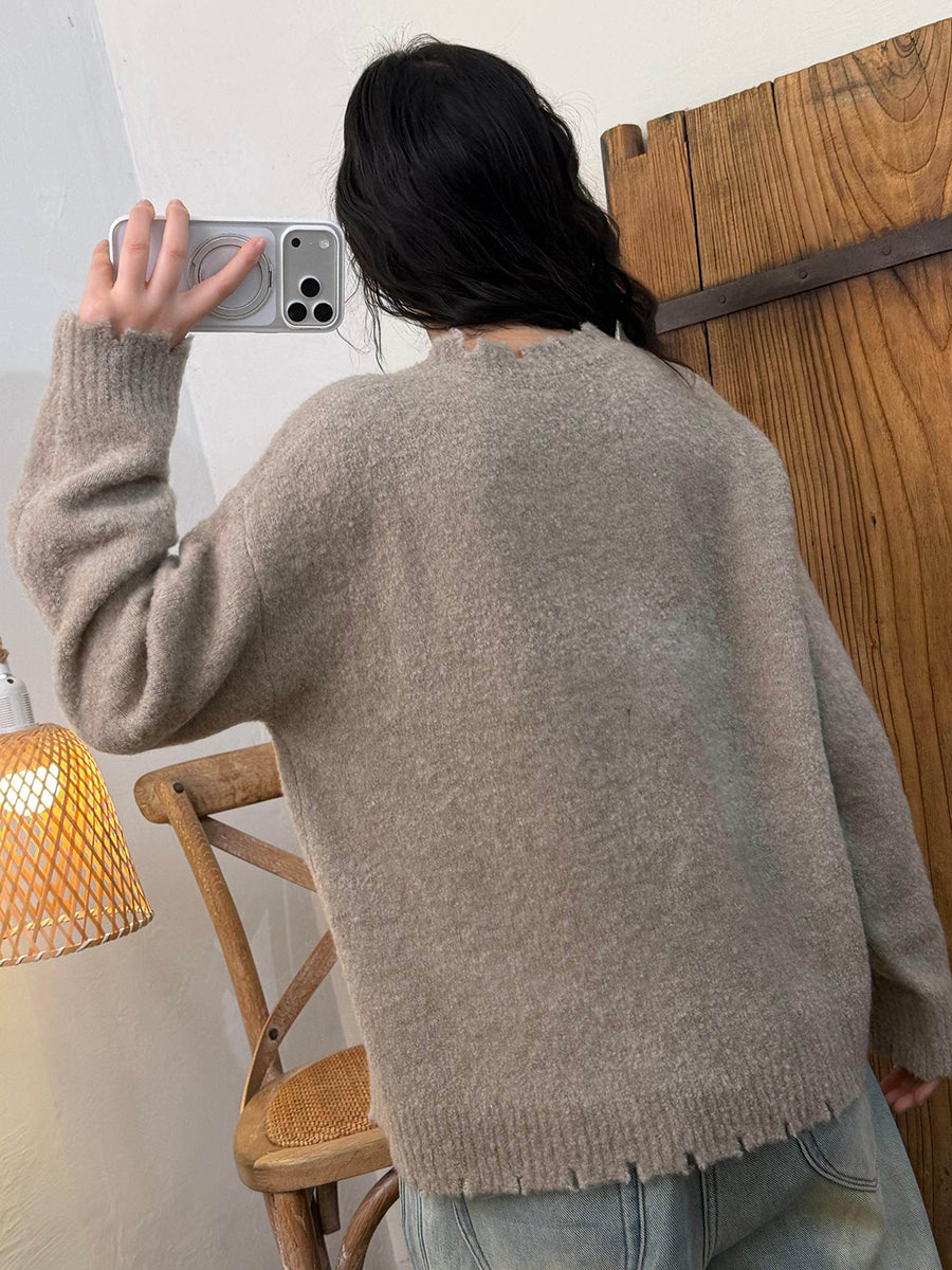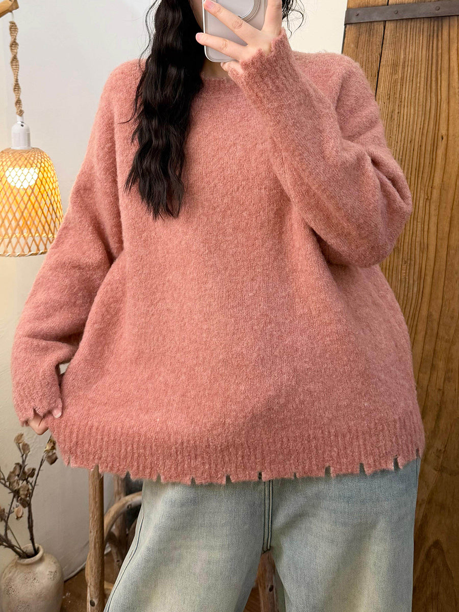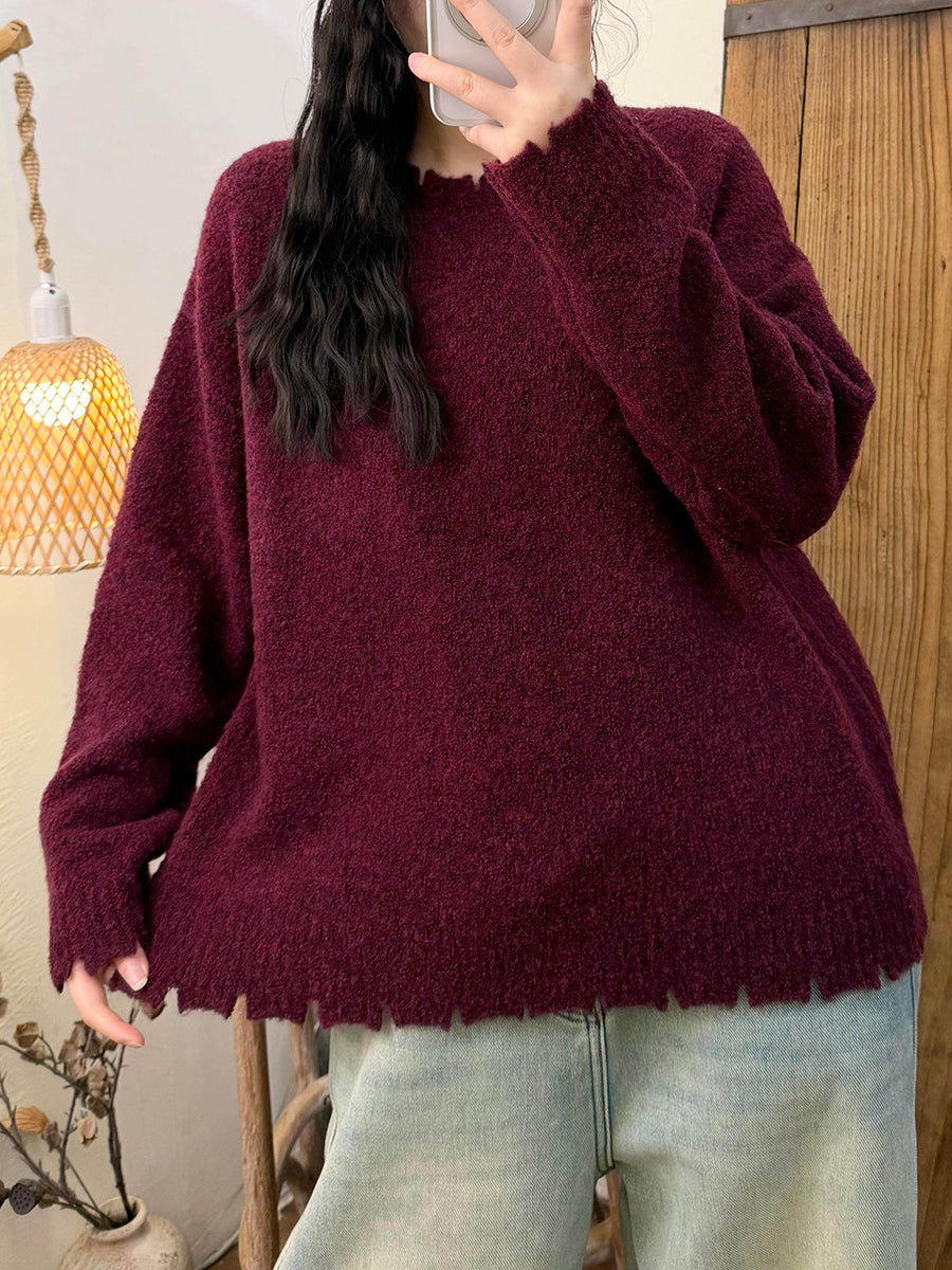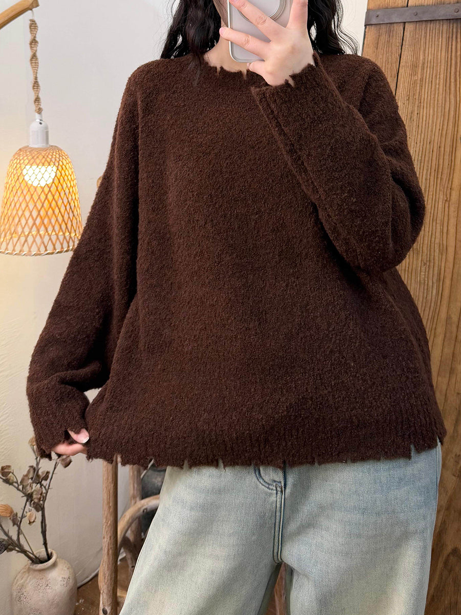 Women Winter Retro Pure Color O-Neck Sweater